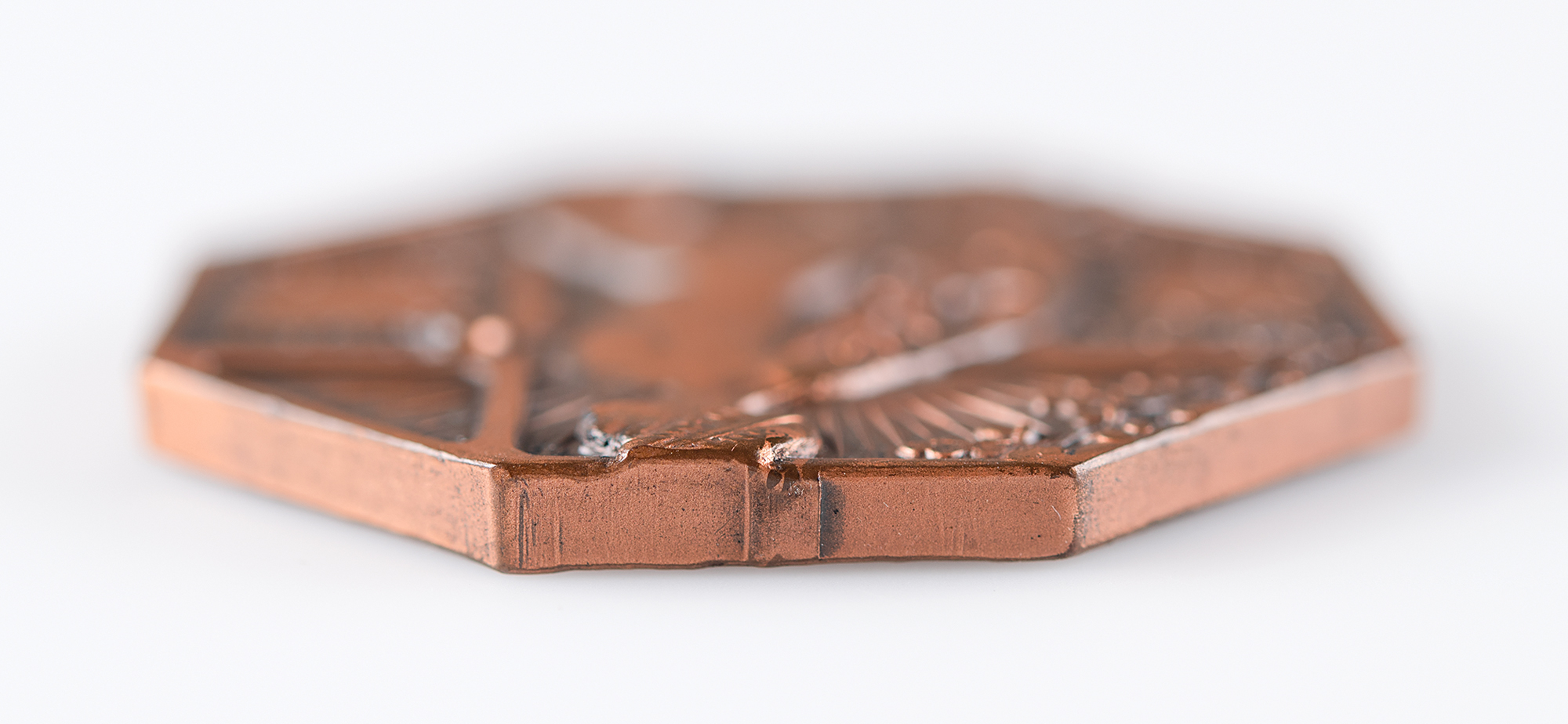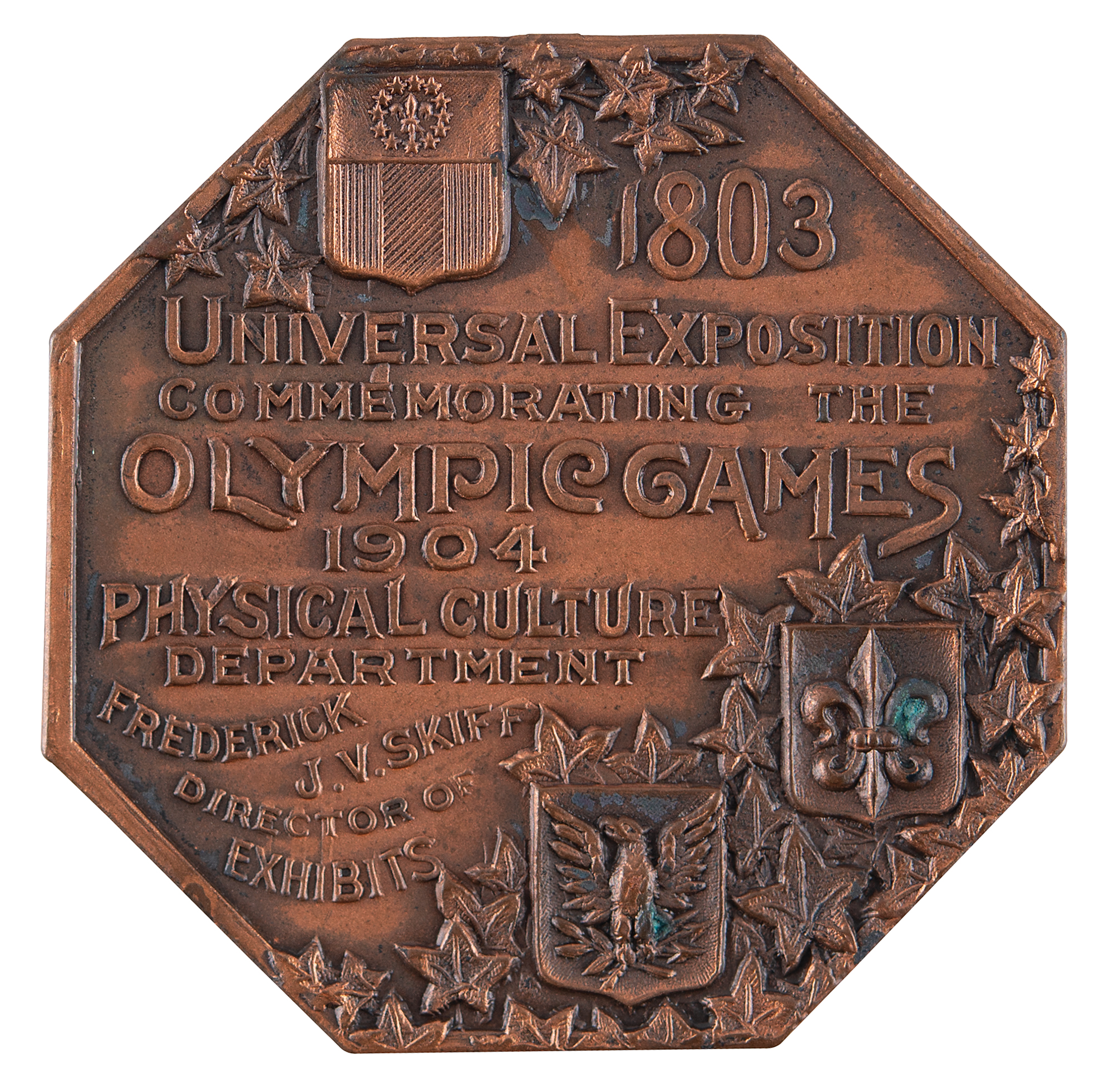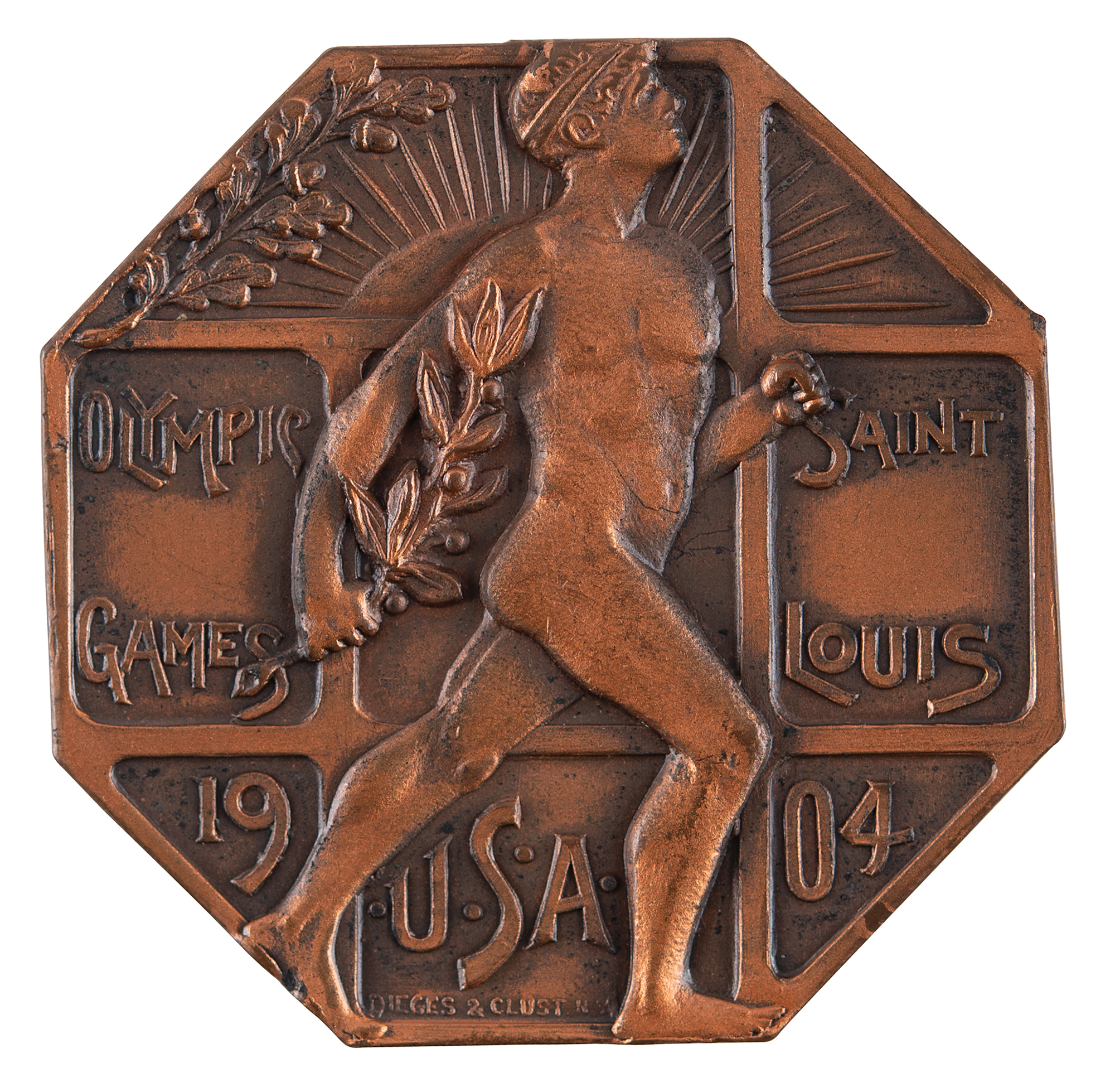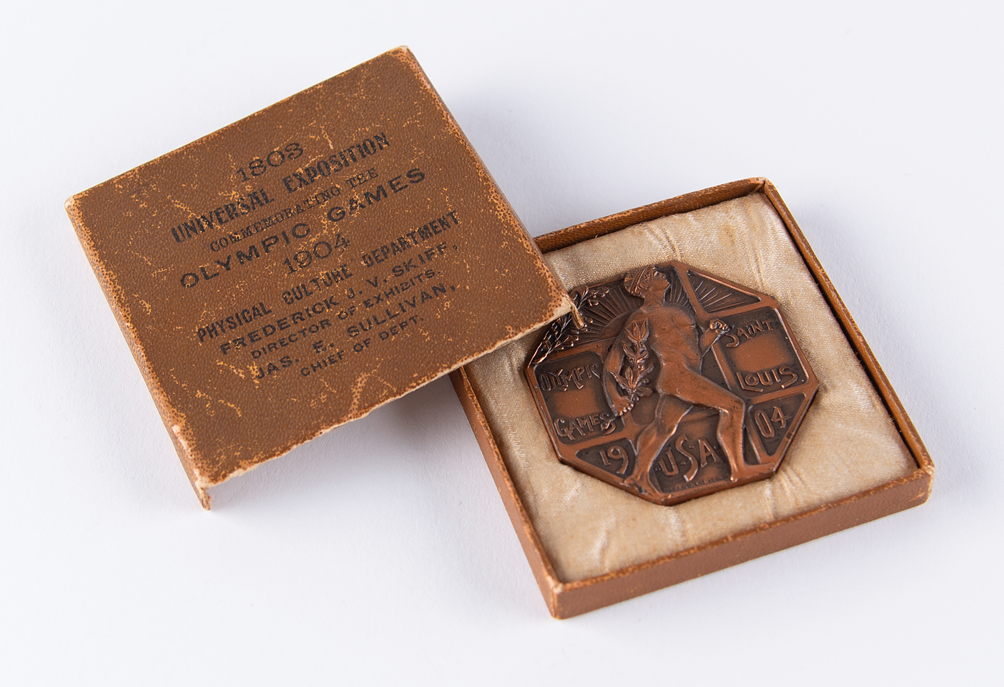 Extremely rare athlete’s participation medal issued for the St. Louis 1904 Olympics. Copper, 40 mm, 31 gm, by Dieges & Clust, New York. The front, inscribed, "Olympic Games, St. Louis, USA, 1904," features an idealized nude athlete mid-stride with a laurel branch in his hand; the reverse features the lengthy text, "1803, Universal Exposition Commemorating the Olympic Games, 1904, Physical Culture Department, Frederick J. V. Skiff, Director of Exhibits," encircled by ivy leaves with the shield emblems of St. Louis, France, and USA. This particular medal is without an upper loop and bears an entirely plain edge, traits indicative of medals presented to participating athletes. It is housed in its original cardboard box, imprinted on the lid: "1803 Universal Exposition, Commemorating the Olympic Games, 1904, Physical Culture Department, Frederick J. V. Skiff, Director of Exhibits, Jas. E. Sullivan, Chief of Staff." The inner lid is imprinted with the address of the maker, Dieges & Clust. The medal is in superior condition, while the box exhibits some rubbing and one side panel missing from the lid. St. Louis 1904 is the rarest and most coveted of all Olympic participation medals, and even rarer when paired with its original box—this is the first example of the box that we have encountered.