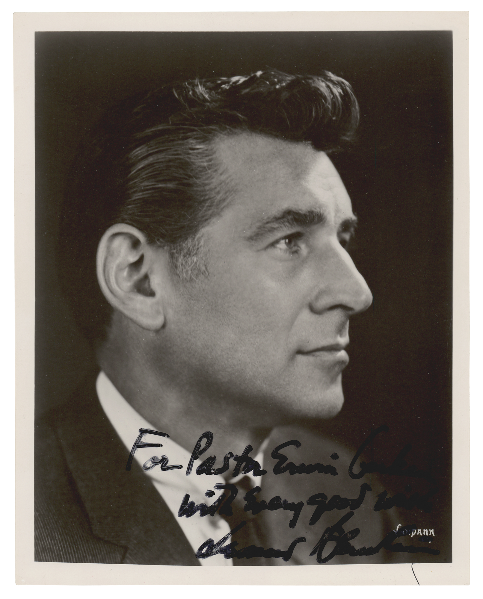 Glossy 8 x 10 photo of composer Leonard Bernstein in a side profile, signed and inscribed in black felt tip, "For Pastor Erwin Gerkin, with every good wish, Leonard Bernstein.” In fine condition.