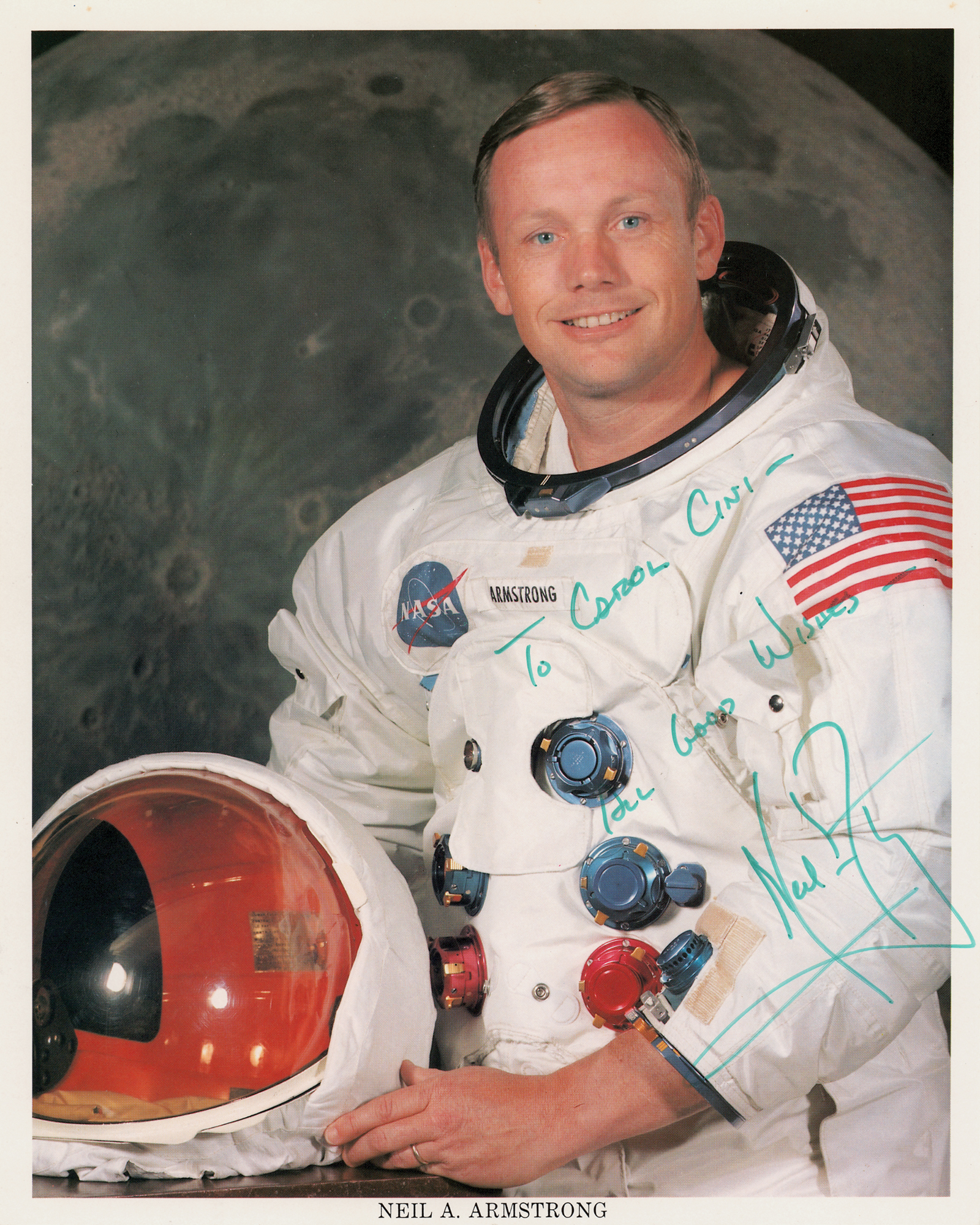 Official color 8 x 10 NASA lithograph of the first moonwalker posing in his white space suit against a lunar backdrop, signed and inscribed in green felt tip, "To Carol Cini —All Good Wishes, Neil Armstrong.” In fine condition, with a couple of small creases, and a faint bend to the upper portion.