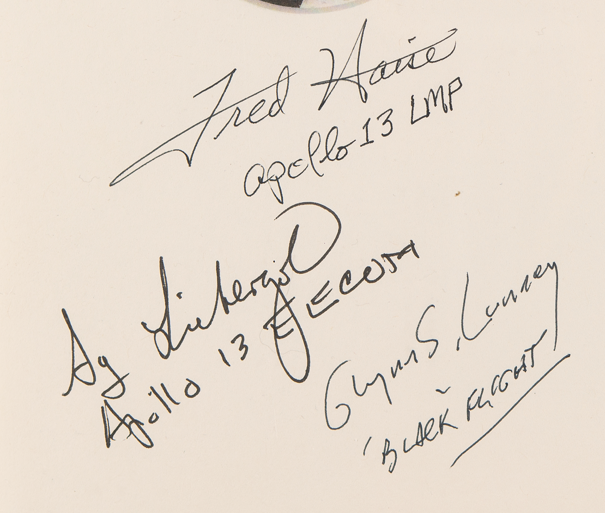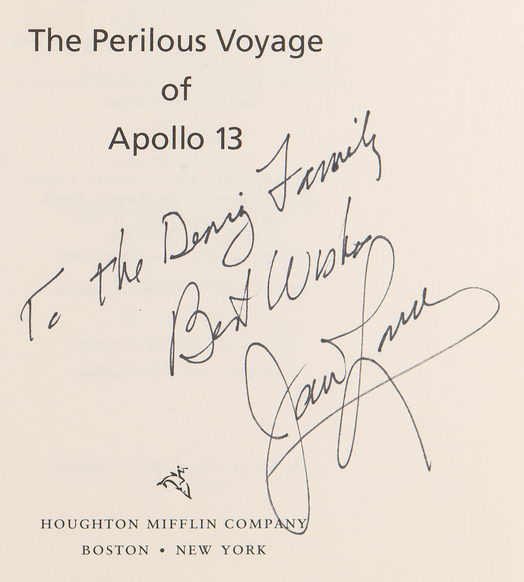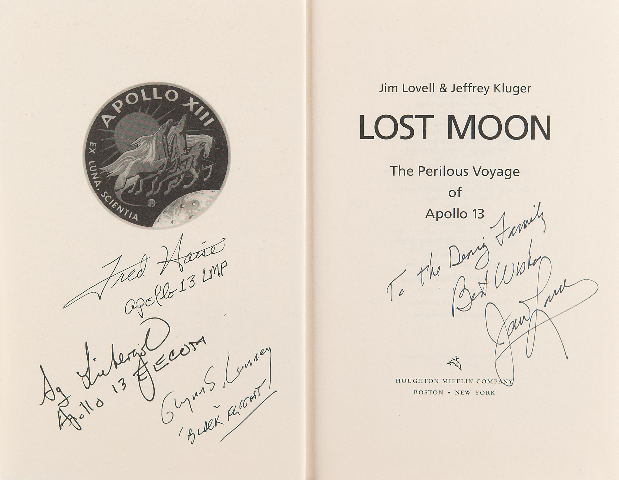 Signed book: Lost Moon: The Perilous Voyage of Apollo 13. Later printing. Boston: Houghton Mifflin, 1994. Hardcover with dust jacket, 6.25 x 9.25, 378 pages. Signed and inscribed on the title page and facing page in black felt tip, "To the Denig family, Best wishes, James Lovell," "Fred Haise, Apollo 13 LMP," "Sy Liebergot, Apollo 13 EECOM," and "Glynn S. Lunney, 'Black' Flight." In fine condition.