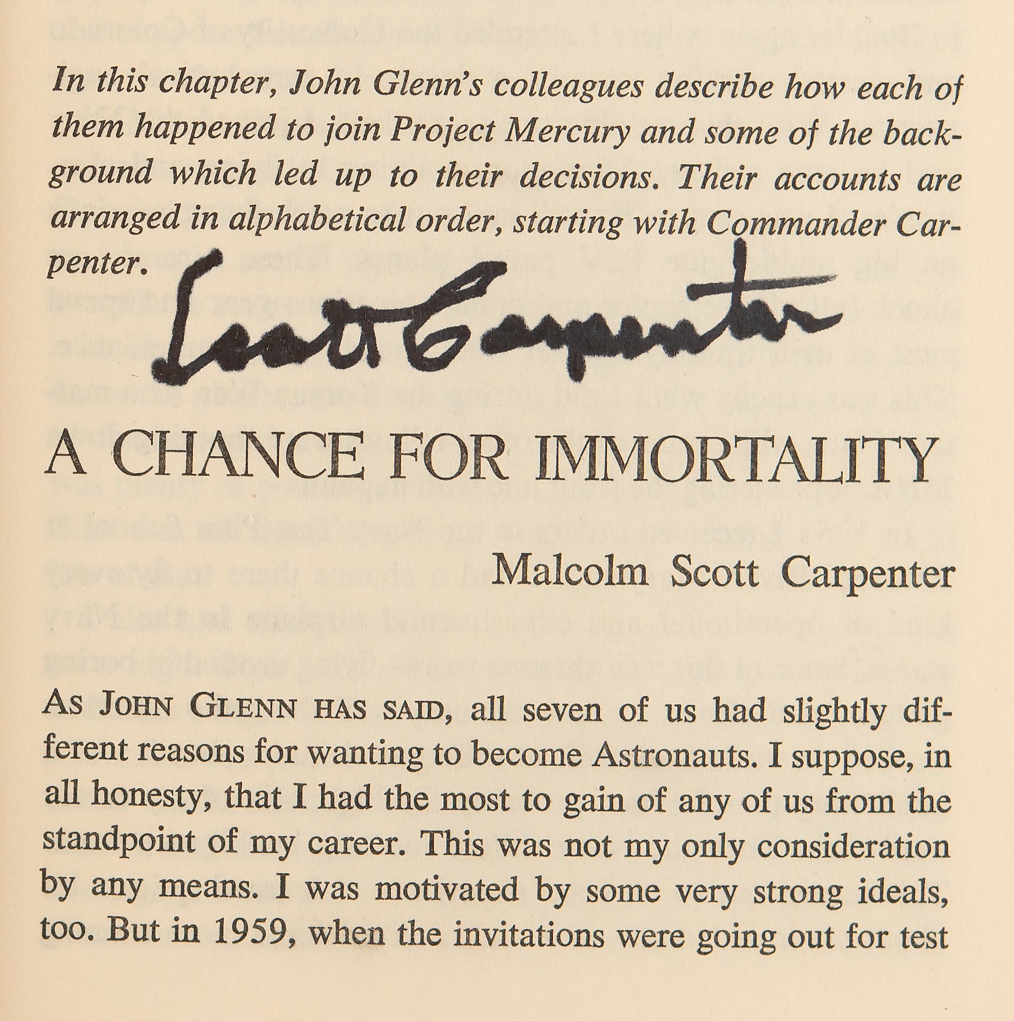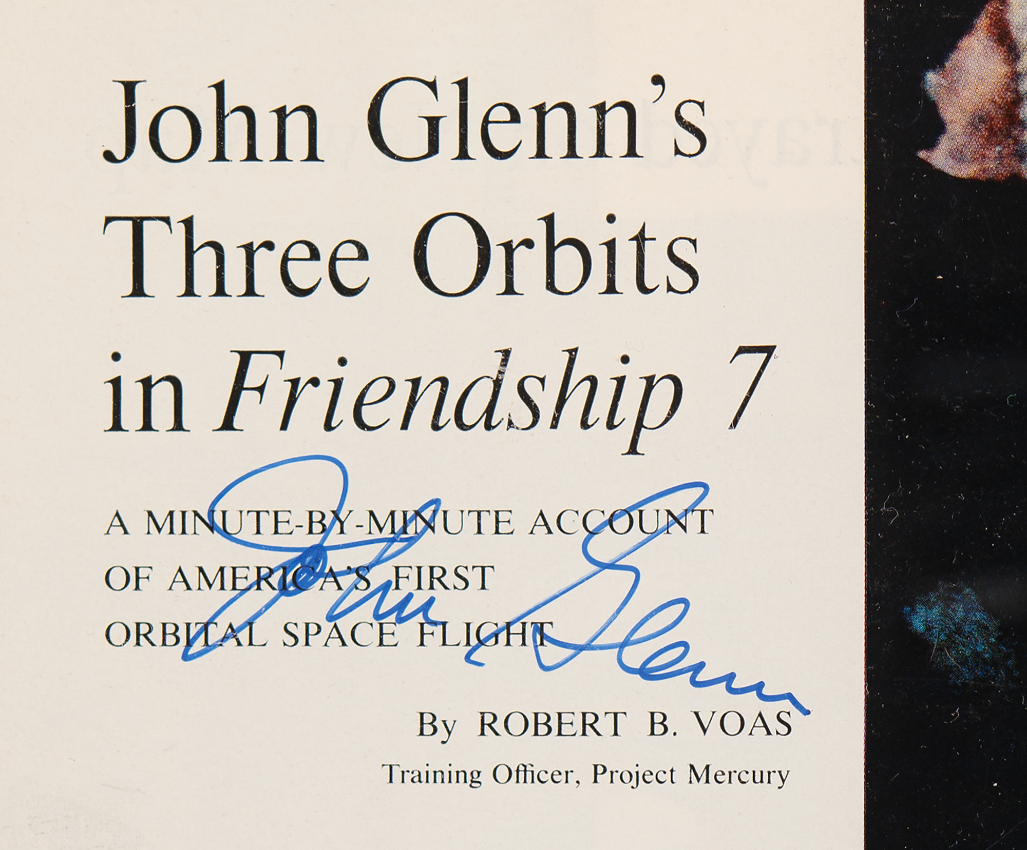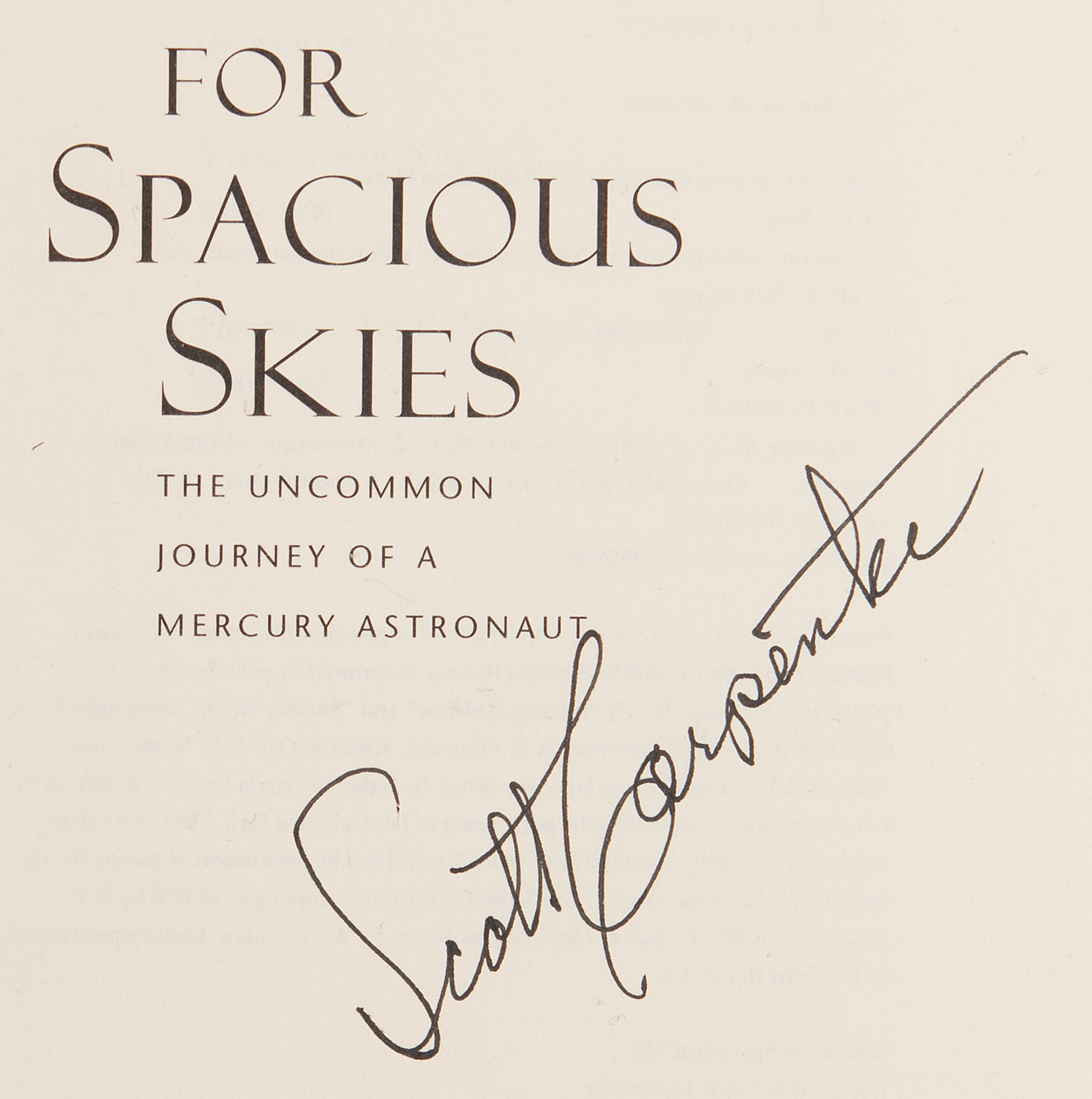 Group of five items signed by Mercury astronauts, including four hardcover books plus an issue of National Geographic. Signers and titles are: John Glenn (National Geographic, June 1962), John Glenn and Scott Carpenter (We Seven), Scott Carpenter (For Spacious Skies), Wally Schirra (Schirra's Space), and Gordon Cooper (Leap of Faith). In overall very good to fine condition.