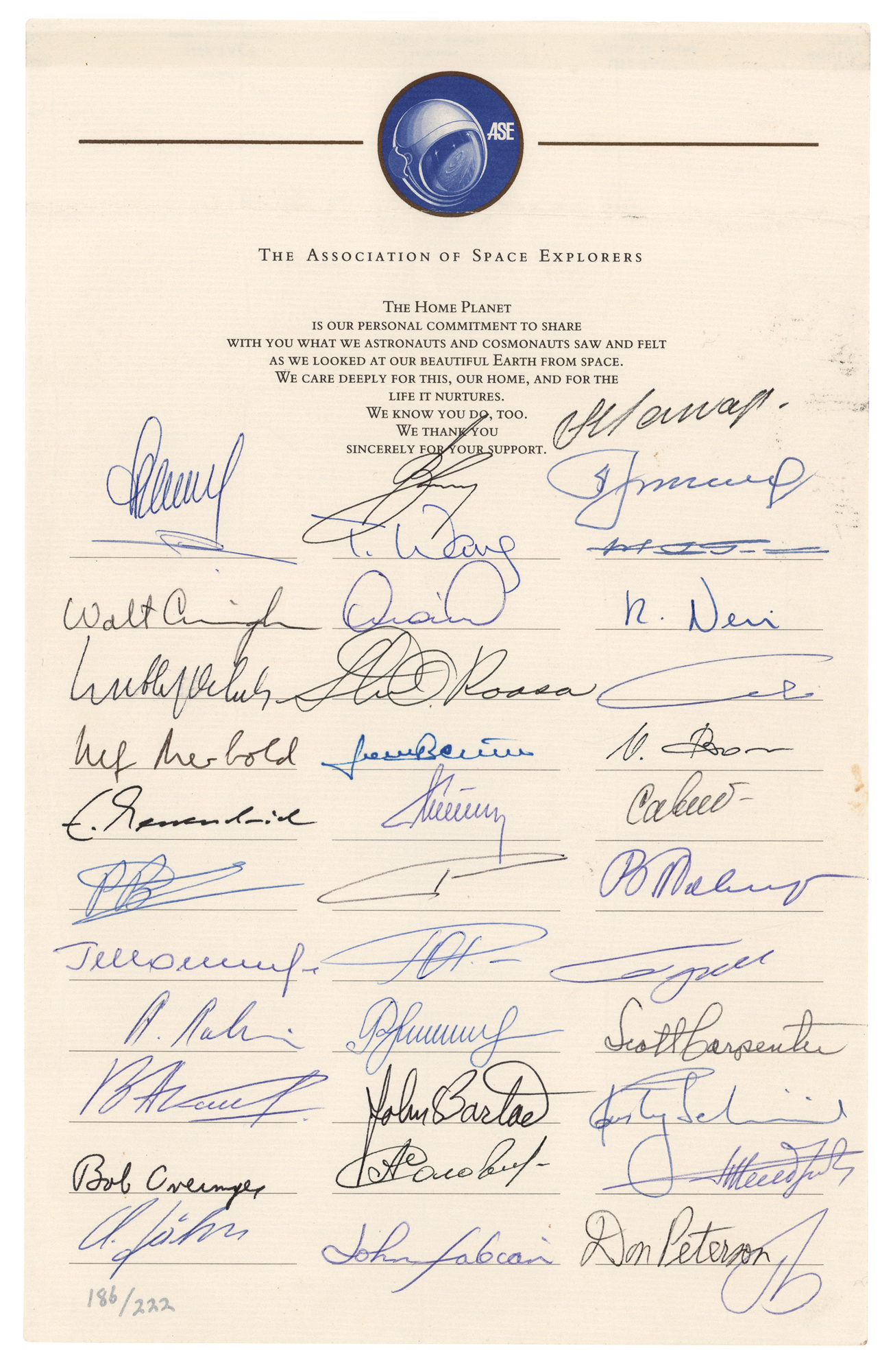 Uncommon limited edition 8 x 12.5 bookplate from The Association of Space Explorers, issued for the special first edition of The Home Planet, published by the Addison-Wesley Publishing Company in 1988. The bookplate is signed in various ink types by 38 astronauts and cosmonauts present at the fourth Planetary Congress, held in Sofia, Bulgaria on October 5, 1988.