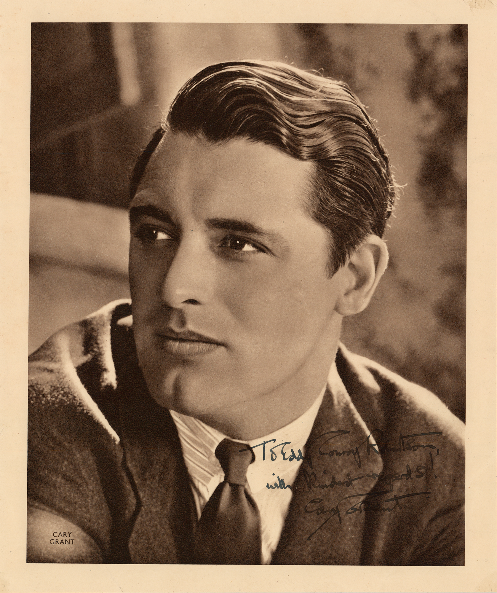 Uncommon vintage 9.5 x 11.5 paperstock promotional photo of Cary Grant in a handsome early pose, signed and inscribed in black ink, "To Eddy Conroy Robertson, with kindest regards! Cary Grant.” In very fine condition.