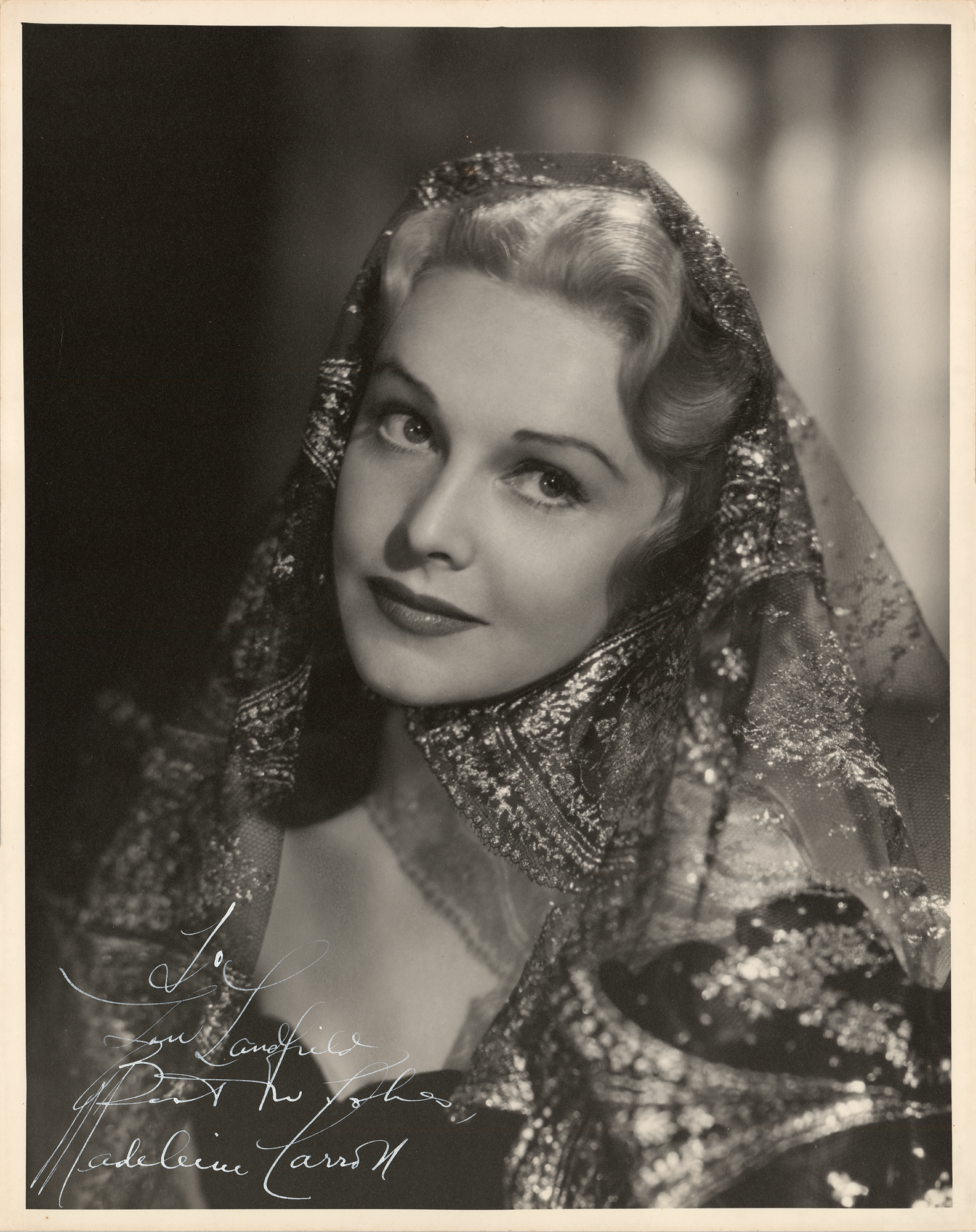 Vintage matte-finish 11 x 14 photo of the popular English actress wearing an ornate scarf, signed and inscribed in white ink, "To Lou Landfield, Best wishes, Madeleine Carroll.” In fine to very fine condition.