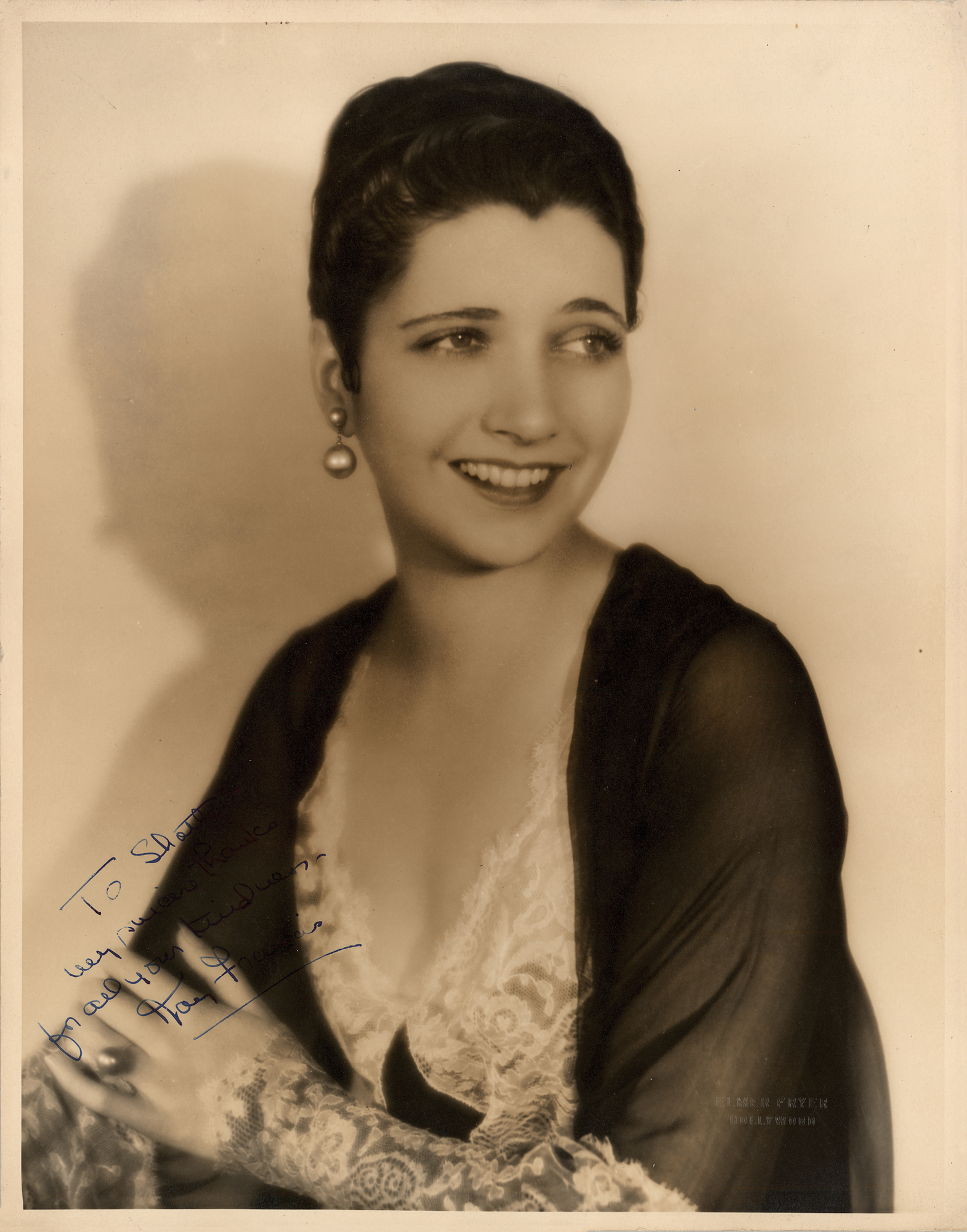 American stage and film actress (1905–1968) who achieved her greatest success between 1930 and 1936, when she was the number one female star at the Warner Brothers studio and the highest-paid American film actress. Lovely vintage matte-finish 11 x 14 portrait photo of Kay Francis by the Elmer Fryer Studio of Hollywood, signed and inscribed in fountain pen, "To Dotty, my sincere thanks for all your kindness – Kay Francis.” The lower right bears the Fryer studio blindstamp. In very fine condition.
