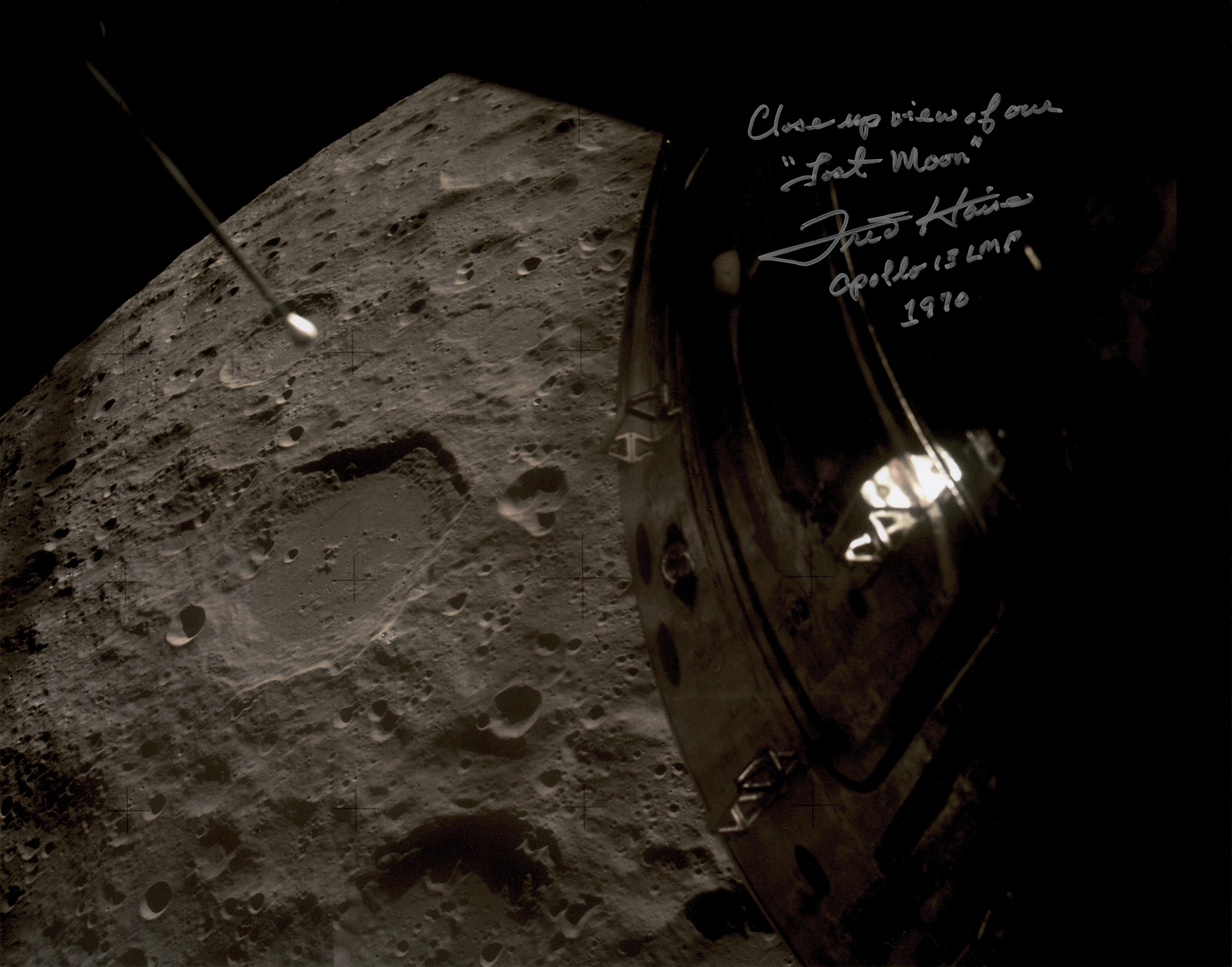 Color satin-finish 14 x 11 close-up photo of the cratered lunar surface, signed in silver ink, "Close up view of our 'Lost Moon,’ Fred Haise, Apollo 13 LMP, 1970." In very good to fine condition, with a horizontal crease running across the bottom.