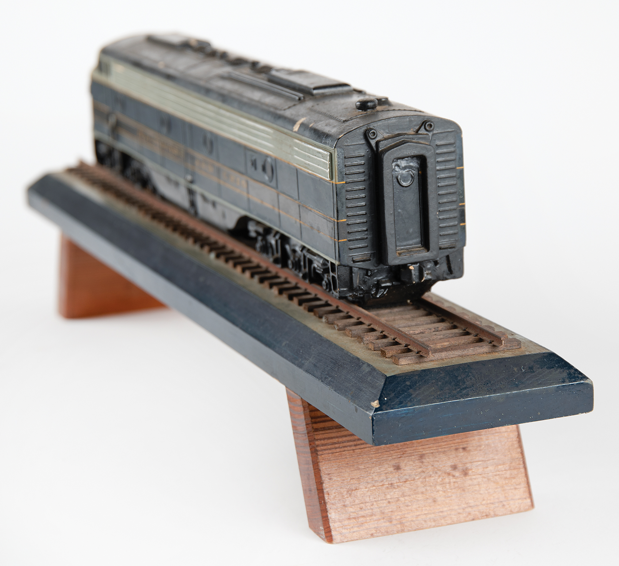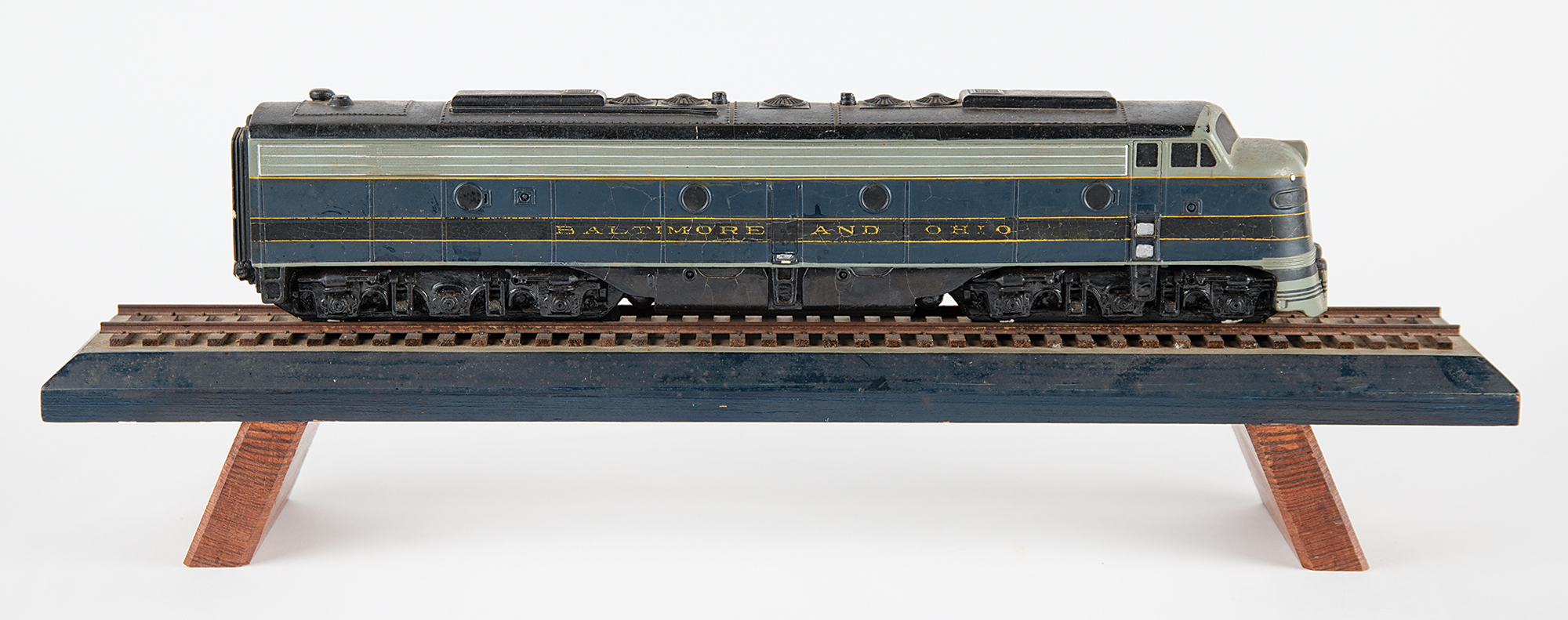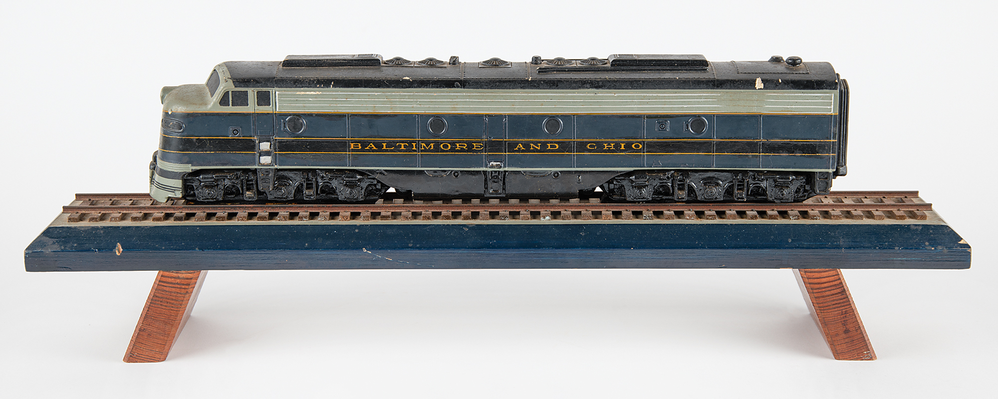 Impressive ‘toy train’ replica of the funeral train for former American President Dwight D. Eisenhower. The hand-painted replica of the ‘Baltimore and Ohio’ train engine measures 17.5″ x 4″ x 2.5″ and is set atop a wooden base with an attached section of railway tracks that measures 23″ x 3.5″ x 4″. In fine condition, with some cracking and chips to the paint.