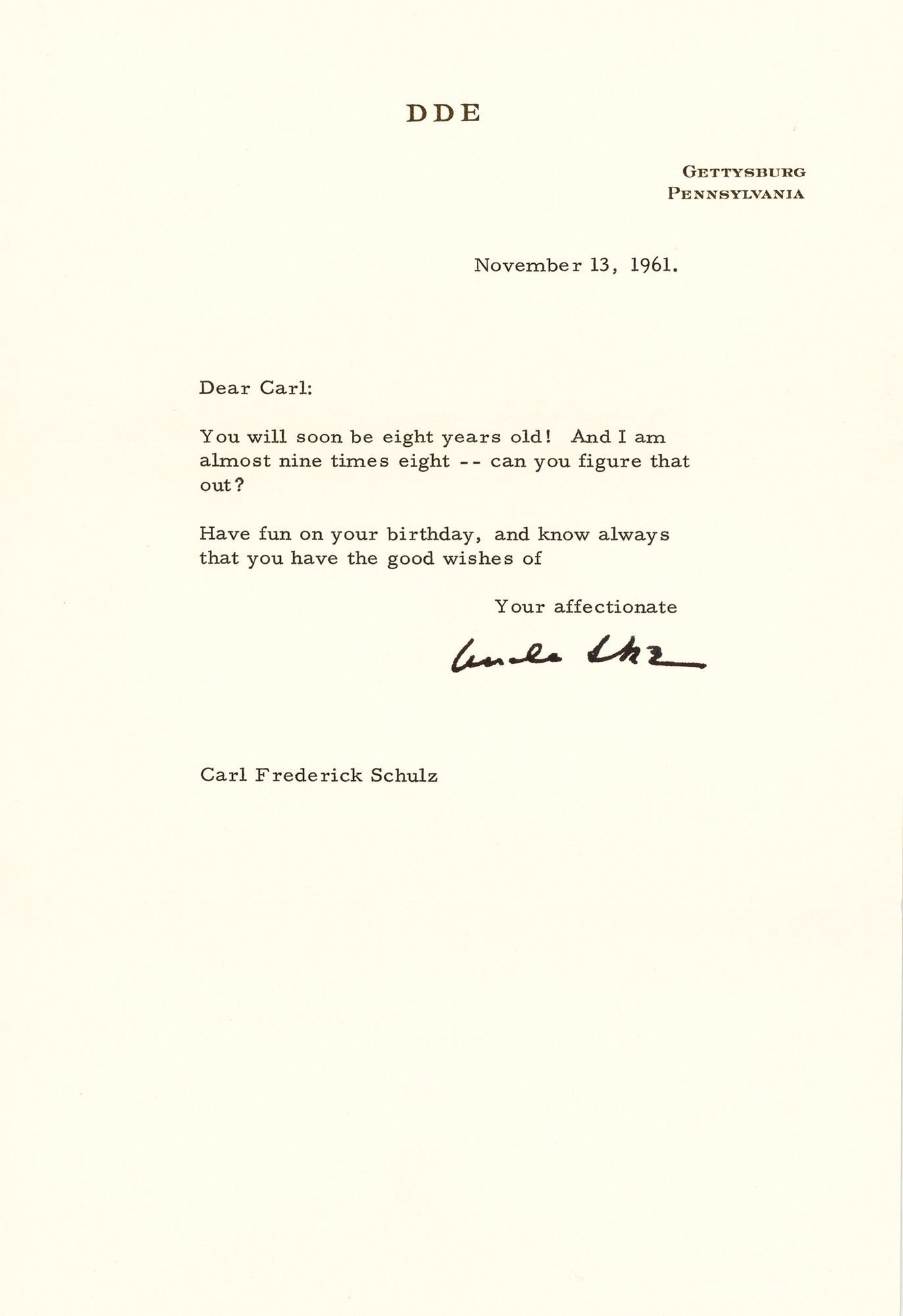 TLS signed “Uncle Ike,” one page, 7 x 10.25, personal 'DDE' letterhead, November 13, 1961. Letter to Carl Schulz, the son of Brig. General Robert L. Schulz, the longtime aide to Dwight D. Eisenhower, in full: “You will soon be eight years old! And I am almost nine times eight — can you figure that out? Have fun on your birthday, and know always that you have the good wishes of, Your affectionate, Uncle Ike.” In very fine condition. Accompanied by the original mailing envelope bearing stamped free frank signature.