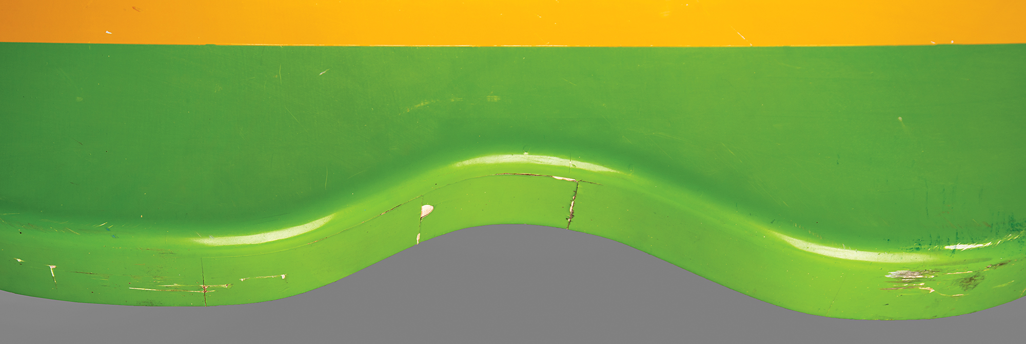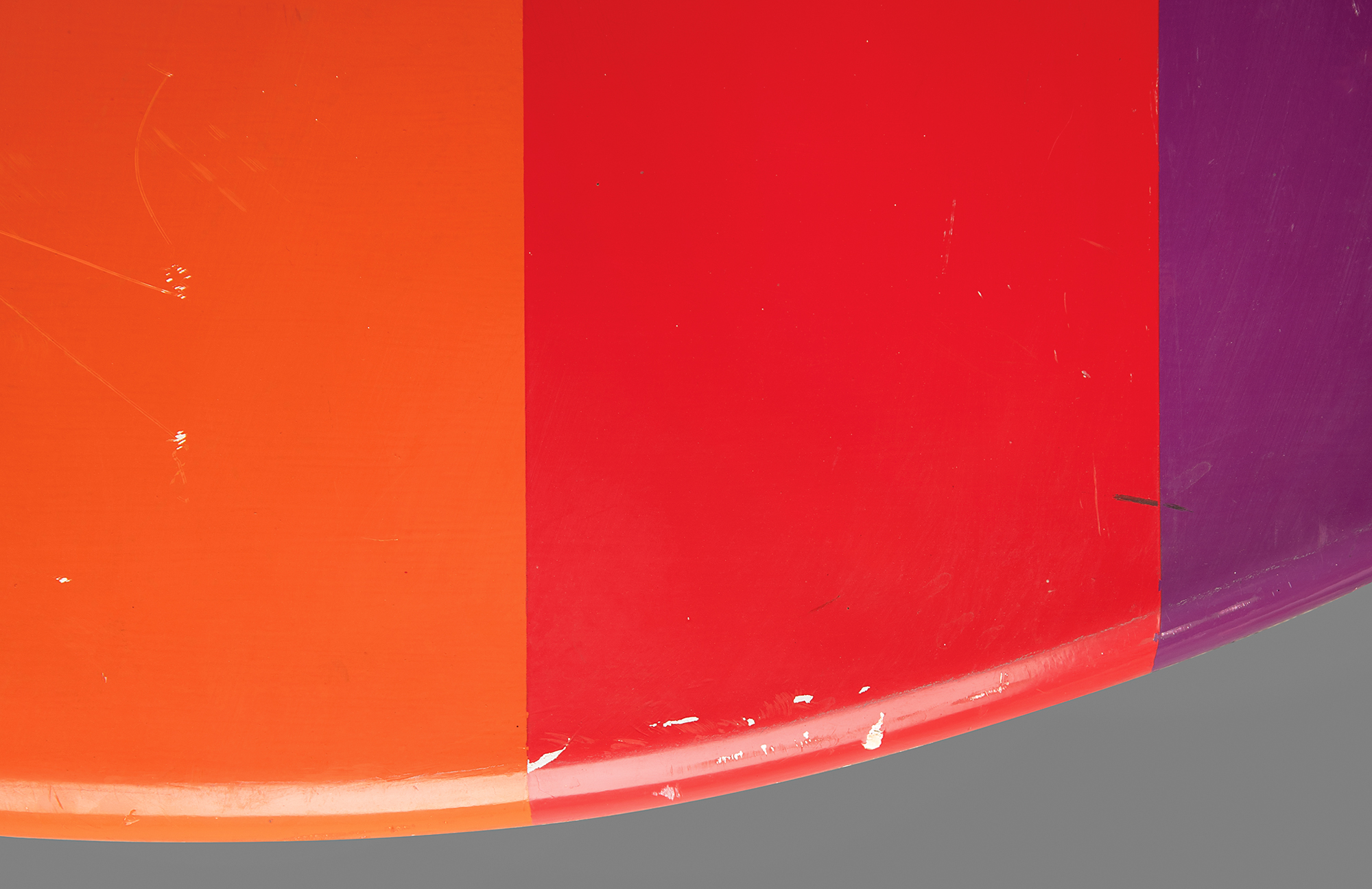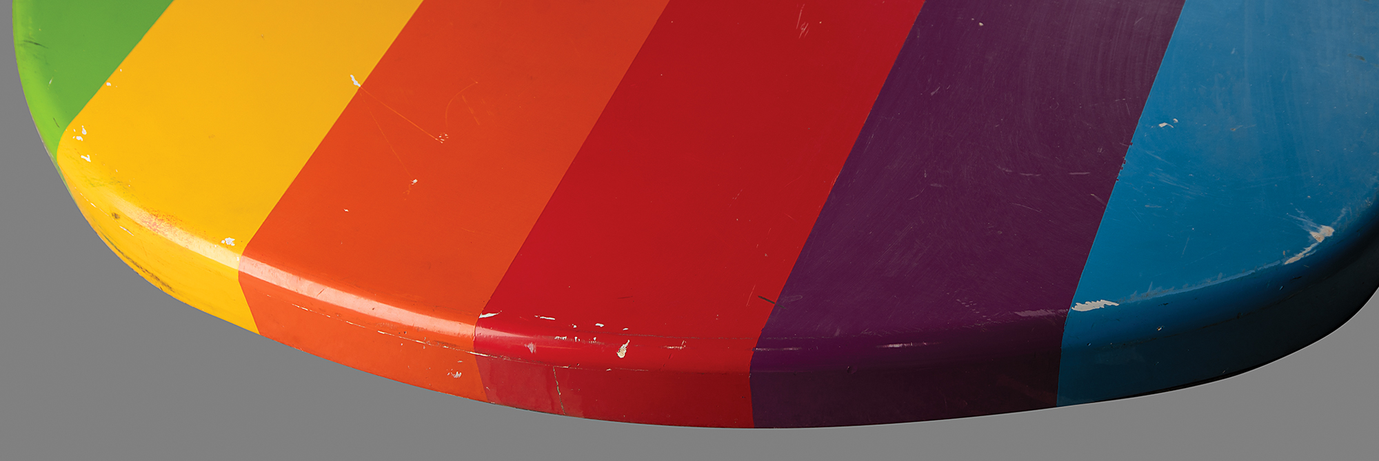 Huge Apple Computer, Inc. ‘rainbow logo’ display that hung above the main reception desk at Apple’s high-tech Macintosh manufacturing factory at 48233 Warm Springs Boulevard in Fremont, California. The hand-painted wooden logo approximately measures 44˝ x 51˝ x 3˝, which includes the ‘floating’ green upper leaf section. Although it’s uncertain when this display was first hung in the Fremont offices — the facility opened in January 1984 — the display was taken down from its wall when the plant was moved closer to its distribution center in Elk Grove, California, in 1992. In fine condition, with scattered scuffs and marks, and some chipping to the paint, the majority occur along the rounded edges.