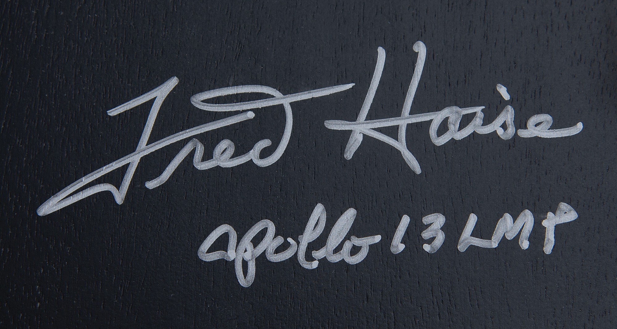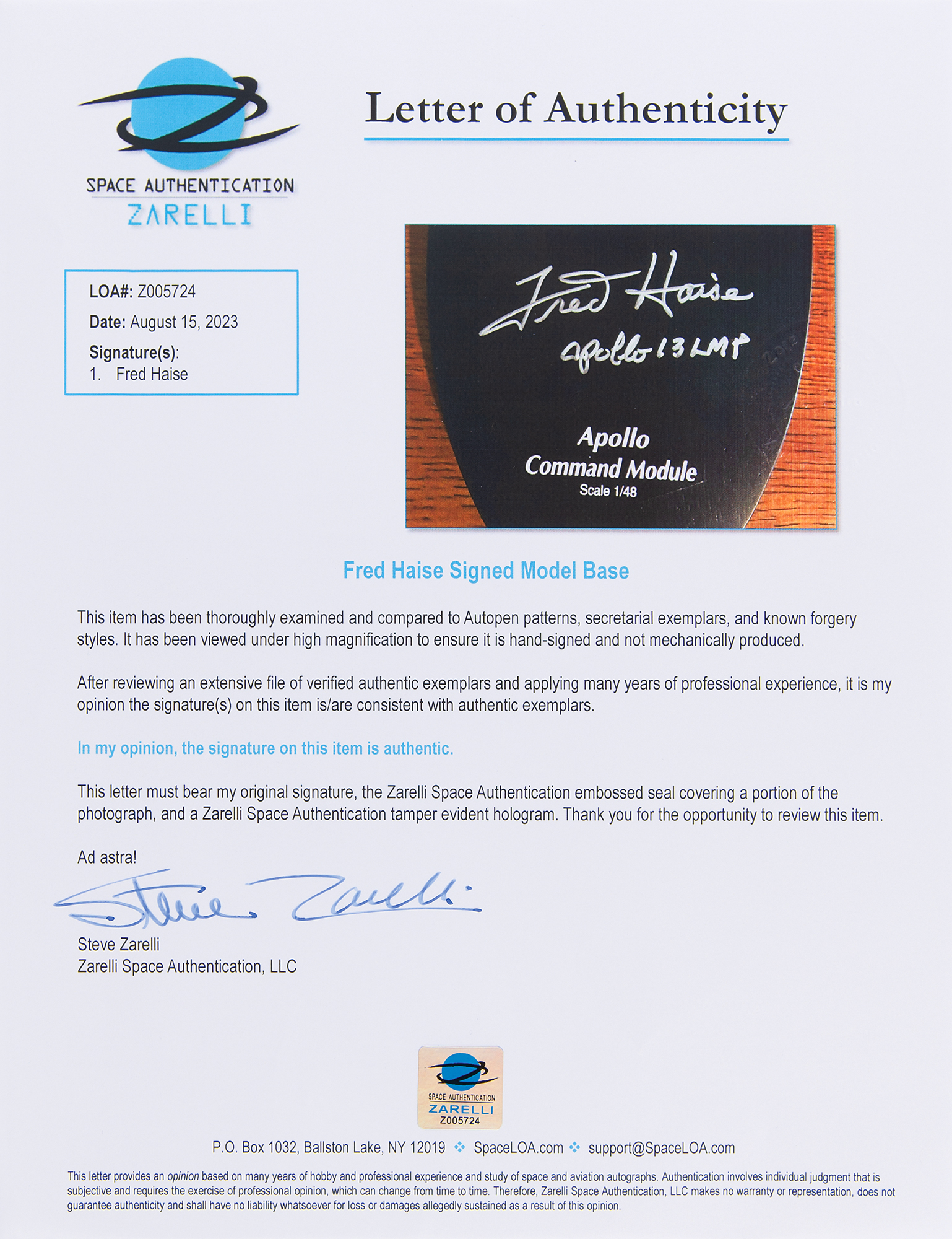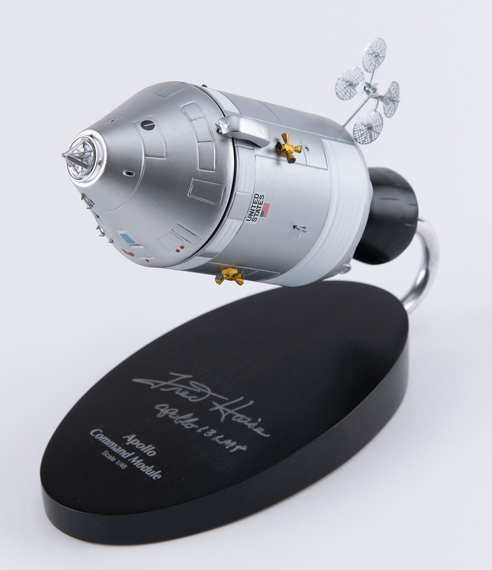 Appealing 1:48 scale model of the Apollo Command Module issued as part of the 'Executive Series' by Daron, measuring approximately 8.5˝ long and displayed over a 8.25˝ x 4.5˝ x 1.25˝ wooden base, signed on the base in silver ink, "Fred Haise, Apollo 13 LMP." In fine condition. Accompanied by the original box and a full letter of authenticity from Zarelli Space Authentication.
