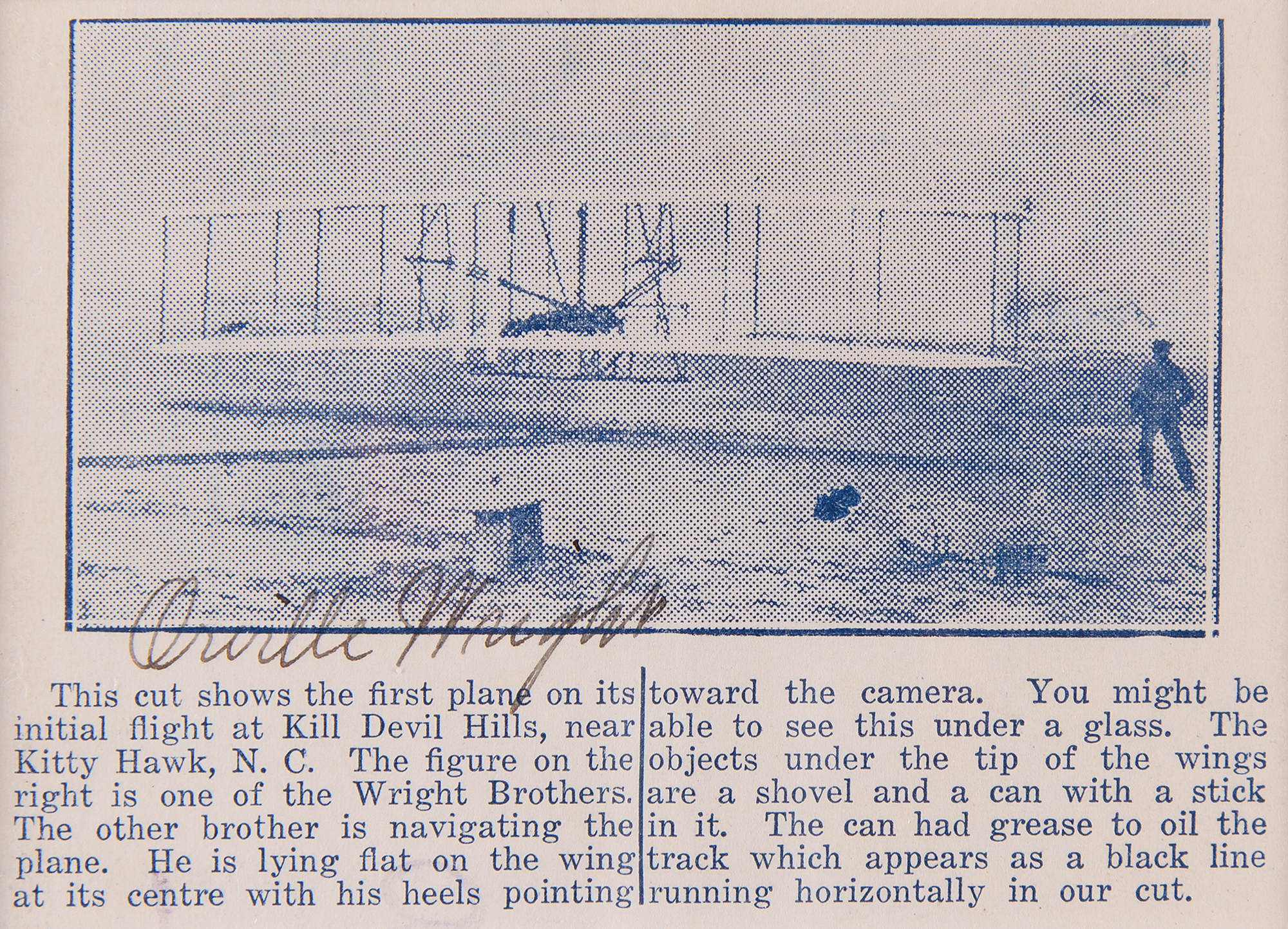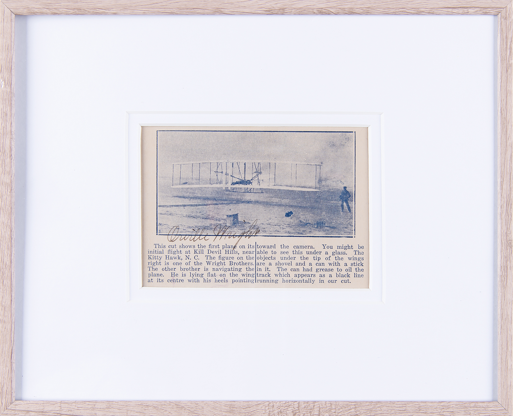 Attractive 4.5 x 3.25 book photo of the Wright Brothers’ first flight above an information caption, signed nicely in fountain pen by Orville Wright, who is shown watching his brother pilot the aircraft. The caption reads, in part: “This cut shows the first plane on its initial flight at Kill Devil Hills, near Kitty Hawk, N. C.” Double-matted and framed to an overall size of 10.25 x 8.25. In fine condition. A desirable display piece boasting a clean signature of the famed aviation pioneer.