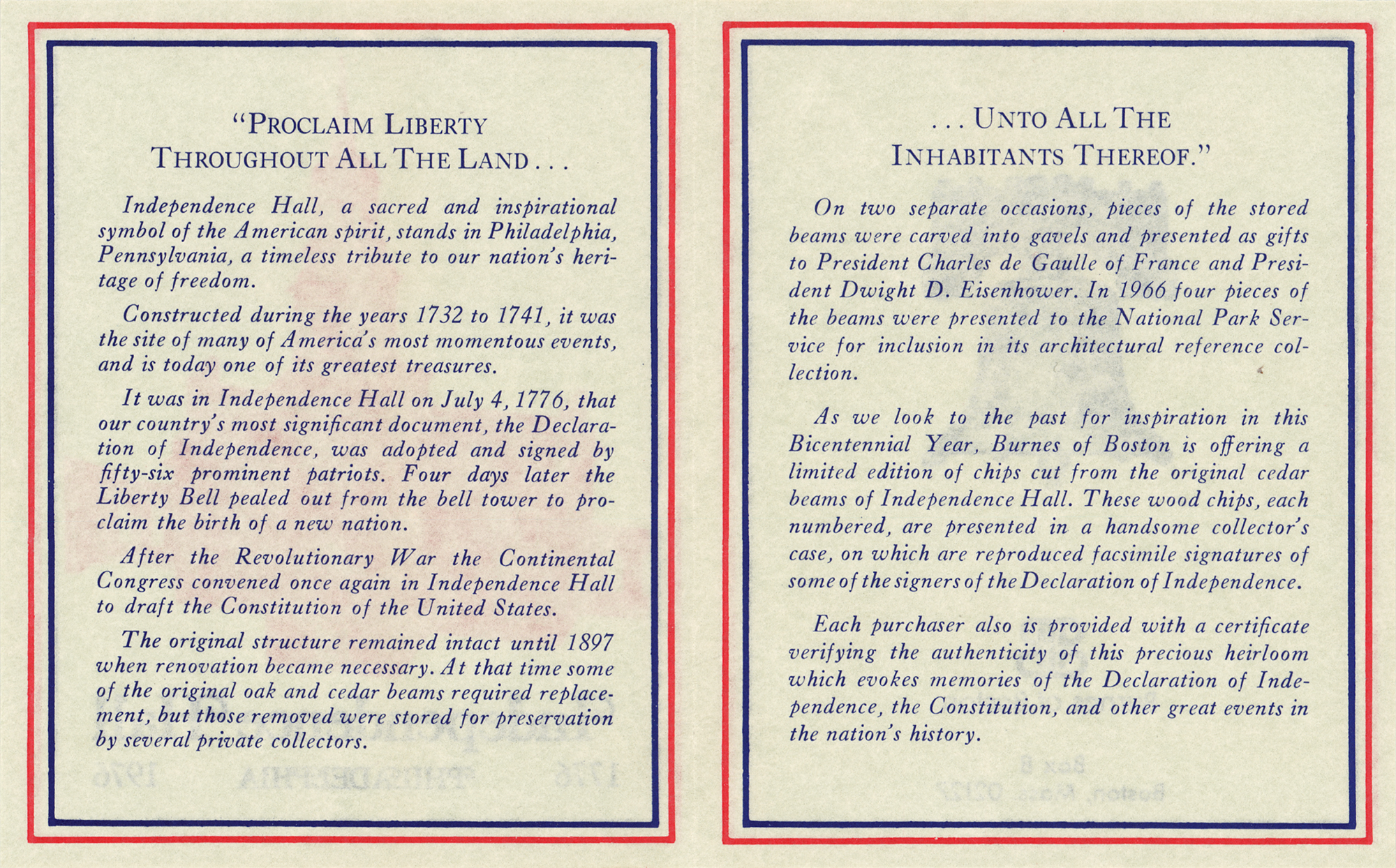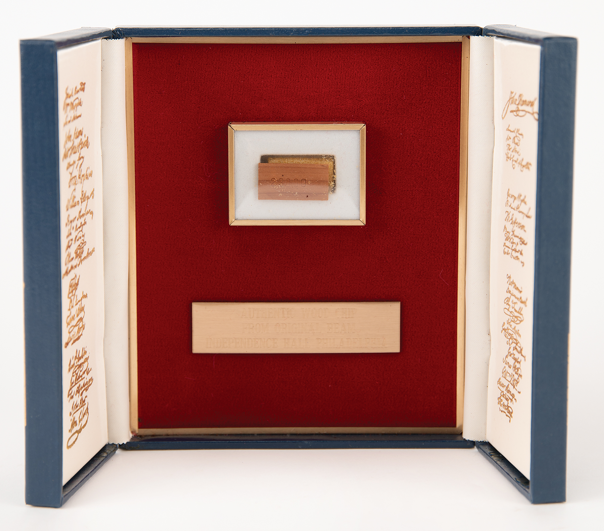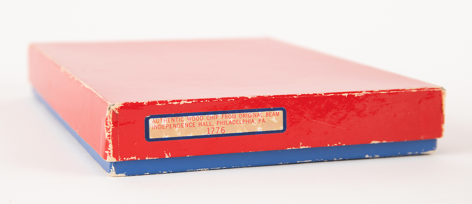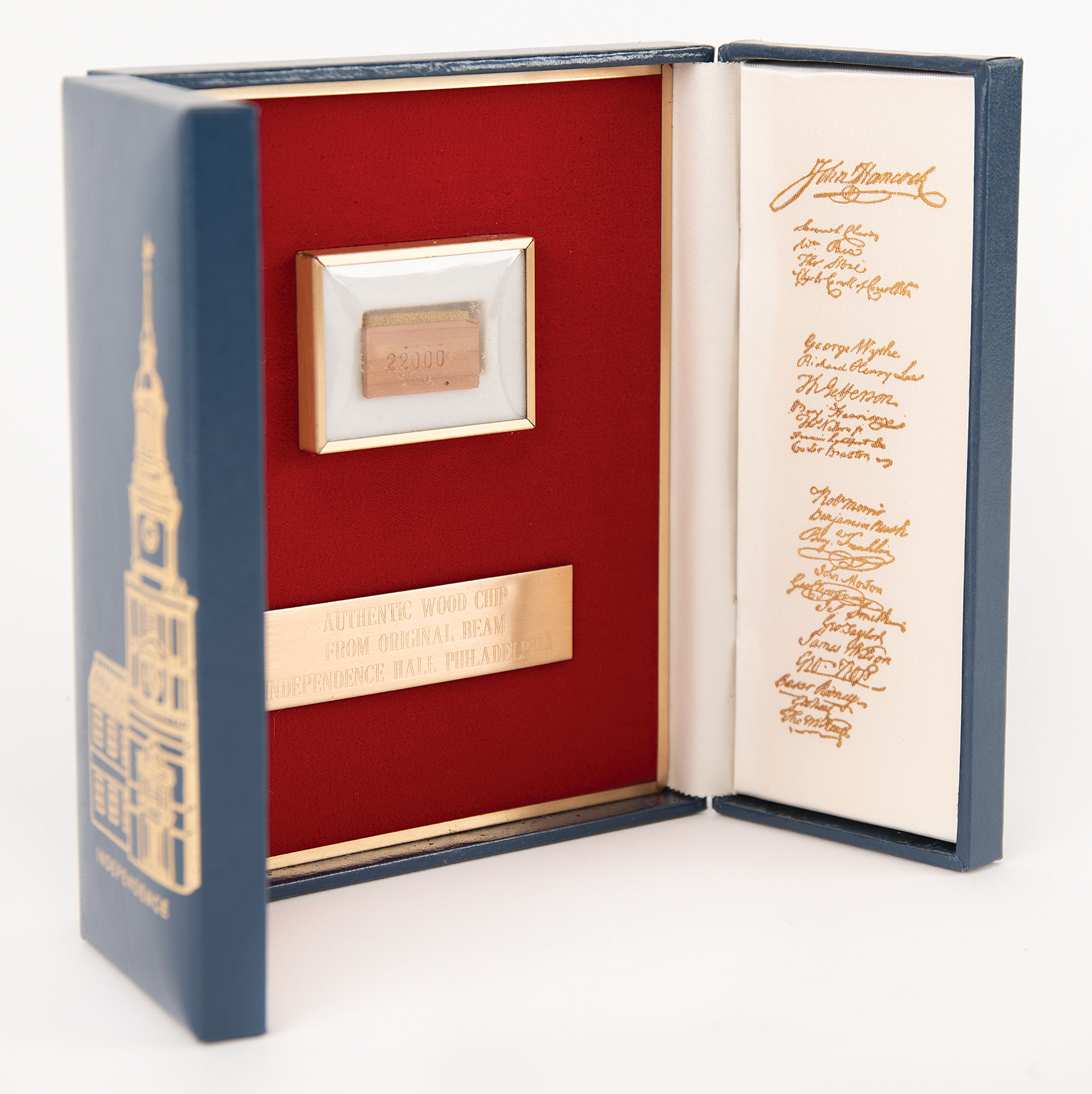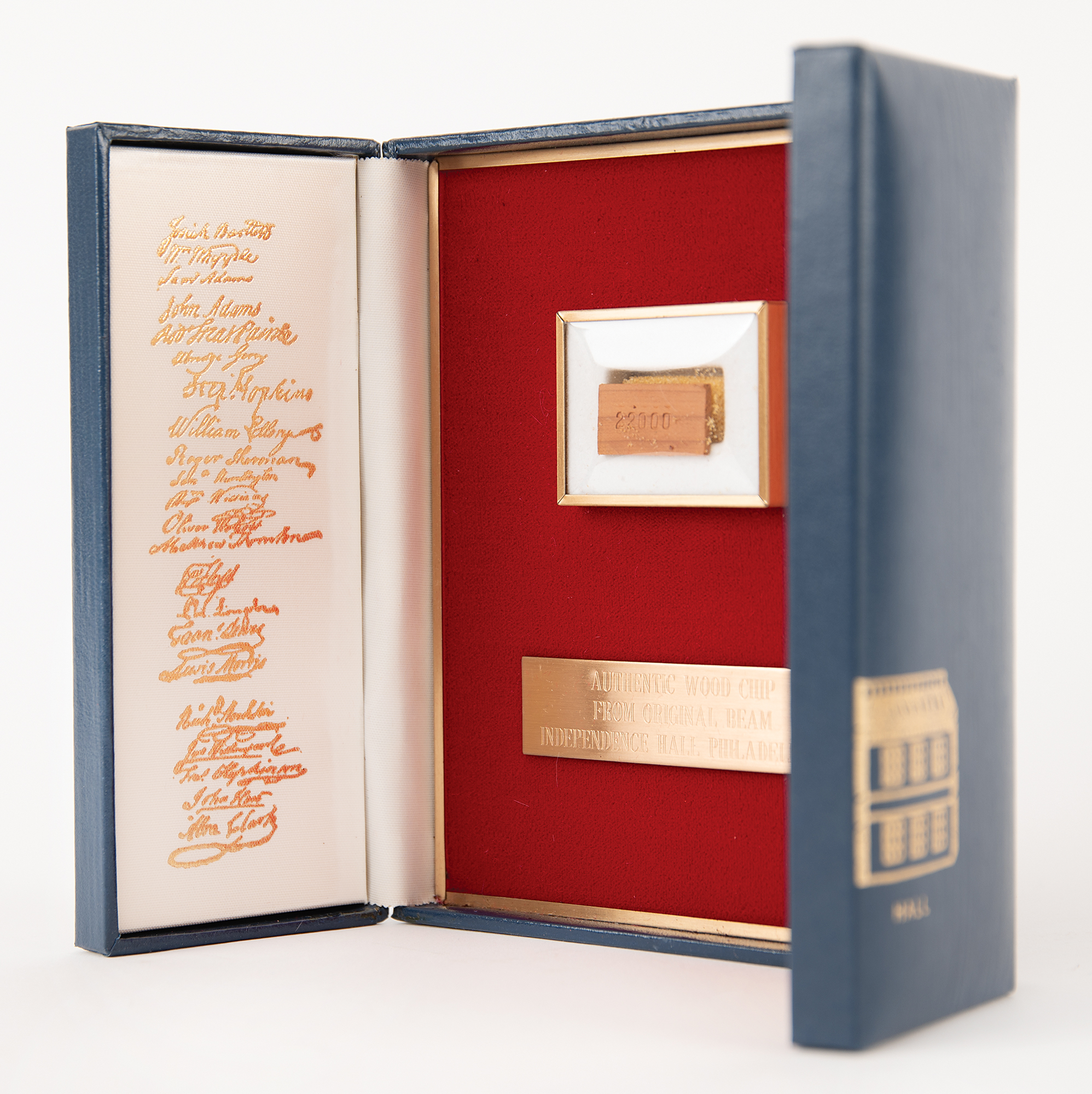 Limited edition display housing a 1 x .5 wood chip cut from the original cedar beams of Independence Hall in Philadelphia, numbered 22000 of an unspecified edition. Housed in a collector's case with an identification plaque and gold facsimile signatures of some of the signers of the Declaration of Independence. Accompanied by the original box and certificate from Burnes of Boston, who released the edition during the bicentennial year of 1976.