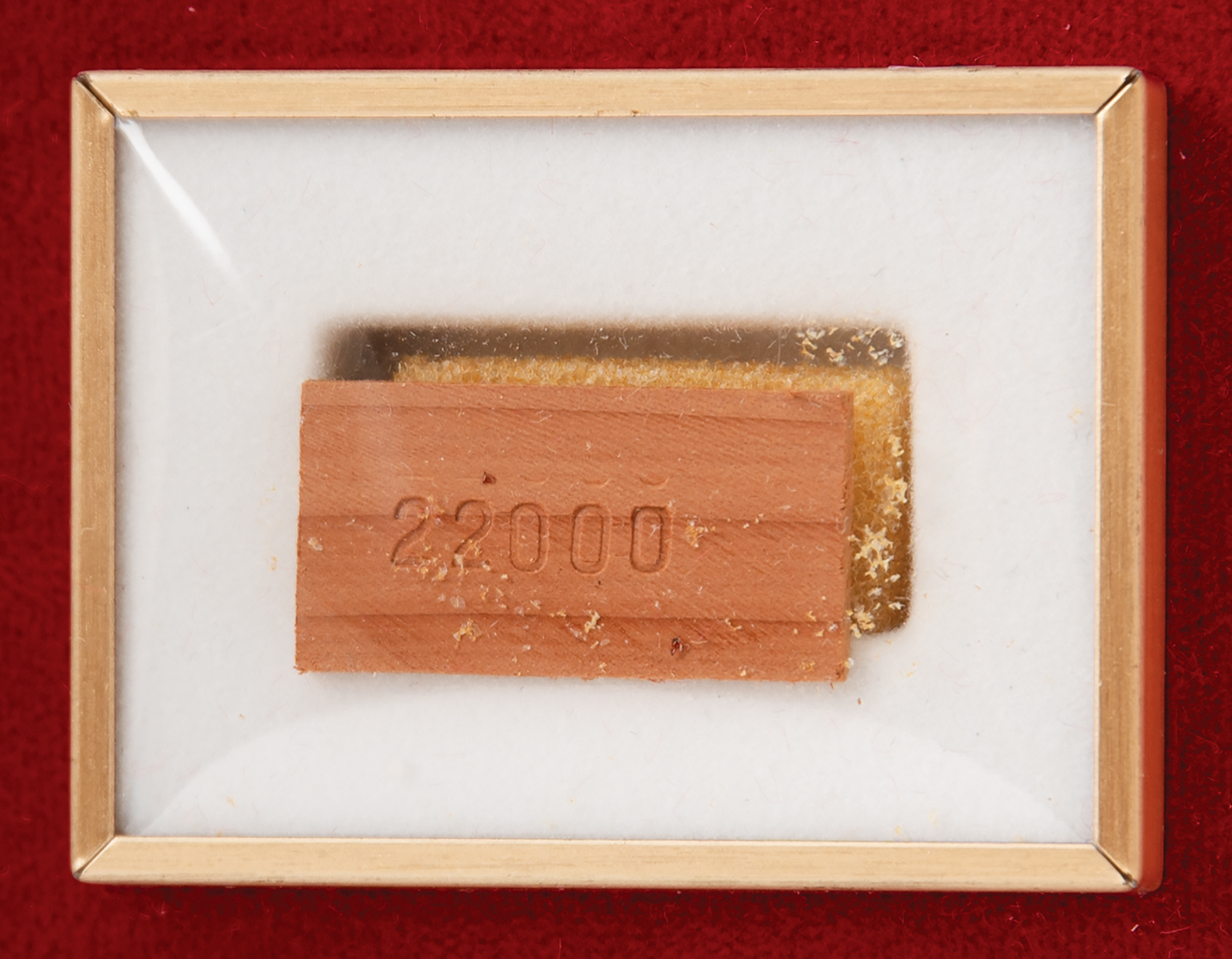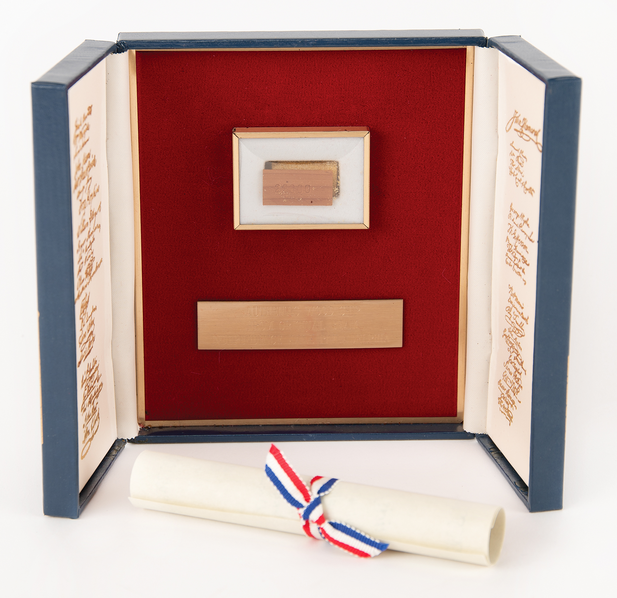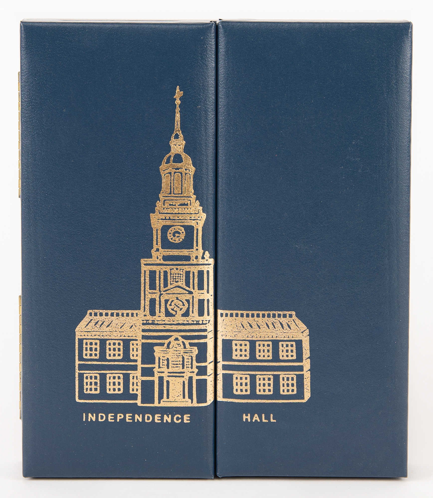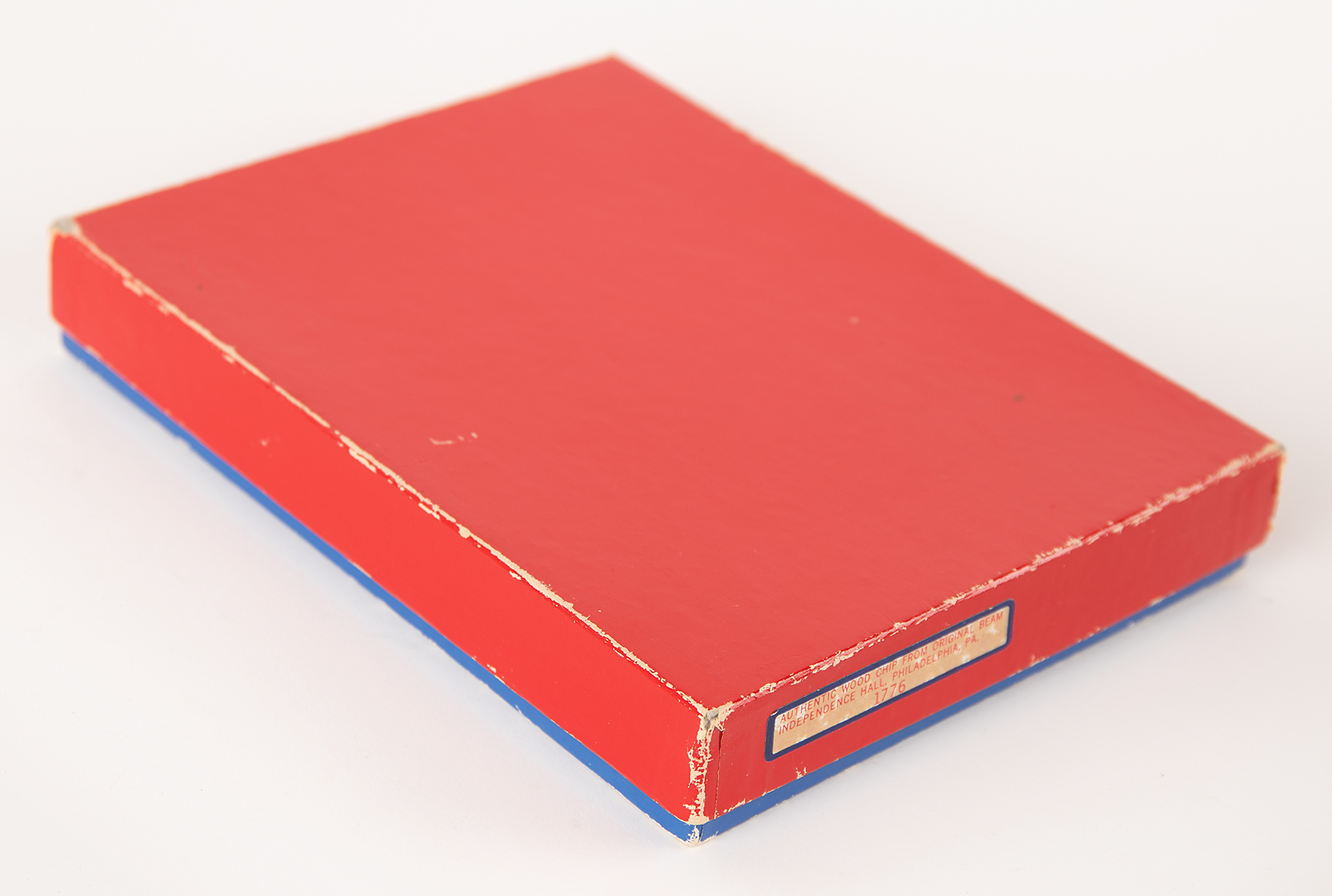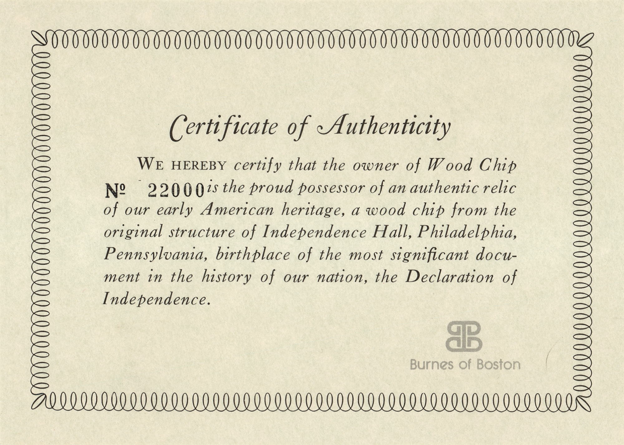 Limited edition display housing a 1 x .5 wood chip cut from the original cedar beams of Independence Hall in Philadelphia, numbered 22000 of an unspecified edition. Housed in a collector's case with an identification plaque and gold facsimile signatures of some of the signers of the Declaration of Independence. Accompanied by the original box and certificate from Burnes of Boston, who released the edition during the bicentennial year of 1976.