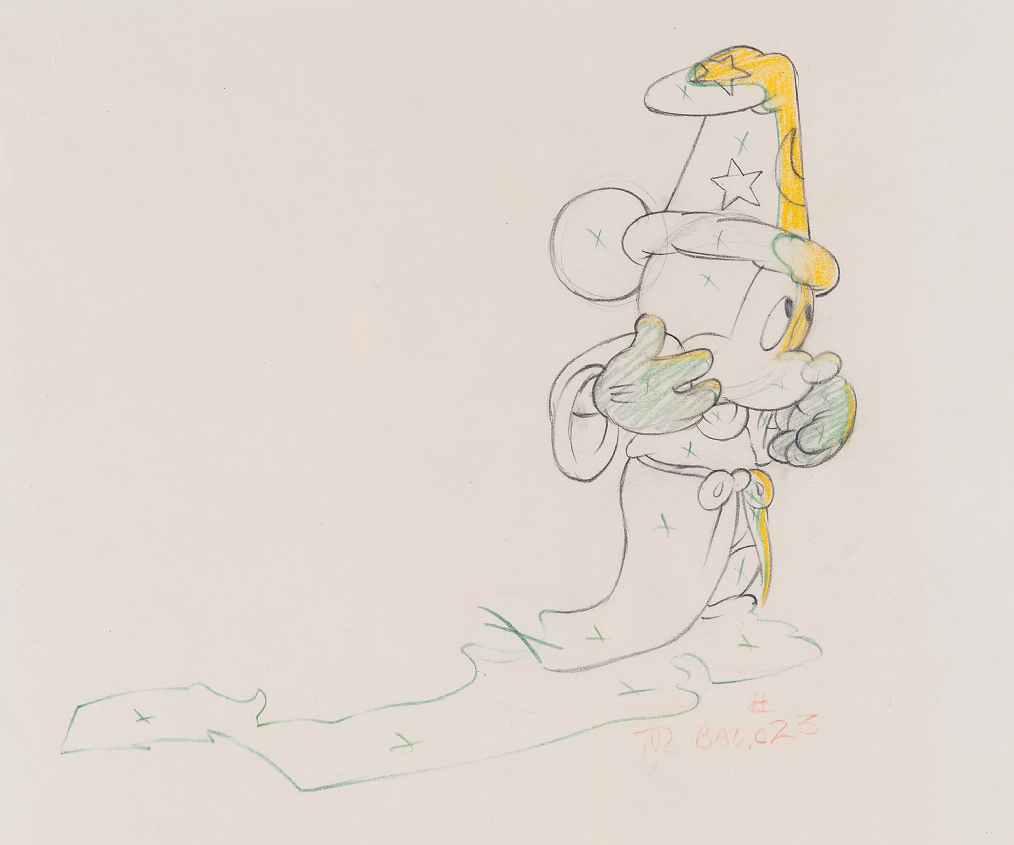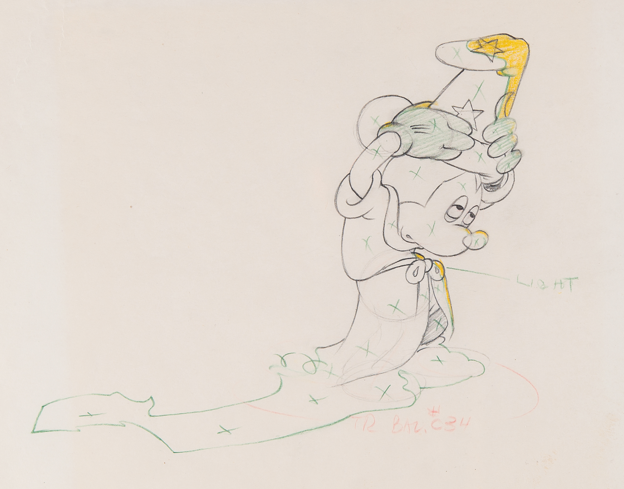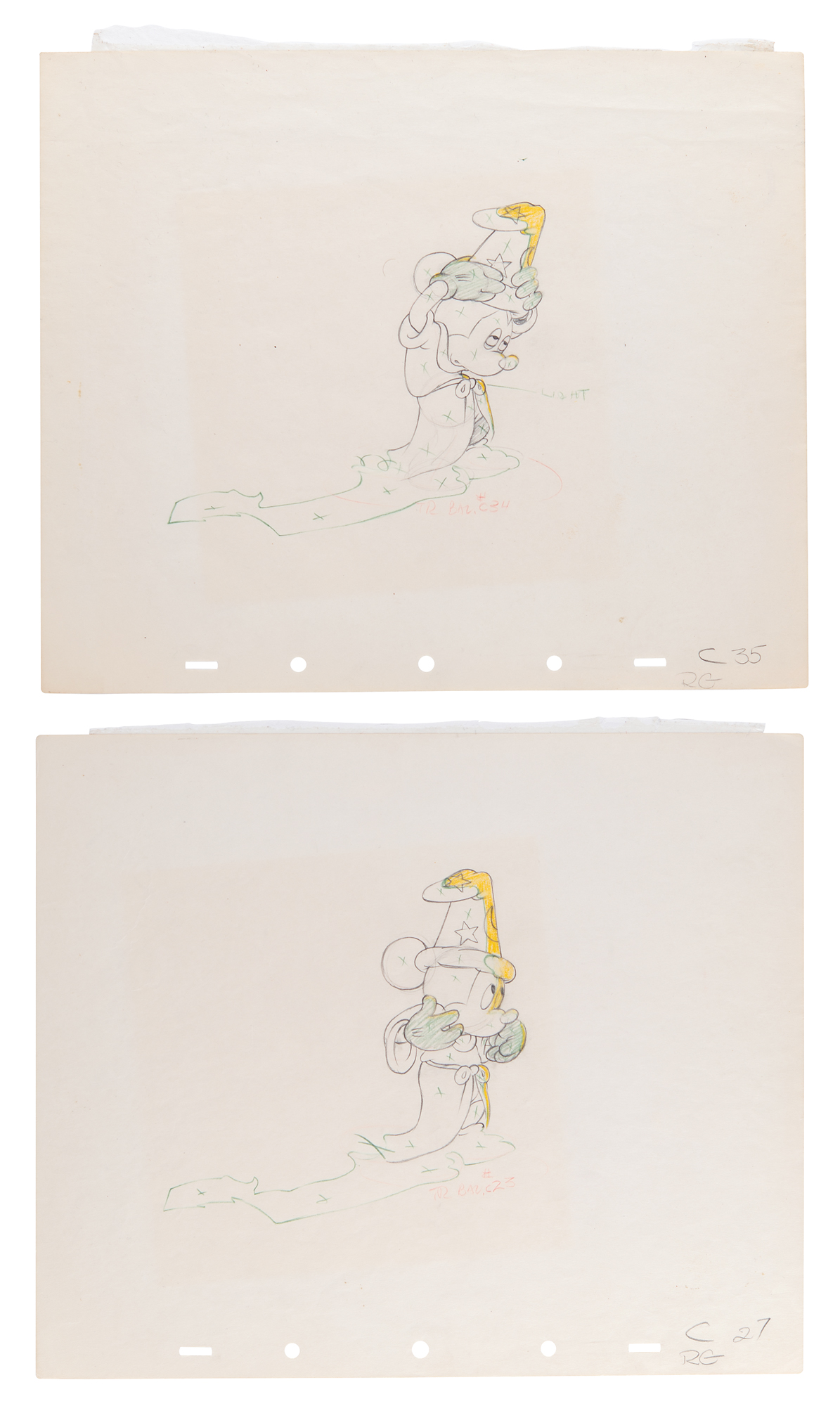 (Walt Disney Studios, 1940) Fantastic pairing of original production drawings featuring Mickey Mouse from Fantasia, showing him in his robe and wizard's hat in the 'Sorcerer's Apprentice' sequence. Accomplished in graphite on untrimmed 12 x 10 animation paper, marked "C27 RG" and "C35 RG" in the lower corners. The similar images measure 5.75 x 5. In overall fine condition. A magnificent pair of ideal, full-figure drawings from a celebrated sequence of an iconic animated Disney film.