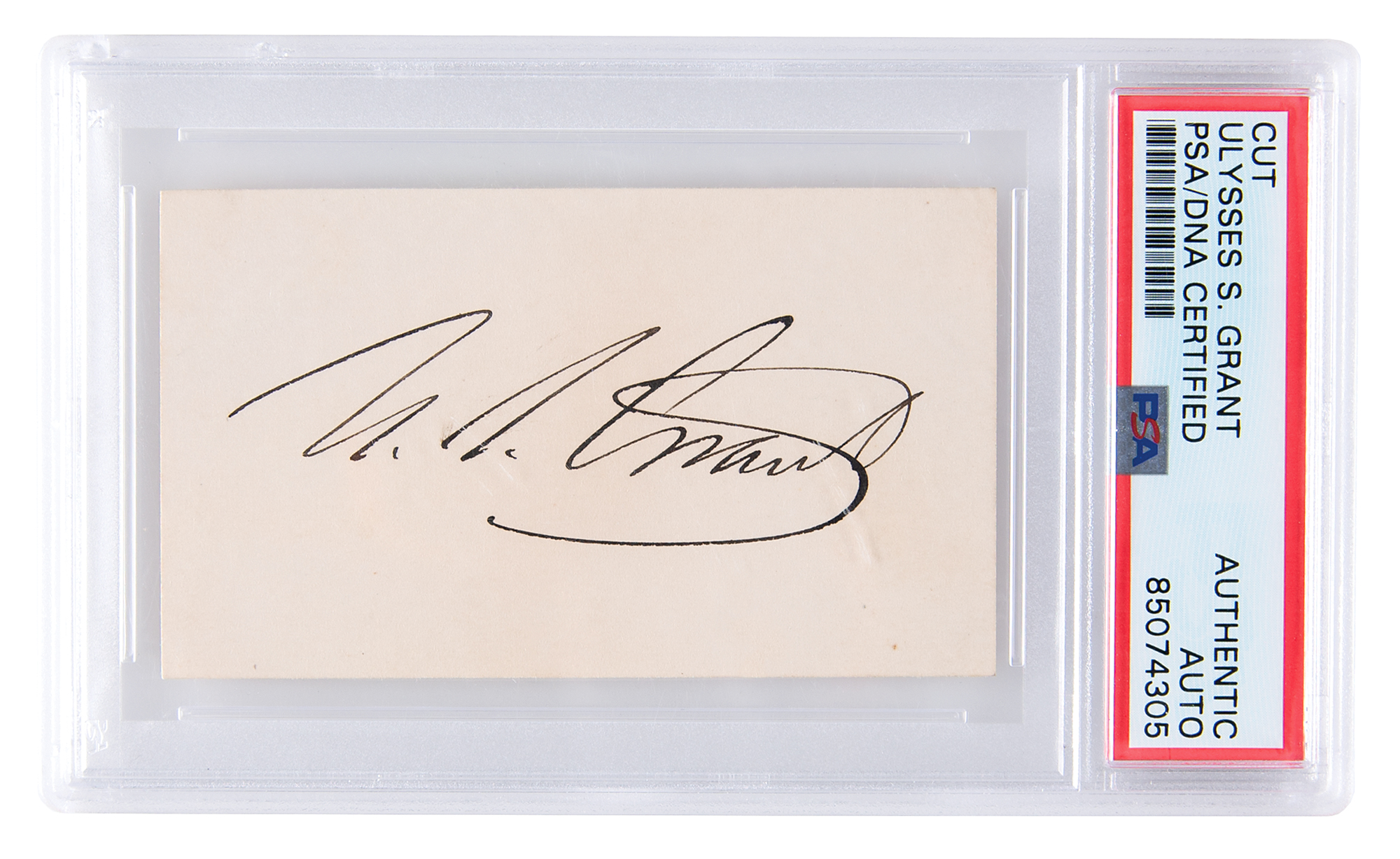 Beautiful ink signature, "U. S. Grant," on an off-white 3.25 x 2 card. In very fine condition. Encapsulated in a PSA/DNA authentication holder. Bold and clean, this is an essentially flawless example of Grant's autograph.