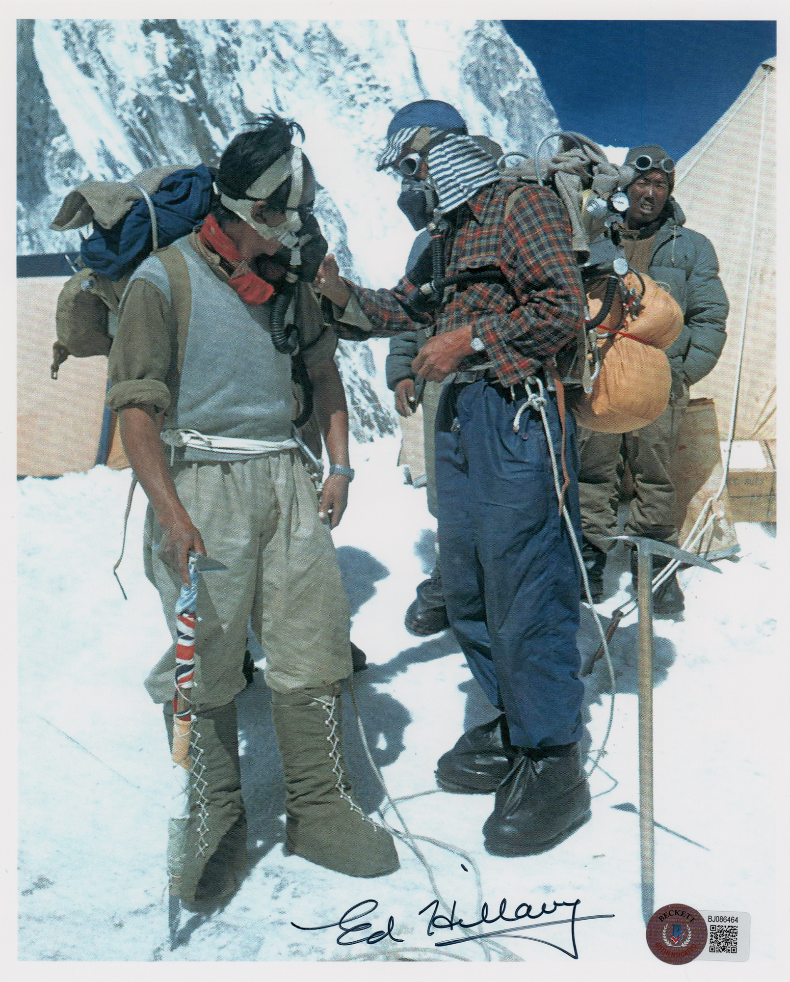 Color glossy 8 x 10 photo of Edmund Hillary and Tenzing Norgay checking their oxygen equipment before setting off from Mount Everest's Camp IV, signed in black felt tip, "Ed Hillary." In very fine condition, with a Beckett authentication label affixed to the lower right corner.