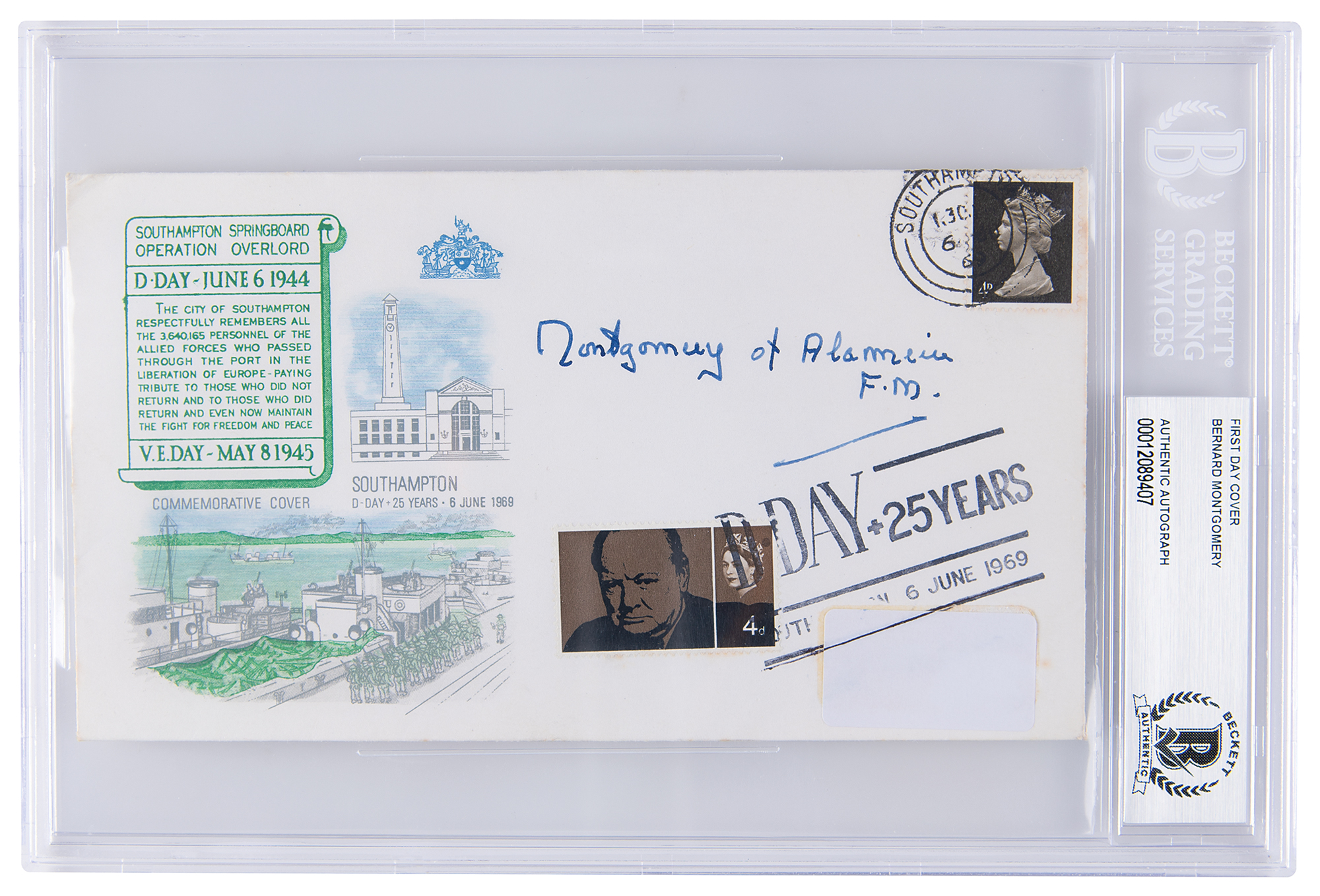 Commemorative cover with a cachet honoring the 25th anniversary of D-Day, signed in fountain pen, "Montgomery of Alamein, F. M." In very fine condition. Encapsulated in a Beckett authentication holder.