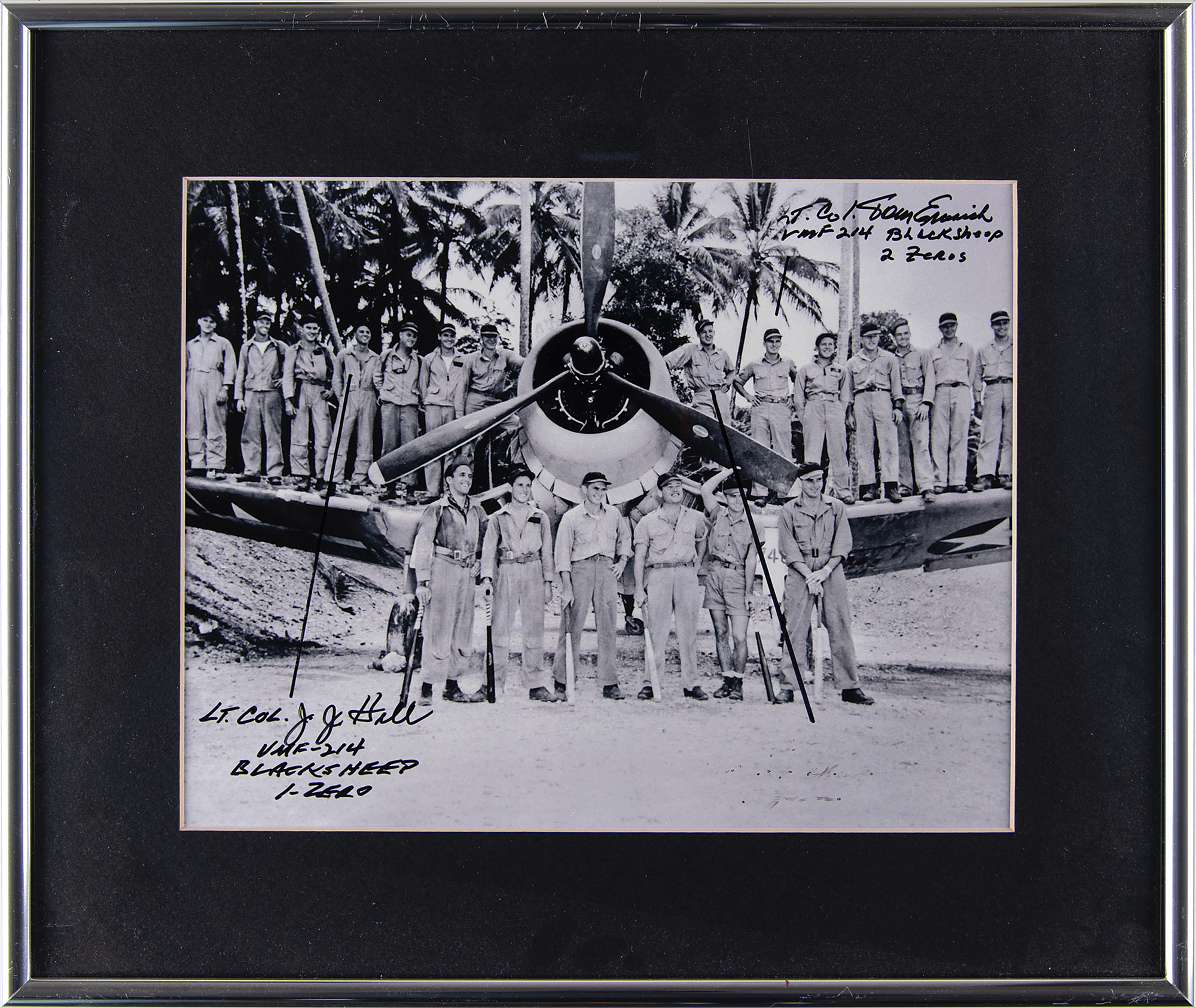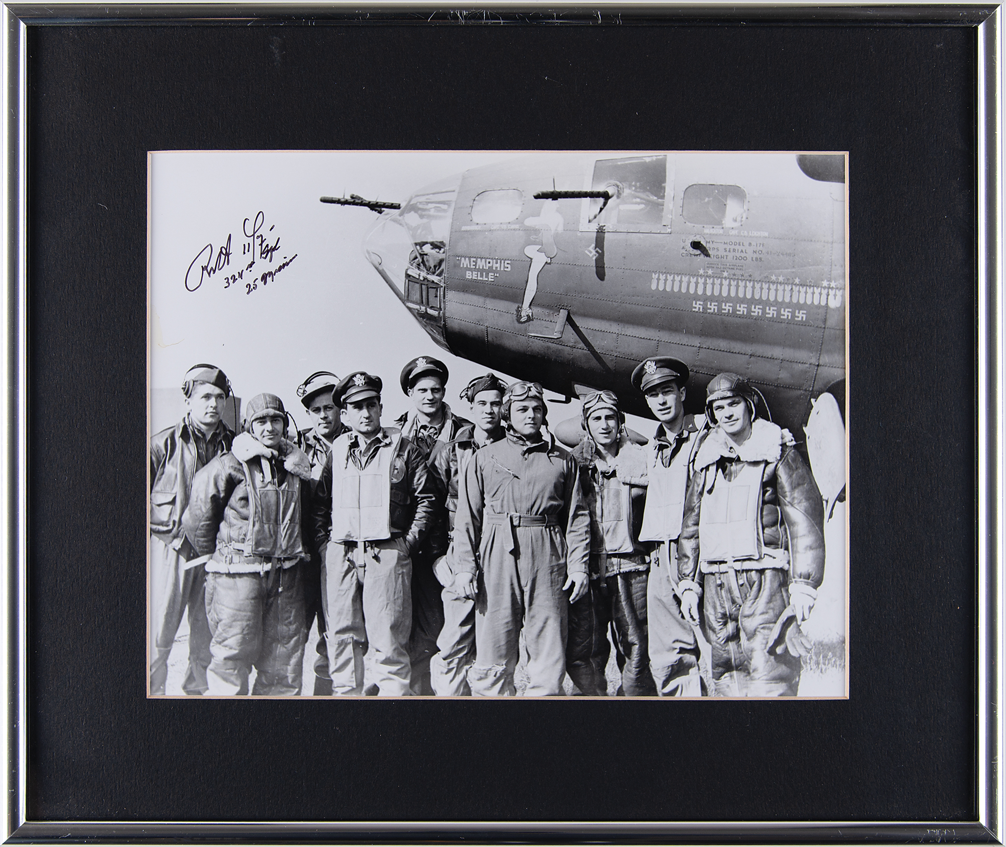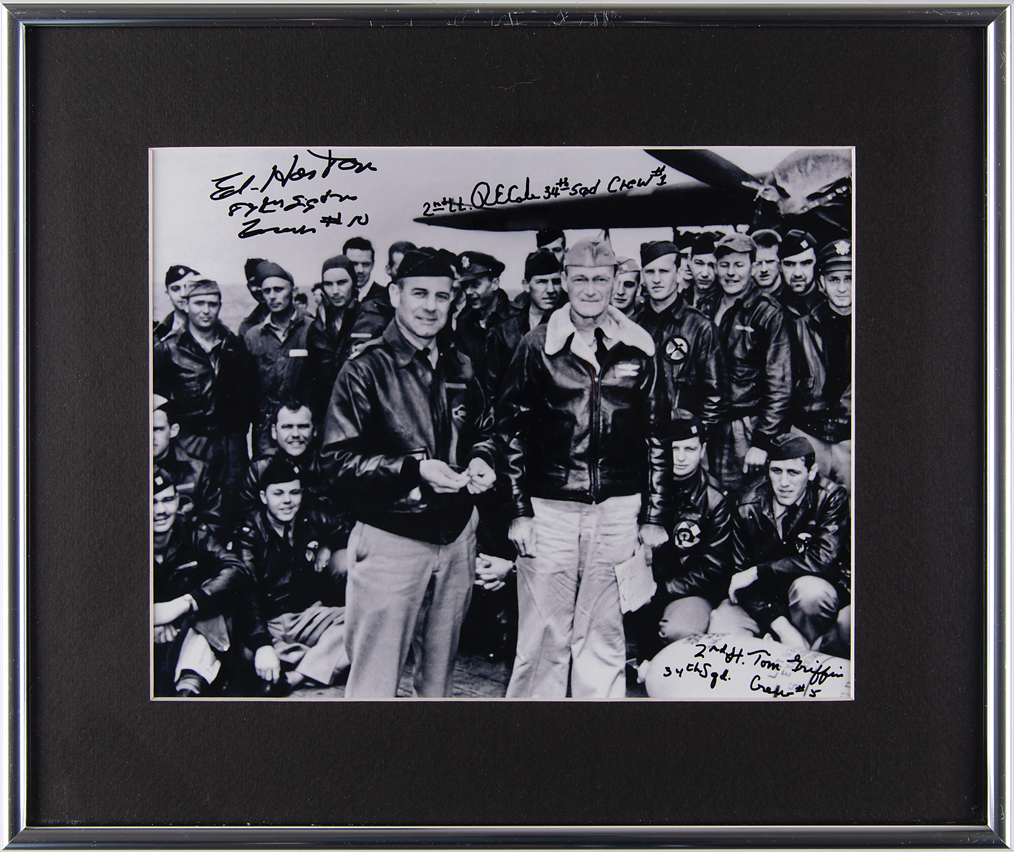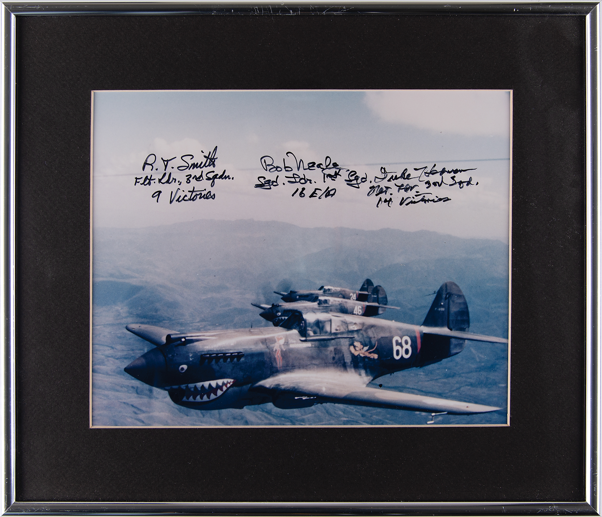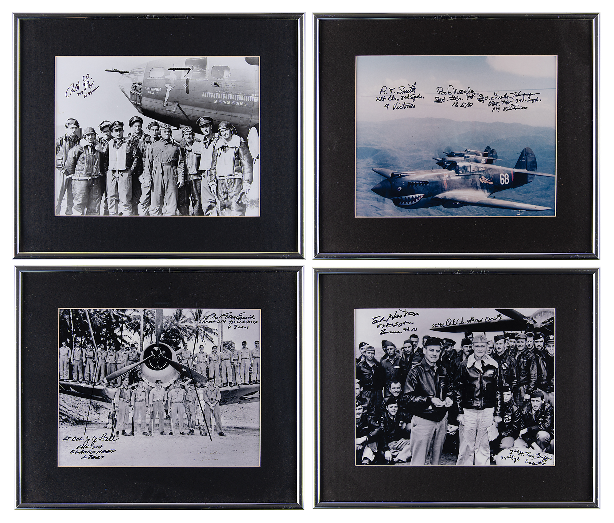 Four glossy 9.5 x 7.5 photos of World War II fighter planes and squadrons, each signed by one or more notable military aviators, including members of the Flying Tigers, Memphis Belle, Black Sheep, and Doolittle Raiders. Signers are: R. T. Smith, Bob Neale, and Duke Hedman; Robert Morgan; James J. Hill and Tom Emrich; and R. E. Cole, Tom Griffin, and Ed Horton. Each photo is matted and framed to an overall size of 13.5 x 11.5. In overall fine condition.