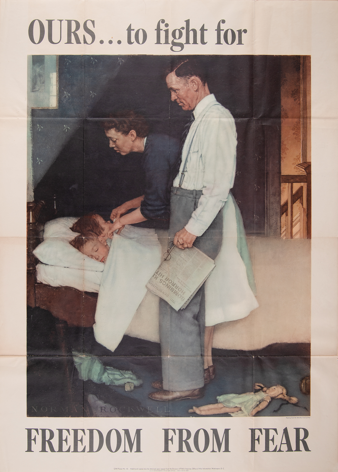 Iconic original color 28.5 x 40 Office of War Information poster (No. 46) published in 1943 by the Government Printing Office (1943-O-511887), featuring one of the classic 'Four Freedoms' paintings by Norman Rockwell, reading, "Ours...to fight for, Freedom From Fear." In very good to fine condition, with folds as issued (some with small holes at intersections) and some light wrinkling.