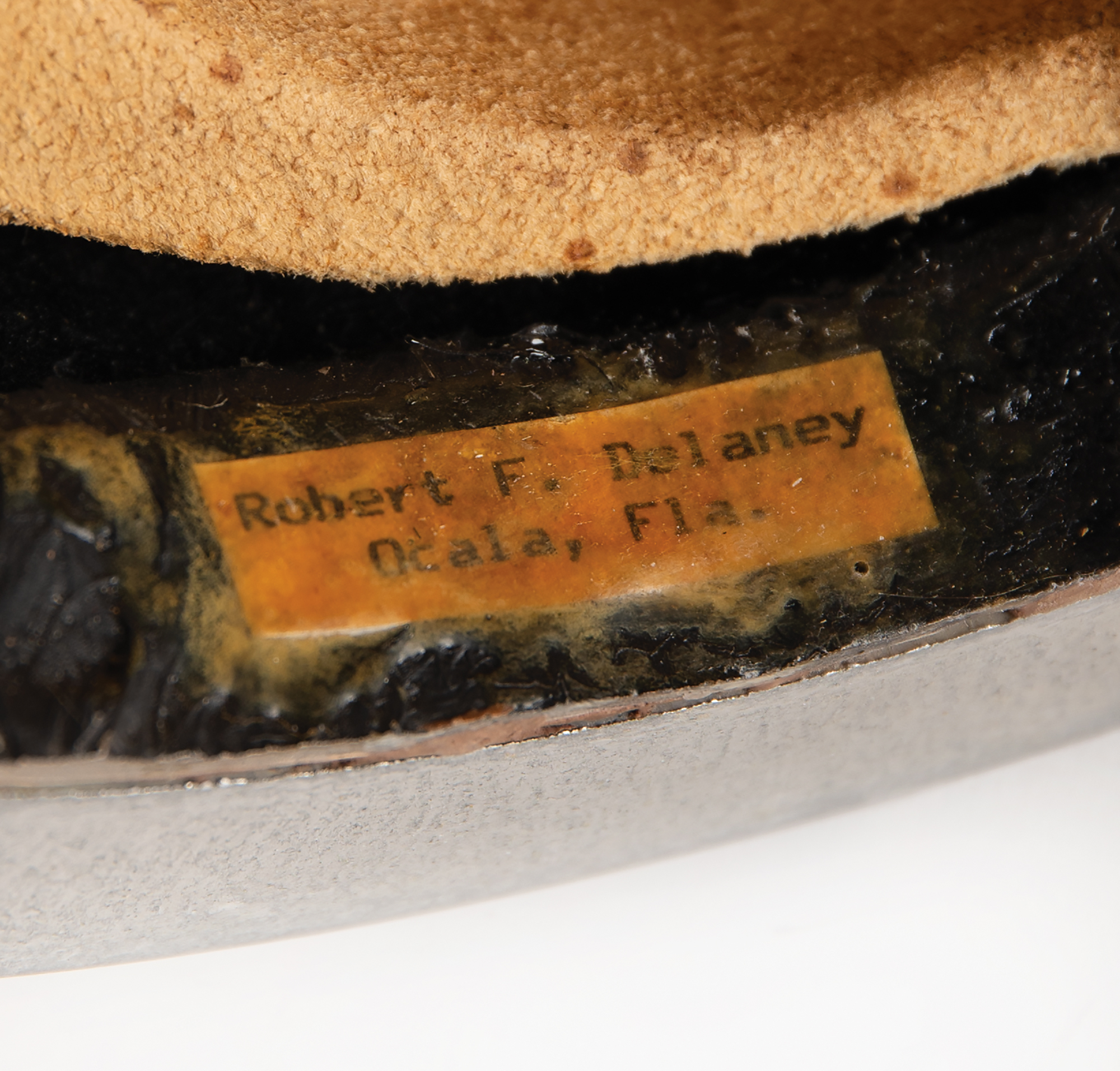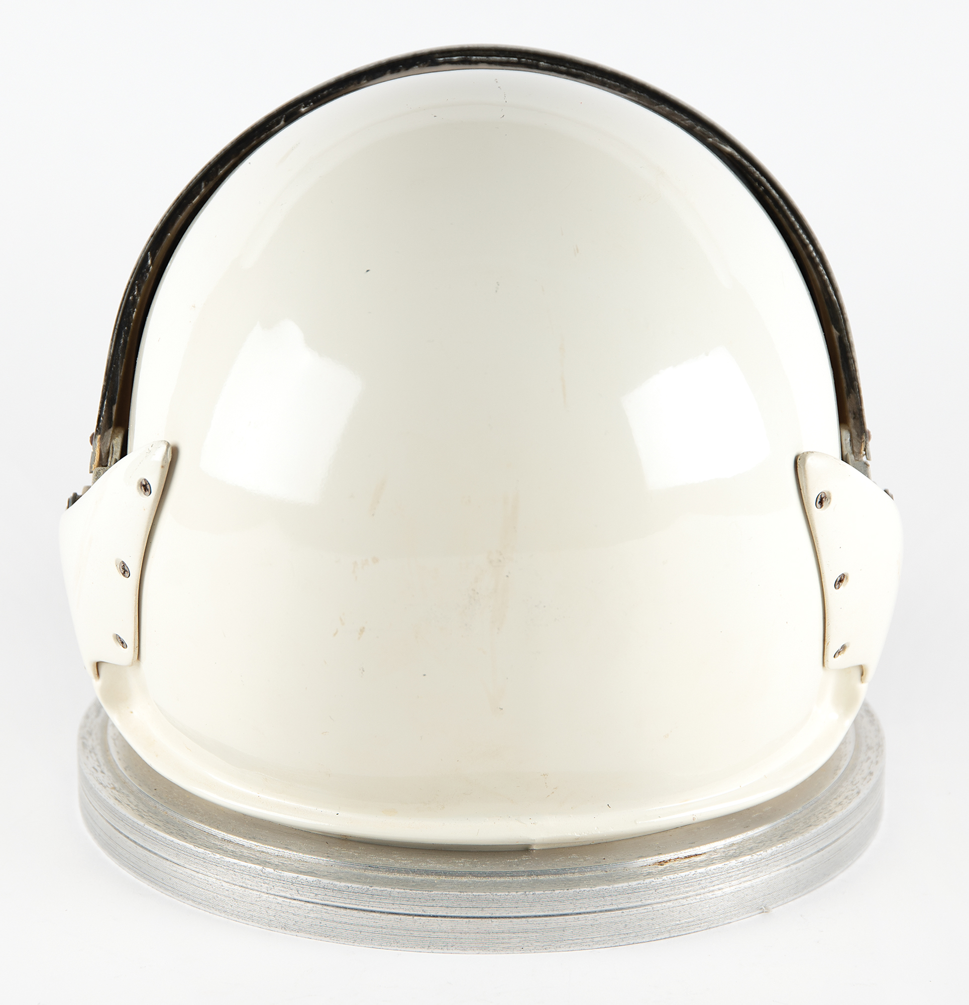 Attractive replica of a Project Gemini G-3-C astronaut helmet, approximately measuring 10˝ x 9˝ x 10.5˝, with a fully retractable visor, and inner crown pad and ear cups. The inner neck ring bears an affixed label attributed to “Robert F. Delaney, Ocala, Fla.” In fine condition, with light scattered wear. An uncommon Gemini replica helmet likely produced for public affairs or educational outreach.