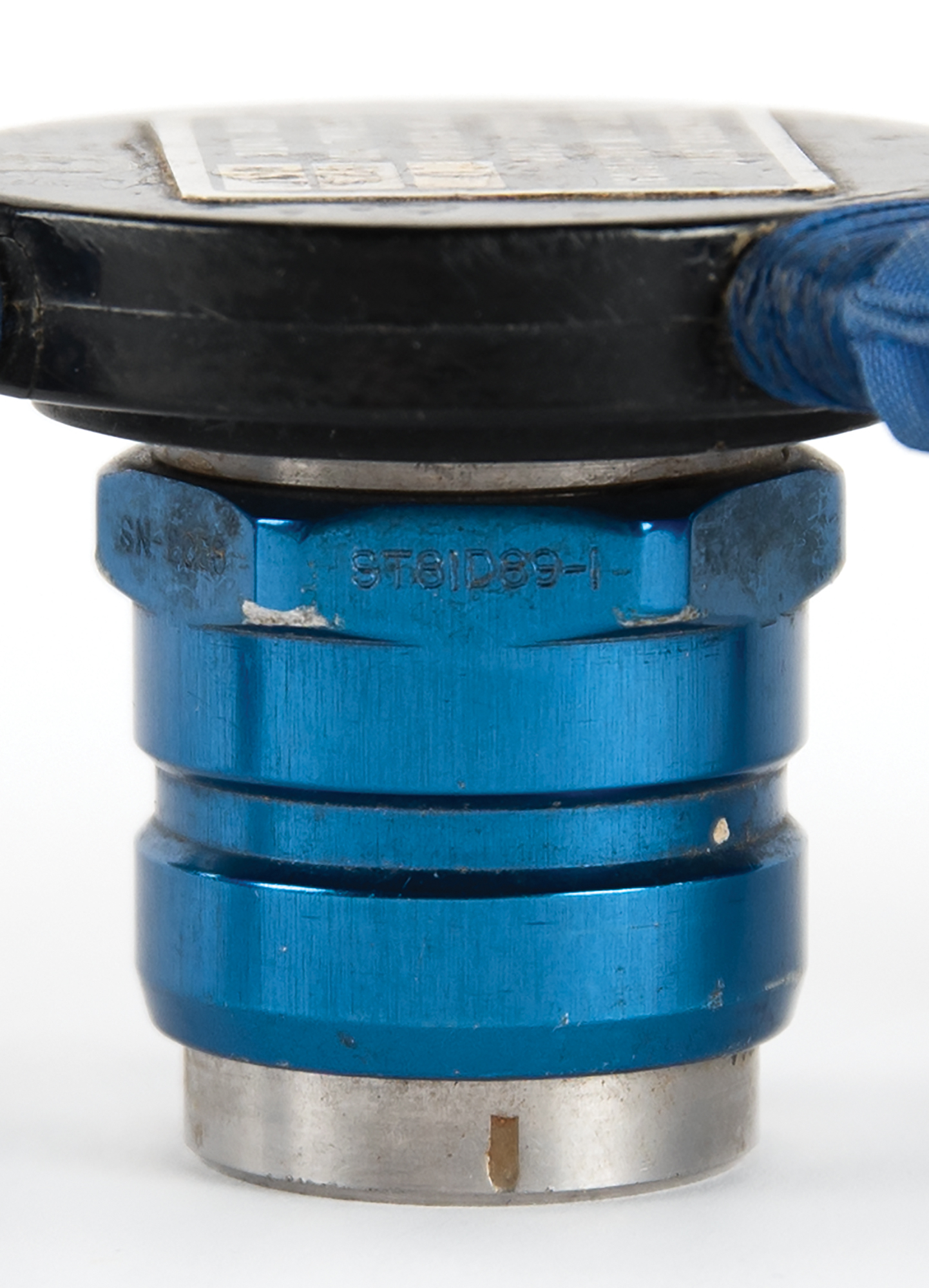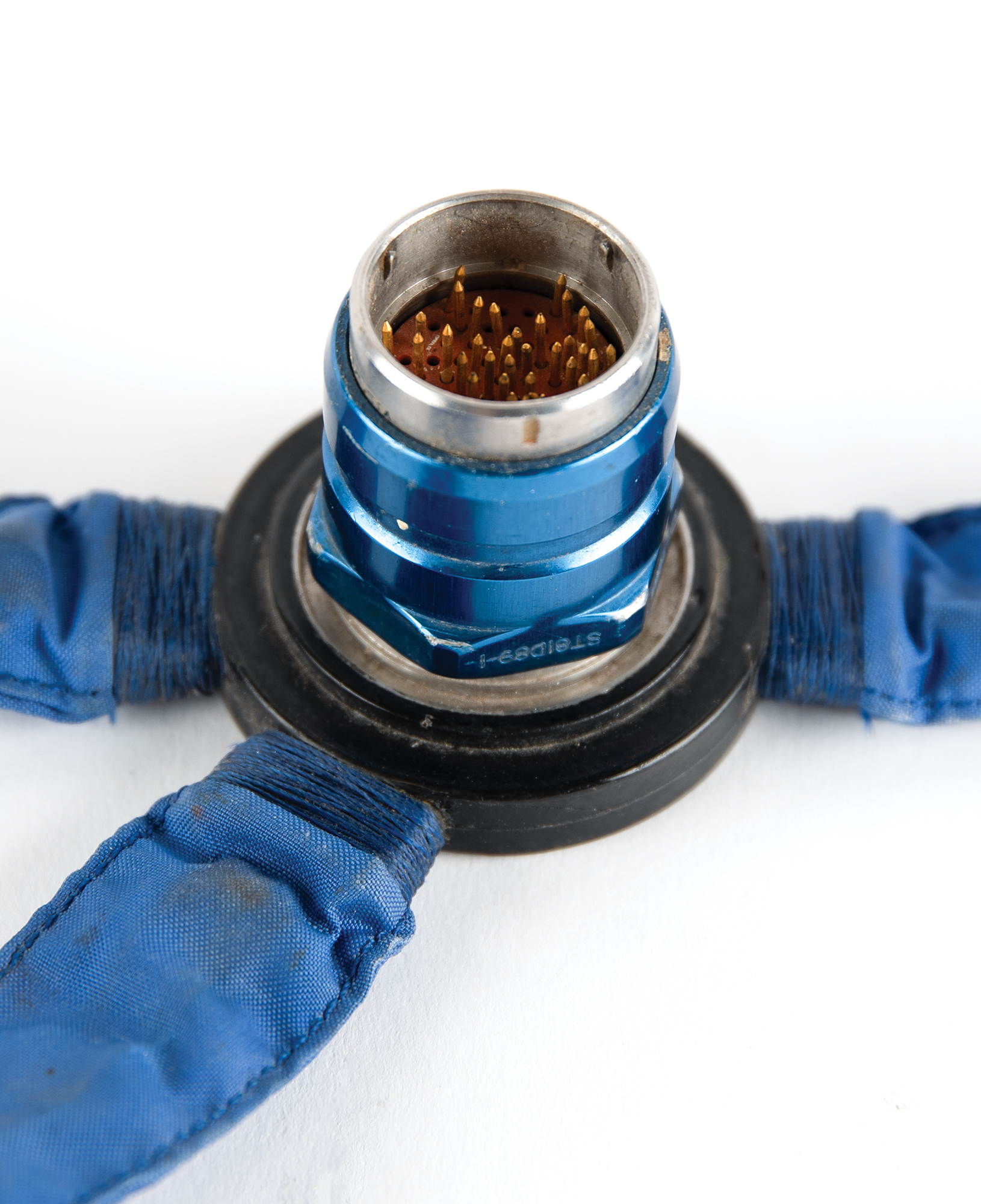 Apollo Constant Wear Garment (CWG) electrical harness for an Apollo A6L space suit, approximately measuring 23˝ long, consisting of two silver connection ports that feed via cloth-wrapped cables into a central connector, the back of which is marked, "Harness, Suit, ILC P/N A6L-101031, Cicoil Corp P/N 510A100 D, Serial No. 023.” In fine condition, with light wear and soiling, with one port missing.