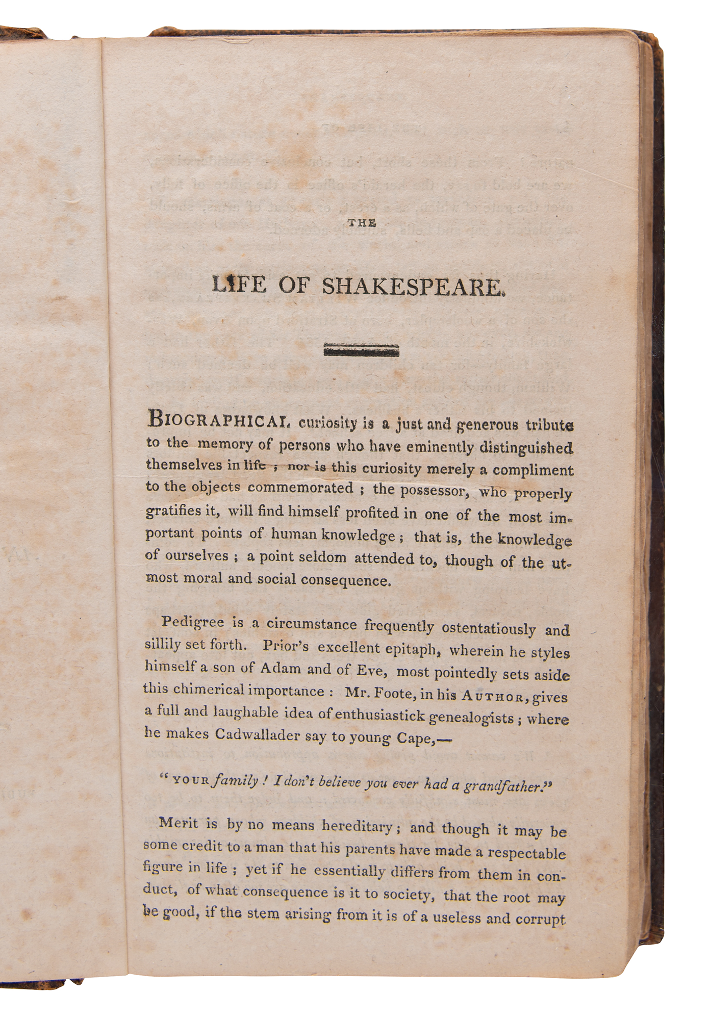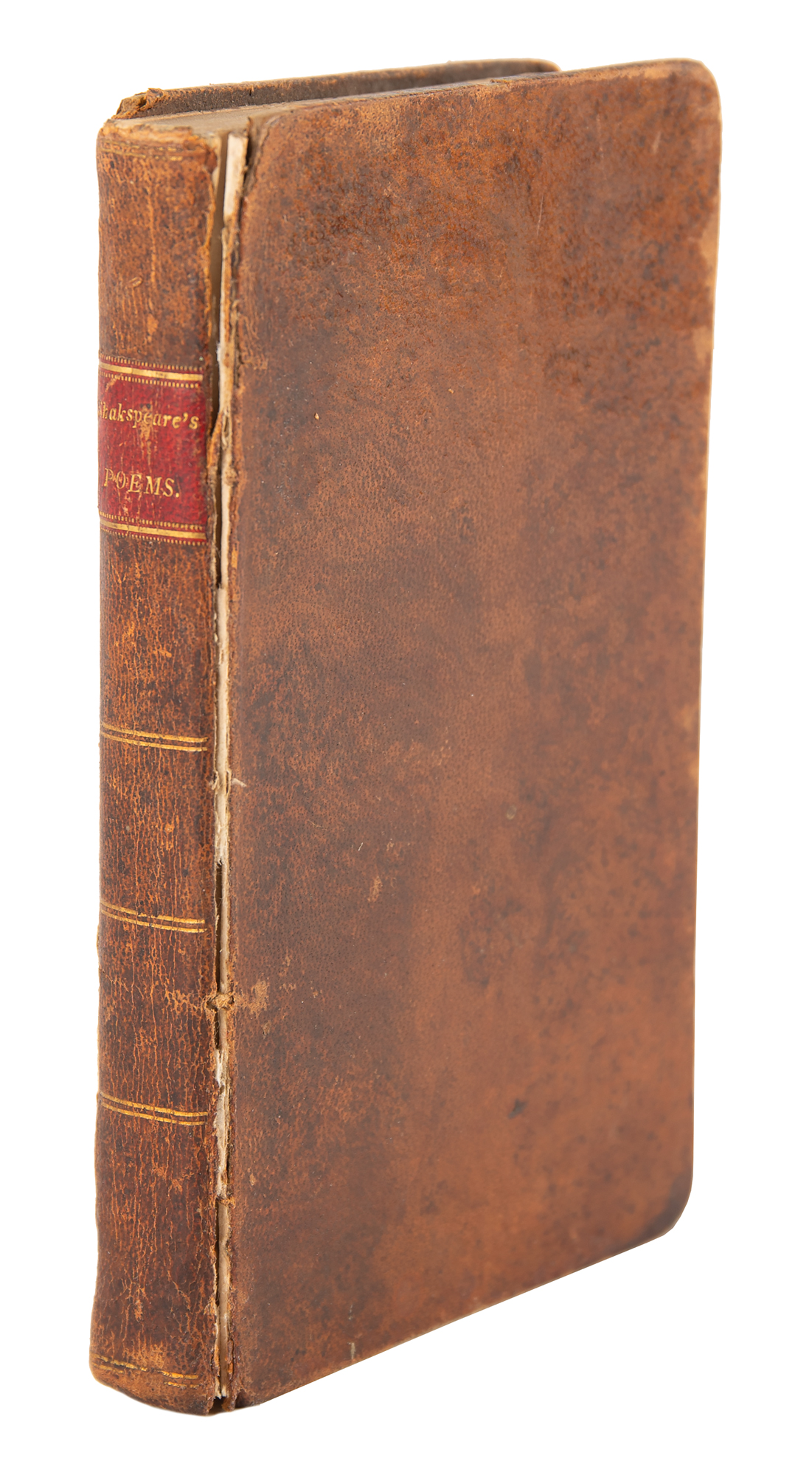 Uncommon and significant book: The Poems of Shakespeare, to which is added An Account of His Life. First American edition. Boston: Oliver and Munroe, and Belcher and Armstrong, 1807. Hardcover bound in contemporary brown calf, with gilt spine label, 4.25 x 7, 258 pages. Book condition: G+/None, with mottled foxing to textblock, tears at gutters of the two front endpapers, cracked joints, and an ownership inscription to a free end page. This was the first separate edition of Shakespeare's poems published in America: it was preceded only by a collection of his complete works published in Philadelphia between 1795-96.