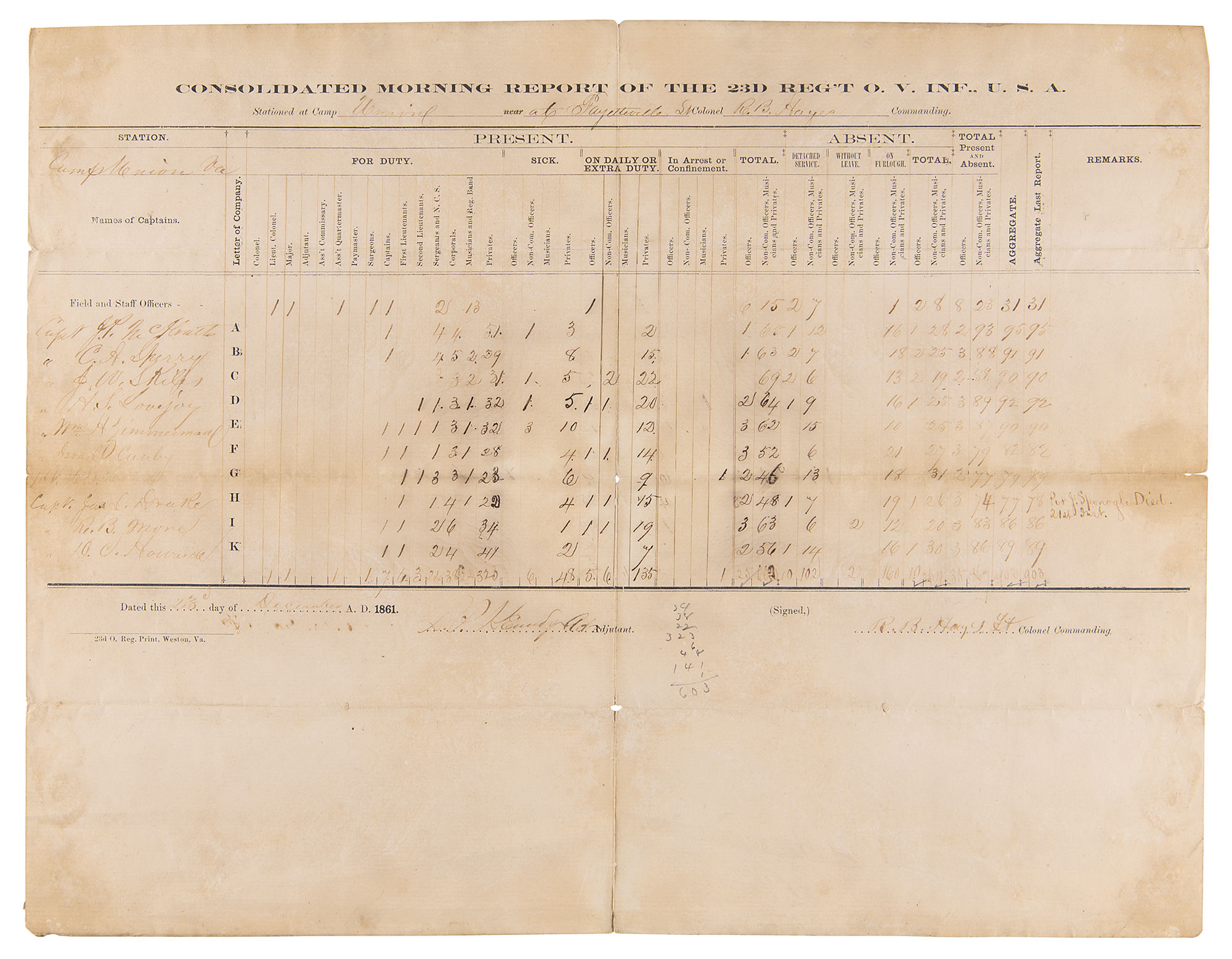 Scarce 1861 morning report of the 23rd Ohio Volunteers, signed by "R. B. Hayes Lt. Colonel Commanding"