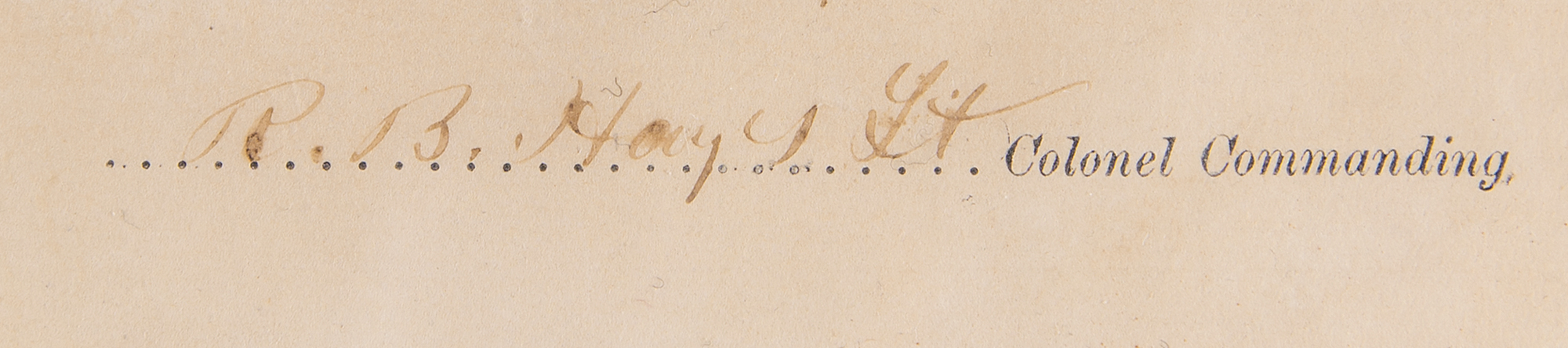 After the bombardment of Fort Sumter, Hayes resolved to leave his law practice and fight for the Union cause, joining the 23rd Regiment of Ohio Volunteer Infantry. Also joining up were his friend and college classmate Stanley Matthews (later a justice of the Supreme Court), future congressman Robert P. Kennedy (who also signs here), and another future president, William McKinley. Marching into Virginia, the regiment first met resistance at the Battle of Carnifex Ferry in September 1861, driving the rebels back in a decisive strategic victory. Hayes was promoted to lieutenant colonel in November and led his troops deeper into western Virginia, where they entered winter quarters at Fayetteville—where he signed this document. A scarce, very early Hayes document from his heroic service in the Civil War.