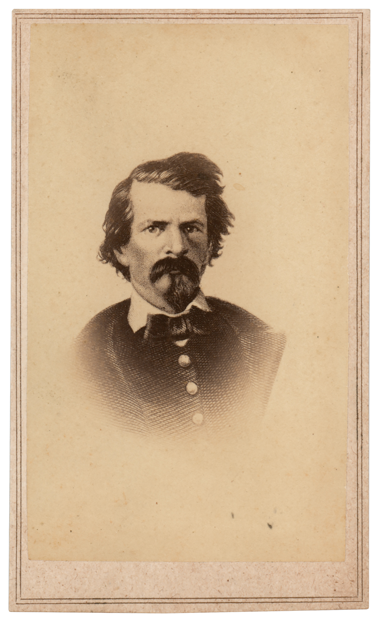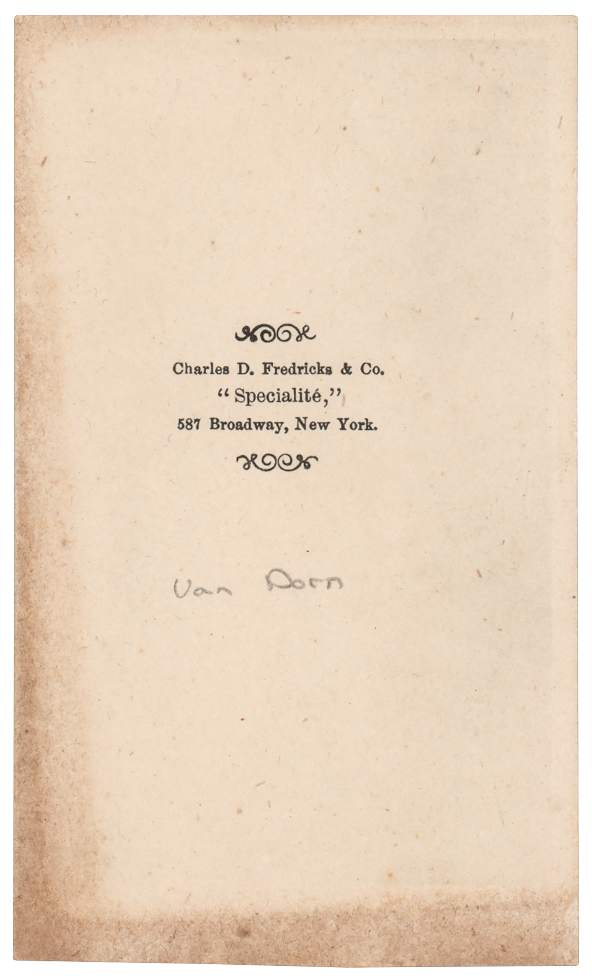 Confederate general (1820-1863) noted for his defeats at Pea Ridge and Corinth in 1862. Known as an impulsive, emotional womanizer, he was murdered by a civilian who claimed that Van Dorn had carried on an affair with his wife. Unsigned 2.5 x 4 carte-de-visite portrait of Earl Van Dorn in a suit and bow tie. Published by Charles D. Fredricks & Co. of New York. In fine condition.