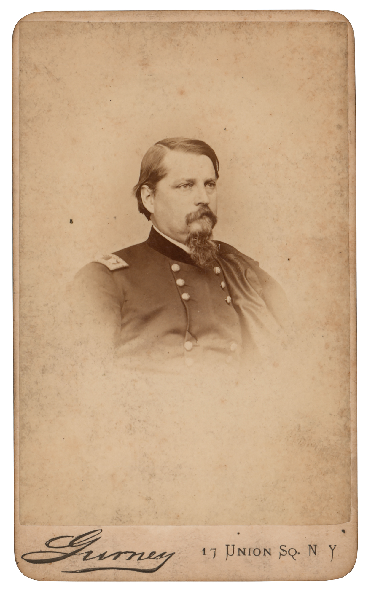 Union general (1824–1886) who distinguished himself in the Battle of Gettysburg and later commanded Custer and the 7th Cavalry against the Cheyenne in the disastrous 1867 campaign known as 'Hancock's War.' Desirable unsigned 2.5 x 4 carte-de-visite bust portrait of Winfield Scott Hancock in uniform, published by Gurney of New York. In fine condition, with some light scuffing and soiling.