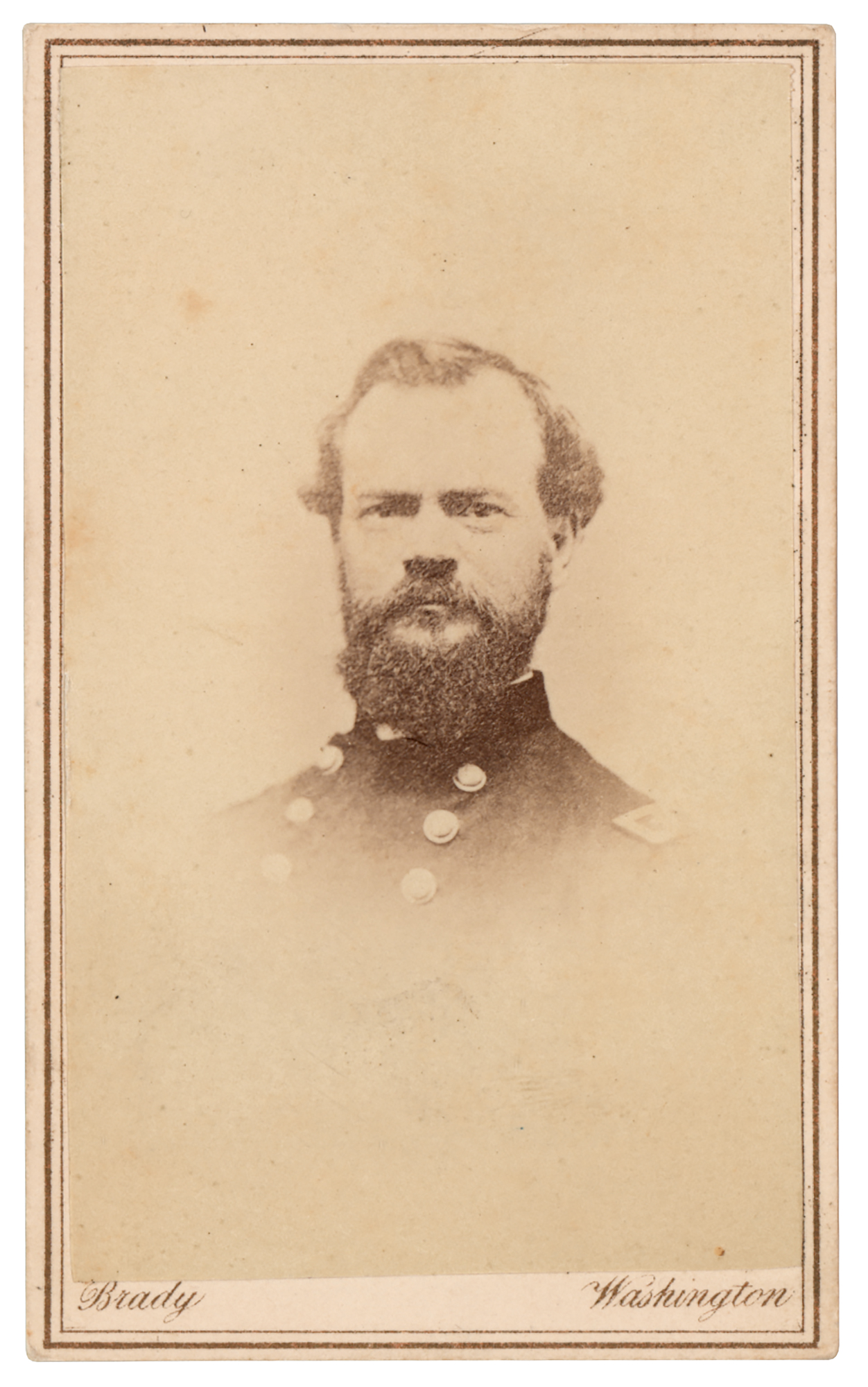 Career US Army officer (1828–1864) who served as a general in the Union Army and was killed in action at the Battle of Atlanta—the second highest ranking Union officer killed during the war. Unsigned 2.5 x 4 carte-de-visite portrait of James Birdseye McPherson in uniform, published by Brady's National Photographic Portrait Galleries. In fine condition.