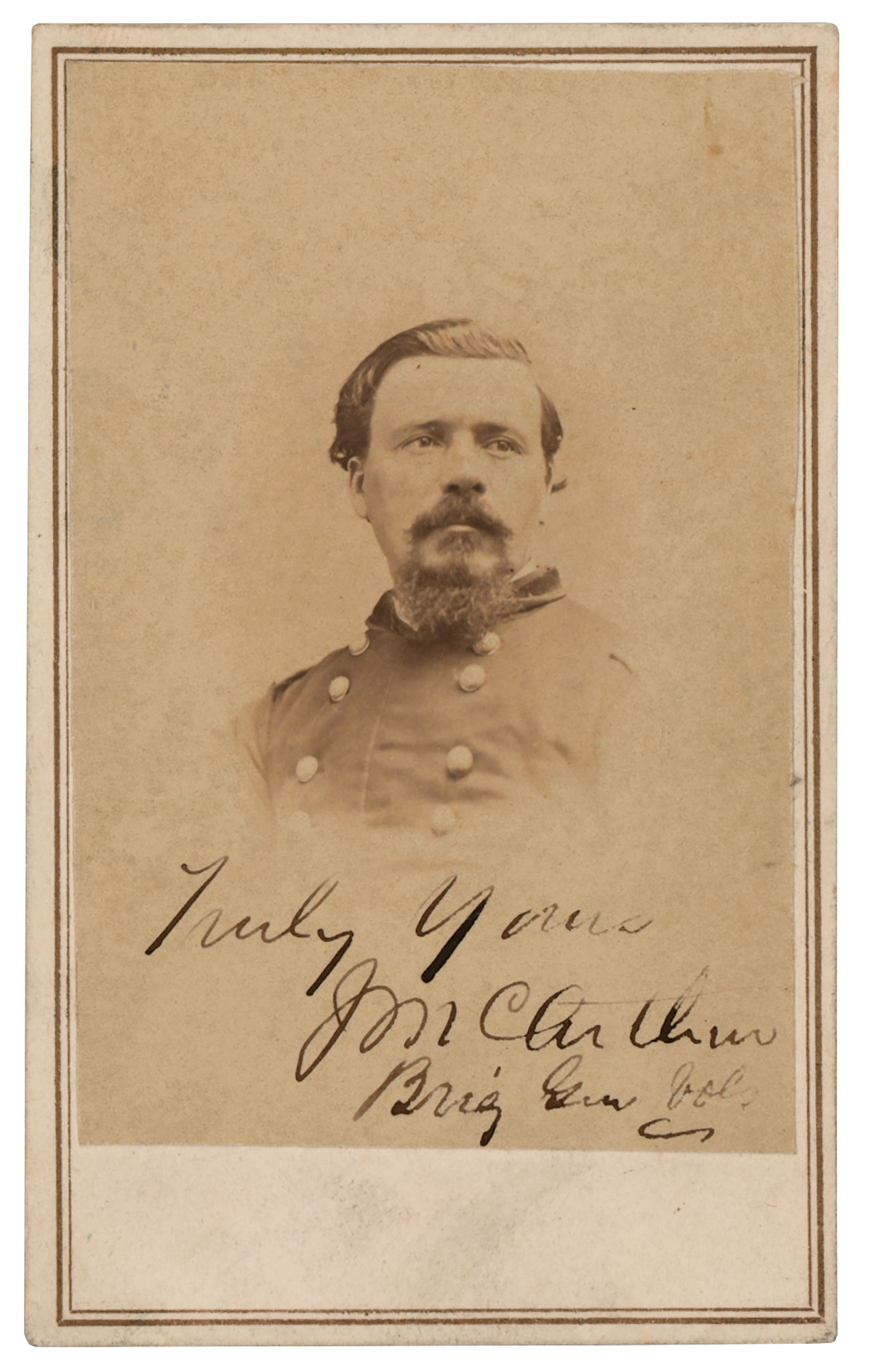 Union general (1826-1906) regarded as one of the ablest Federal commanders in the Western Theater. Uncommon 2.5 x 4 carte-de-visite bust portrait of McArthur in uniform, boldly signed in ink, "Truly Yours, J. McArthur, Brig. Gen. Vols." In fine condition, with a skinned back and mounting remnants to reverse.