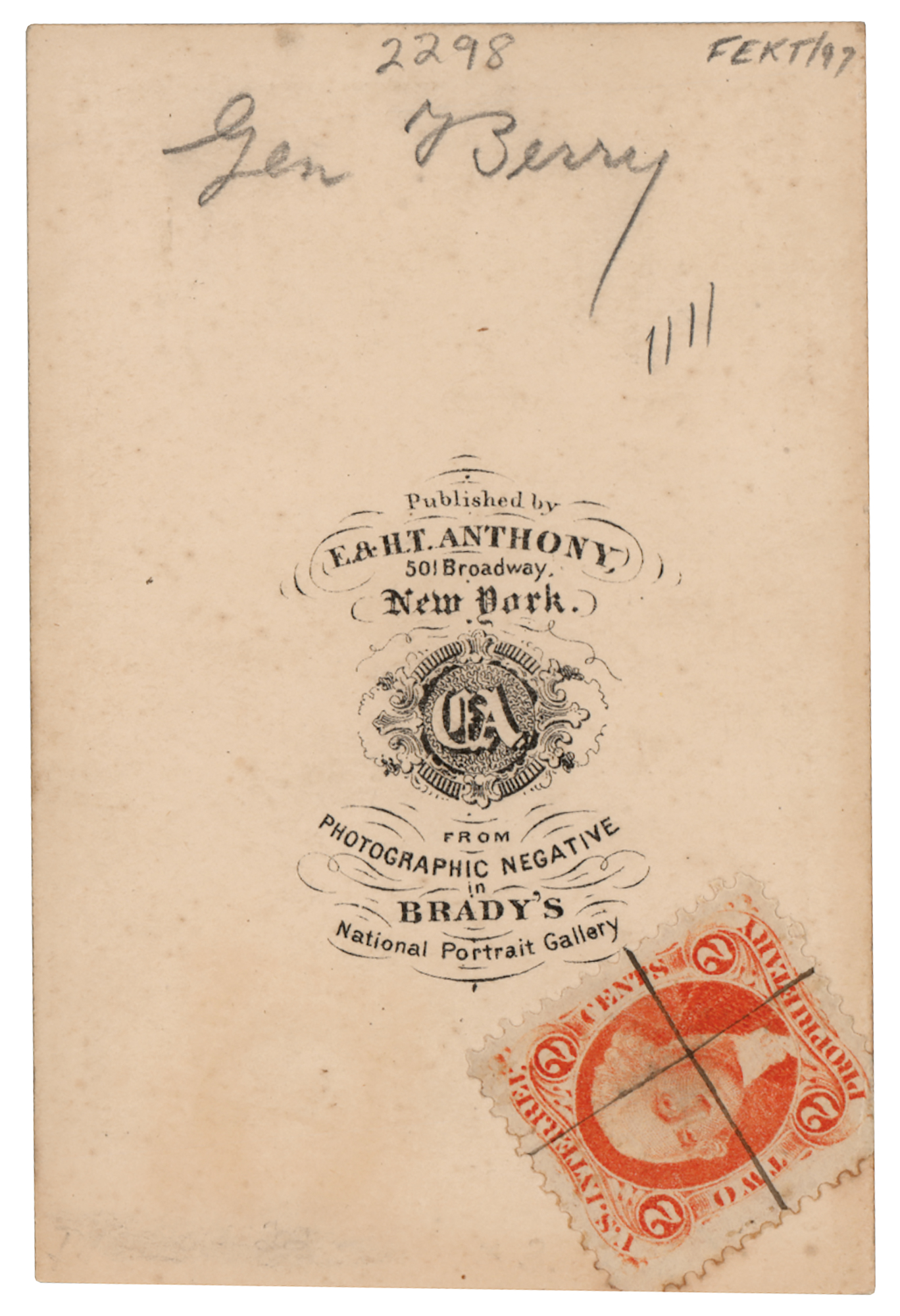 Union general (1824–1863) in the Army of the Potomac during the Civil War who was killed at the Battle of Chancellorsville. Desirable unsigned Civil War–era 2.5 x 3.75 carte-de-visite portrait of Hiram G. Berry in uniform, striking an unflinching seated pose in his Union frock coat. Published by E. & H. T. Anthony of New York, from a “Photographic Negative in Brady's National Portrait Gallery,” with two-cent revenue stamp applied to the reverse. The stamp allows us to date the CDV to circa 1864–1866, when the 'Sun Picture Tax' was in effect—passed by Congress as a means to finance the ongoing war between the states. In fine condition, with a trimmed bottom edge and pencil identification notation to the reverse.