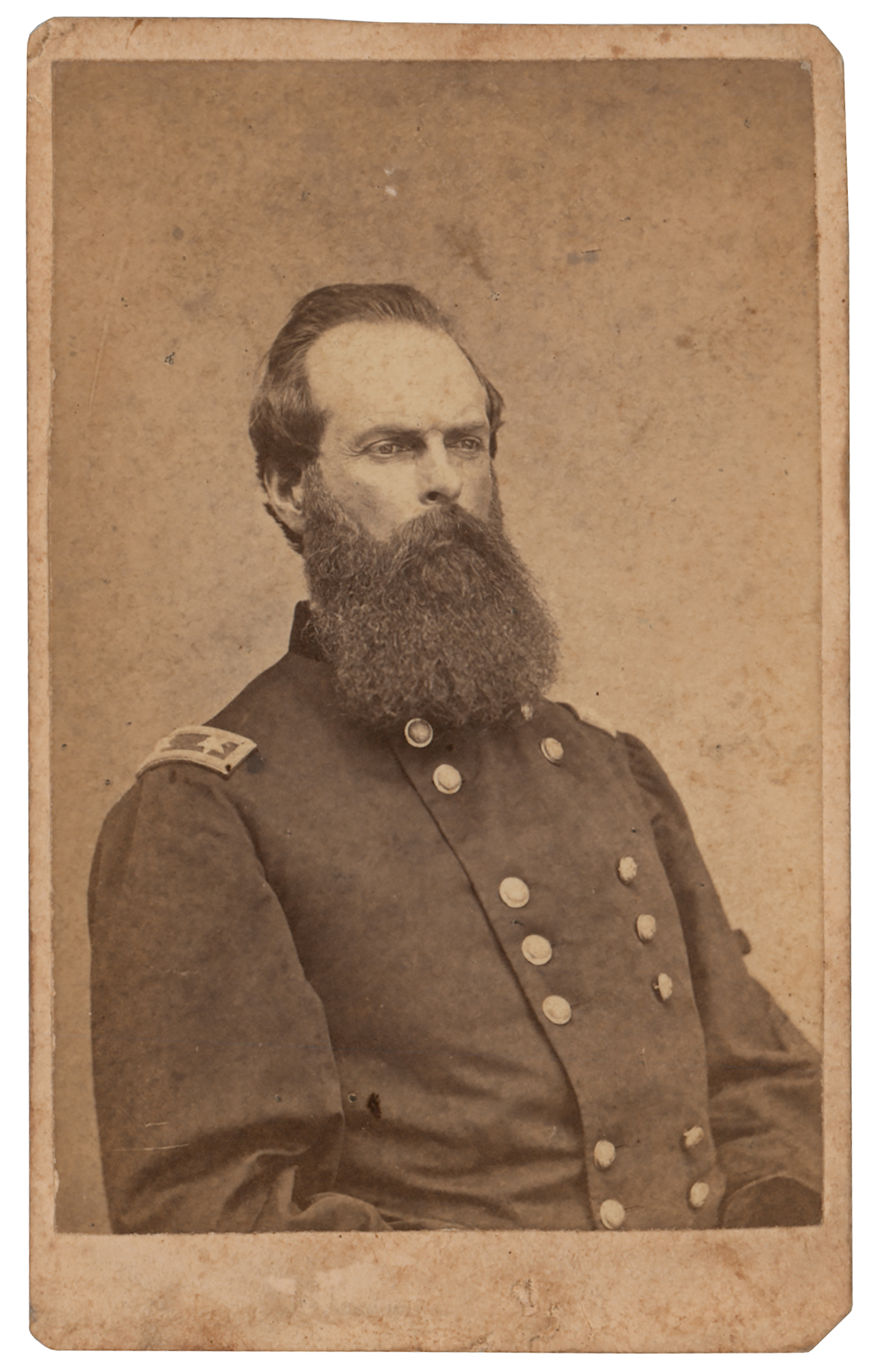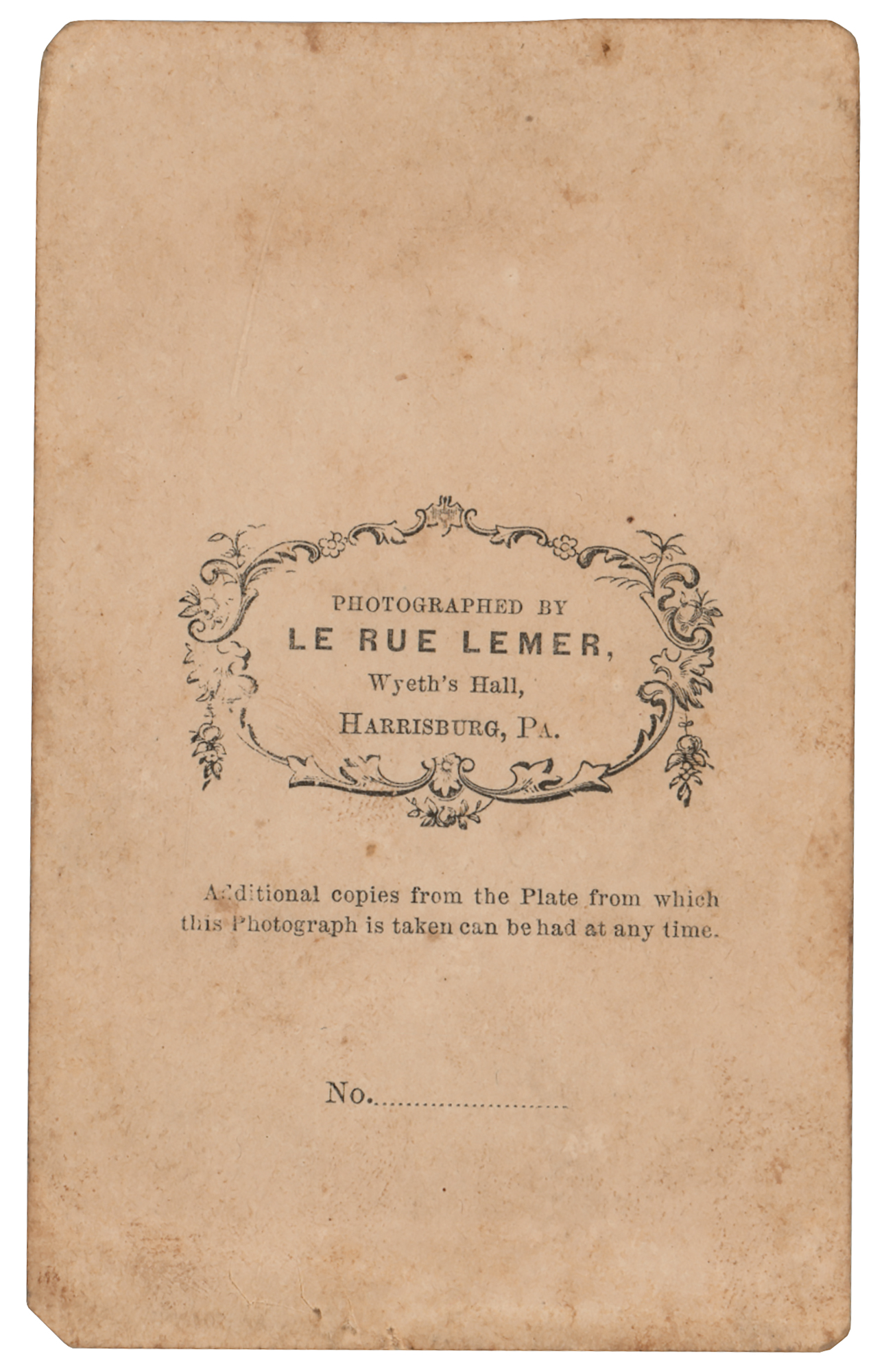 Union general (1819-1873) who was wounded a total of 10 times during his career, and was the first mayor of San Francisco. Appealing unsigned 2.5 x 4 carte-de-visite portrait of John W. Geary in a seated pose, dressed in his Union frock coat, photographed by Le Rue Lemer, Wyeth's Hall, Harrisburg, Pennsylvania. In fine condition, with light soiling and slightly rounded corner tips.