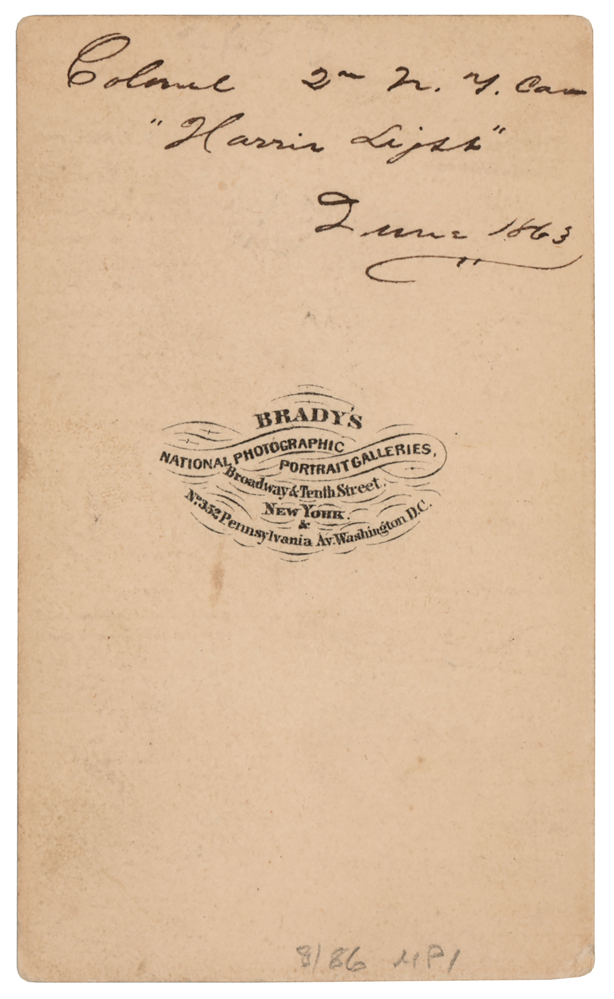 American military officer (1836–1881), who, as a general in the Civil War, earned the sobriquet 'Kill-Cavalry' for his gung-ho disregard for the lives of the soldiers under his command. Uncommon Civil War-dated 2.5 x 4 carte-de-visite full-length portrait of Hugh Judson Kilpatrick in uniform, by Brady of New York, signed in the lower border in black ink, "Jud. Kilpatrick." On the reverse, Kilpatrick adds his rank and unit: "Colonel 2nd N. Y. Cav., 'Harris Light,' June 1863." In fine condition.