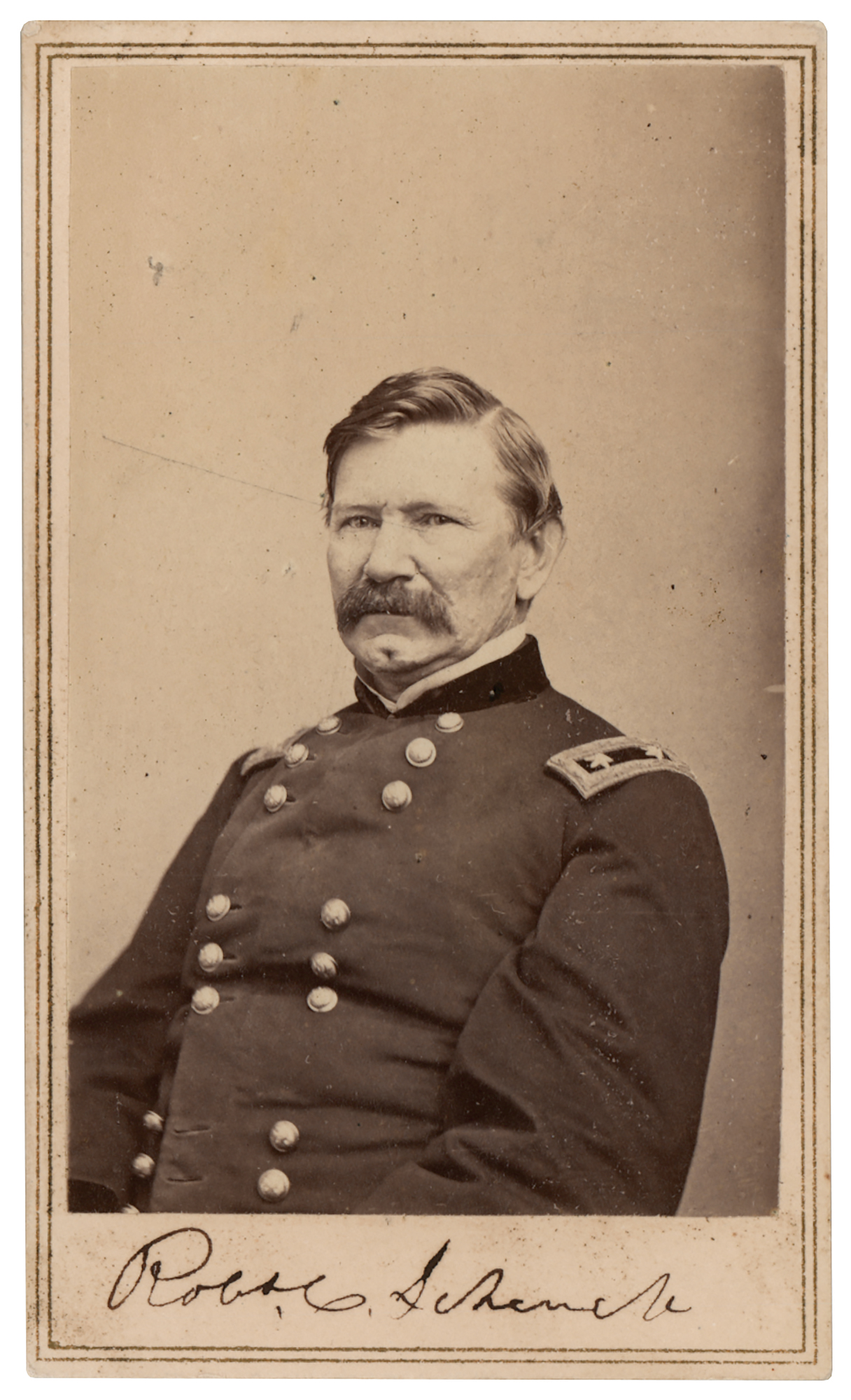 Union Army general (1809-1890) who participated at Bull Run, Battle of Cross Keys, and Jackson's Valley Campaign. Uncommon 2.25 x 4 carte-de-visite photo of Robert Cumming Schenck in uniform, signed below the image in black ink, "Robt. C. Schenck." Published by E. & H. T. Anthony of New York, from a “Photographic Negative in Brady's National Portrait Gallery.” In fine condition.