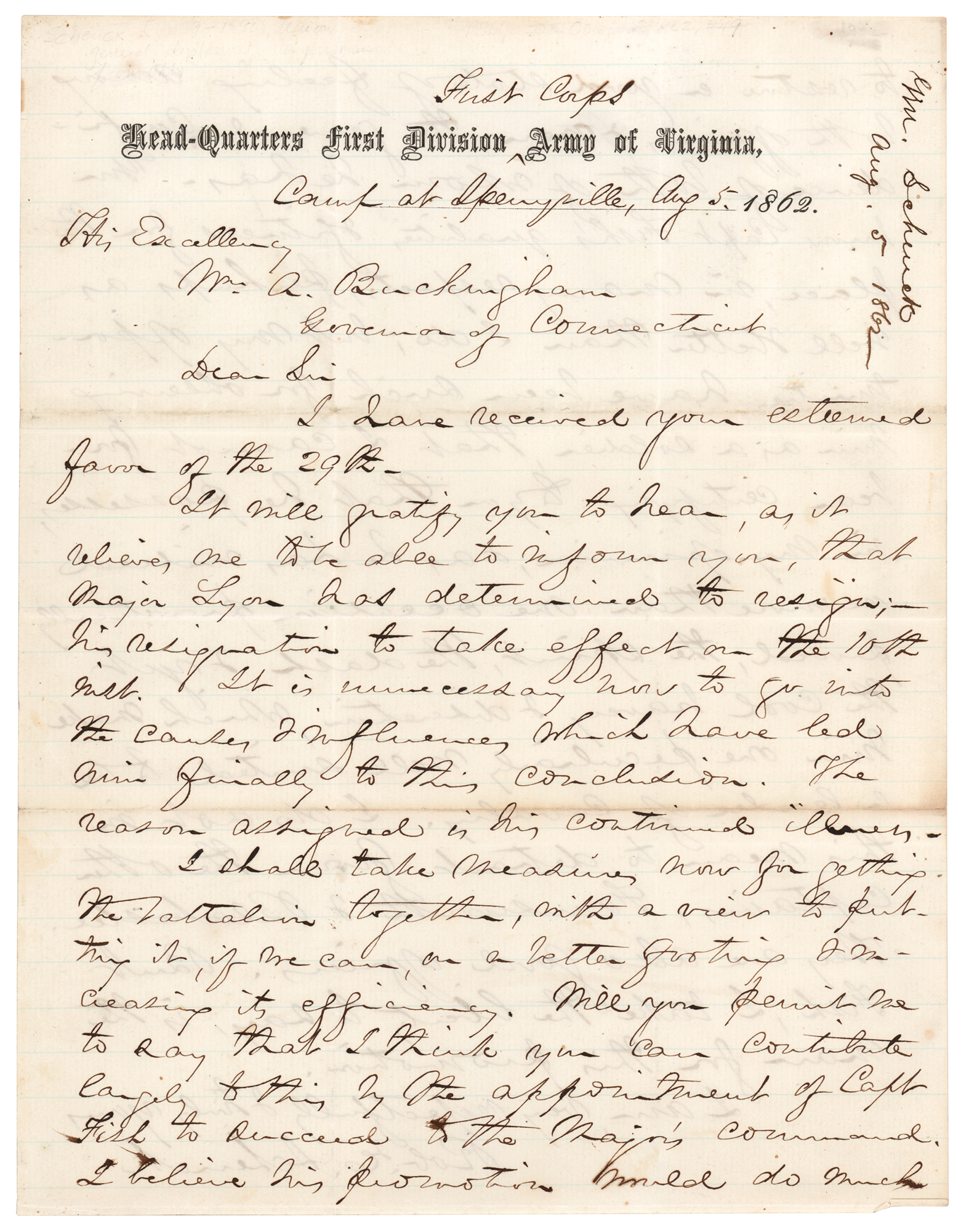 Union Army general (1809-1890) who participated at Bull Run, Battle of Cross Keys, and Jackson's Valley Campaign. Civil War-dated ALS signed “Rob. C. Schenck,” one page both sides, 7.5 x 9.75, Head-Quarters First Division Army of Virginia letterhead, August 5, 1862. Handwritten letter to Governor William A. Buckingham of Connecticut, lobbying for the promotion of Captain Fish. In part: "It will gratify you to hear, as it relieves me to be able to inform you, that Major Lyon has determined to resign; his resignation to take effect on the 10th inst. It is unnecessary now to go into the causes & influences which have led him finally to this conclusion. The reason assigned is his continued illness.