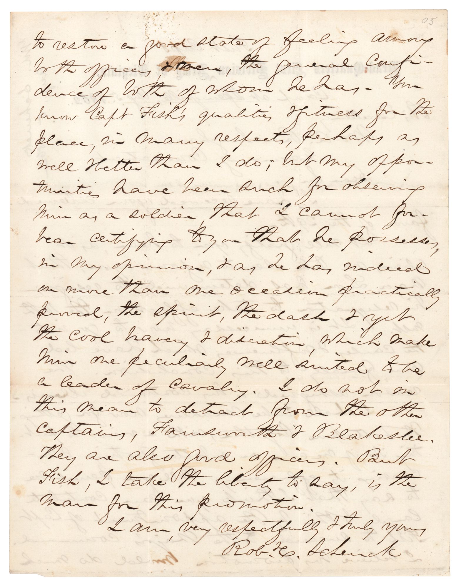 I shall take measures now for getting the battalion together, with a view to putting it, if we can, on a better footing & increasing its efficiency. Will you permit me to say that I think you can contribute largely to this by the appointment of Capt. Fish to succeed the Major's command. I believe his promotion would do much to restore a good state of feeling among both officers & men, the general confidence of both of whom he has." In fine condition.