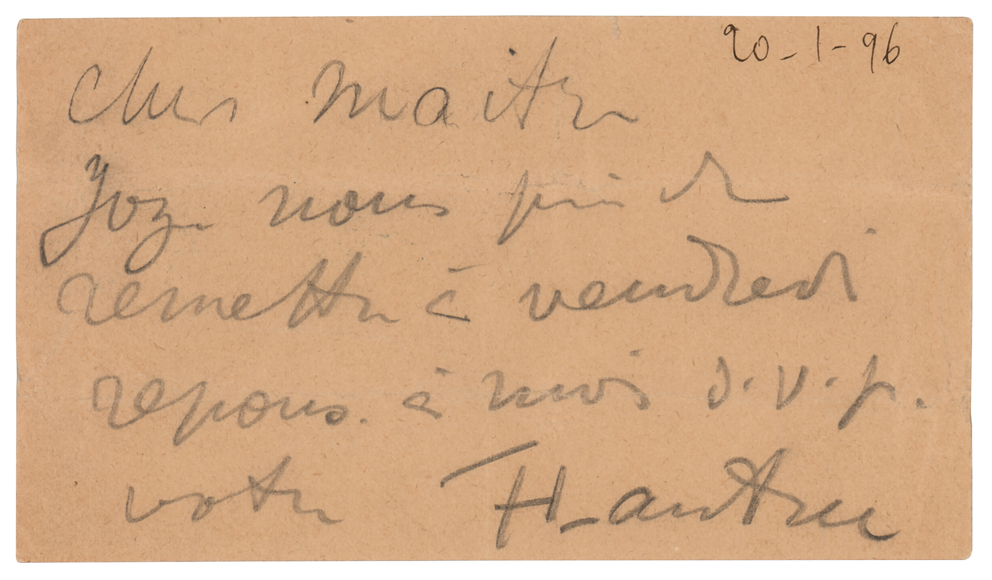 ALS in pencil, in French, signed “H-Lautrec,” one page, 5 x 3, January 20, 1896. Handwritten 'carte-telegramme' to Édouard Dujardin, referring to his friend, Maurice Joyant. In part (translated): "Joy. asks you to give me a response by Friday please." Addressed on the reverse in Toulouse-Lautrec's hand. Joyant was a writer and director of a gallery where Lautrec had an exhibition in January 1896; he later painted Joyant's portrait. In fine condition.