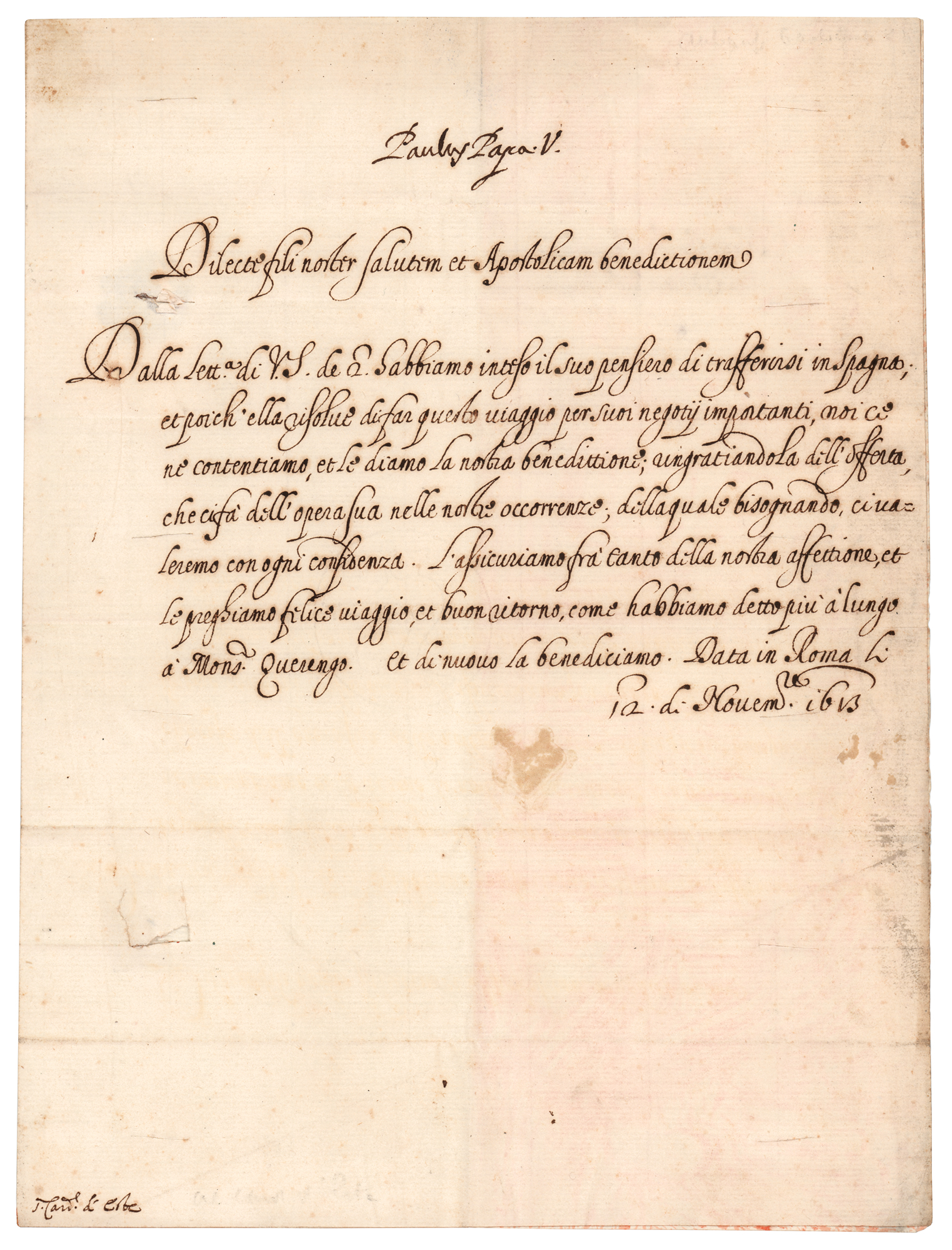 Born Camillo Borghese in Rome in 1550, Paul V reigned as pope from 1605 until his death in 1621. He financed the completion of St. Peter's Basilica, and in 1611 he honored Galileo Galilei as a member of the Papal Accademia dei Lincei and supported his discoveries. Rare LS in Italian, signed “Paulus Papa V,” one page, 7.75 x 10.25, November 12, 1613. Addressed from Rome, an untranslated letter from Pope Paul V, who bestows an apostolic blessing. In very good to fine condition, with scattered soiling and small stains, and a small tear to the lower blank area.