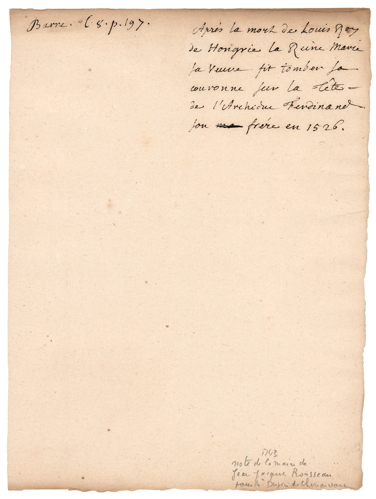 Important Swiss-French philosopher and writer (1712-1778) who held that the individual is essentially good but usually corrupted by society. Rare autograph manuscript in French, unsigned, no date, penned boldly by Jean-Jacques Rousseau on an off-white 7.25 x 10 sheet. The page derives from his unpublished work relating to the history of women which he prepared between 1746-51 for his benefactress Louise Marie Madeleine Dupin. The untranslated text contains an interesting reference to Louis II of Hungary and his queen, Mary of Austria. In the upper left corner, Rousseau has added “Barre L. 8. p. 197.” In fine condition.