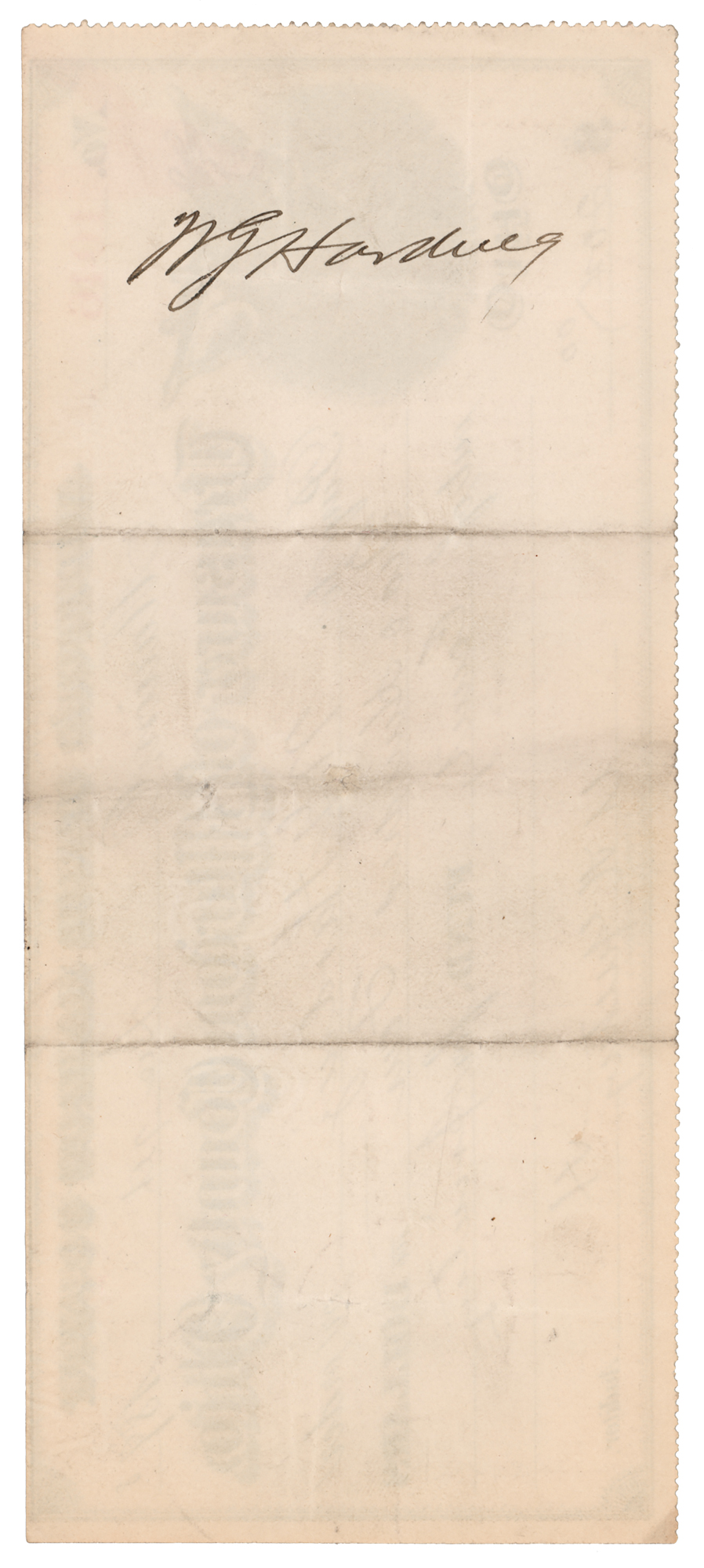 Treasurer of Marion County, Ohio, auditor's office check, 7.75 x 3.25, filled out in another hand and signed by the county's auditor, payable to W. G. Harding for $204, December 7, 1898, endorsed on the reverse in ink, "W. G. Harding." In fine condition.