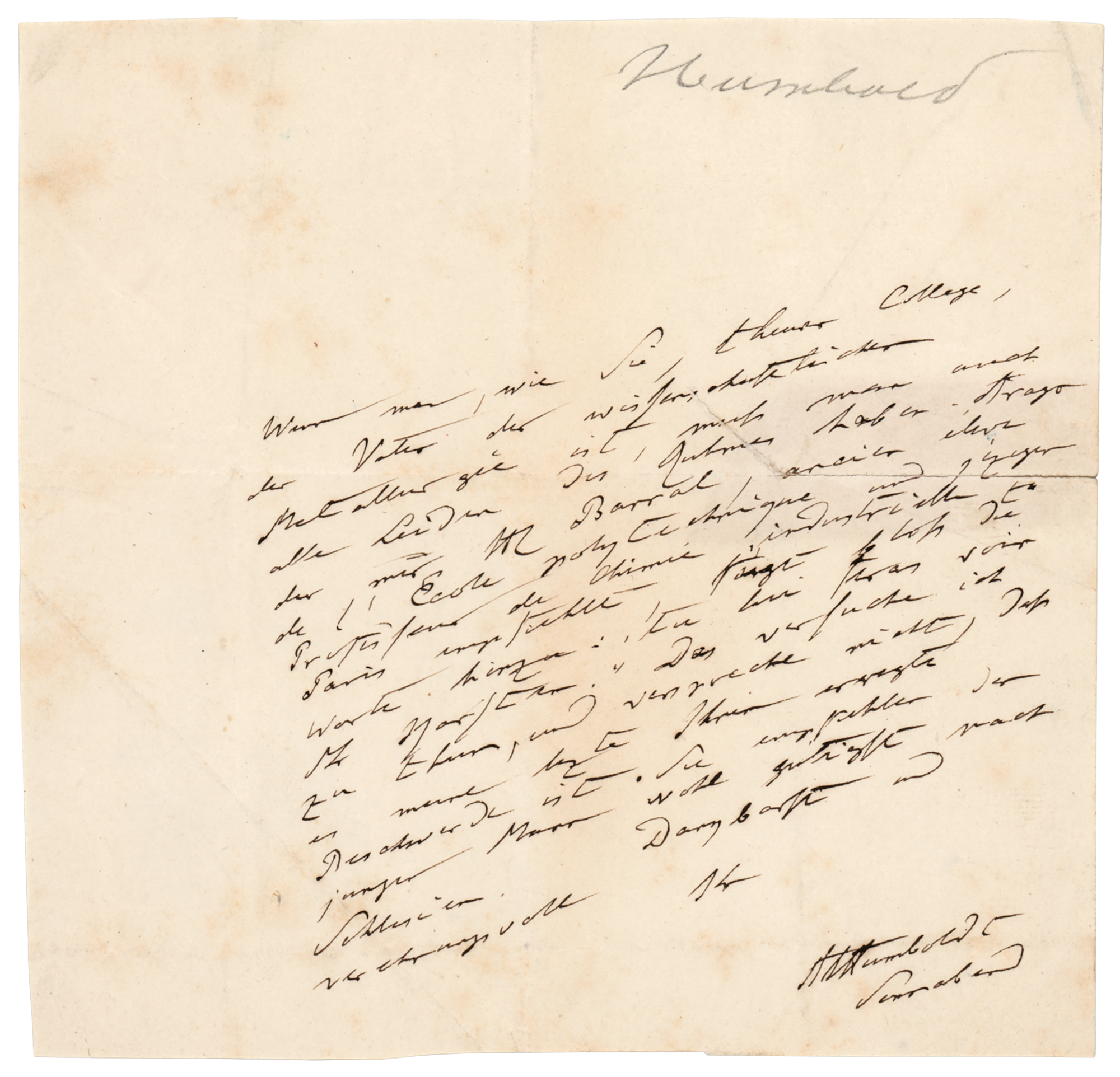 German naturalist and explorer (1769-1859) who wrote Kosmos, a massive five-volume study which attempted to unify the various branches of man's knowledge. ALS in German, signed “A. v. Humboldt,” one page, 4.75 x 4.75, no date. An untranslated handwritten letter from Alexander von Humboldt. In fine condition, with faint staining.