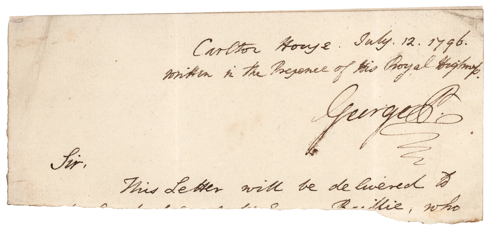 Ink signature as Prince of Wales, "George P.,” on an off-white 7.5 x 3.25 sheet clipped from the top of a letter, which reads, in part: "Carlton House, July 12, 1796, written in the Presence of His Royal Highness." In fine condition.