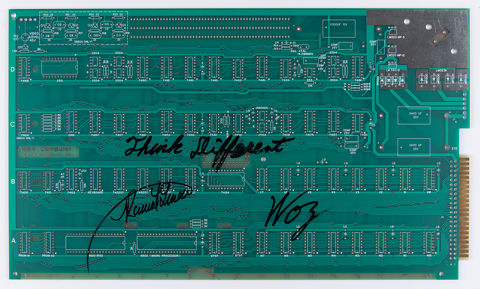 Desirable replica of the Apple-1 Computer circuit board, 15.5 x 9.25, signed in black felt tip by two of Apple's co-founders, "Think Different! Woz" and "Ronald G. Wayne." In very fine condition.