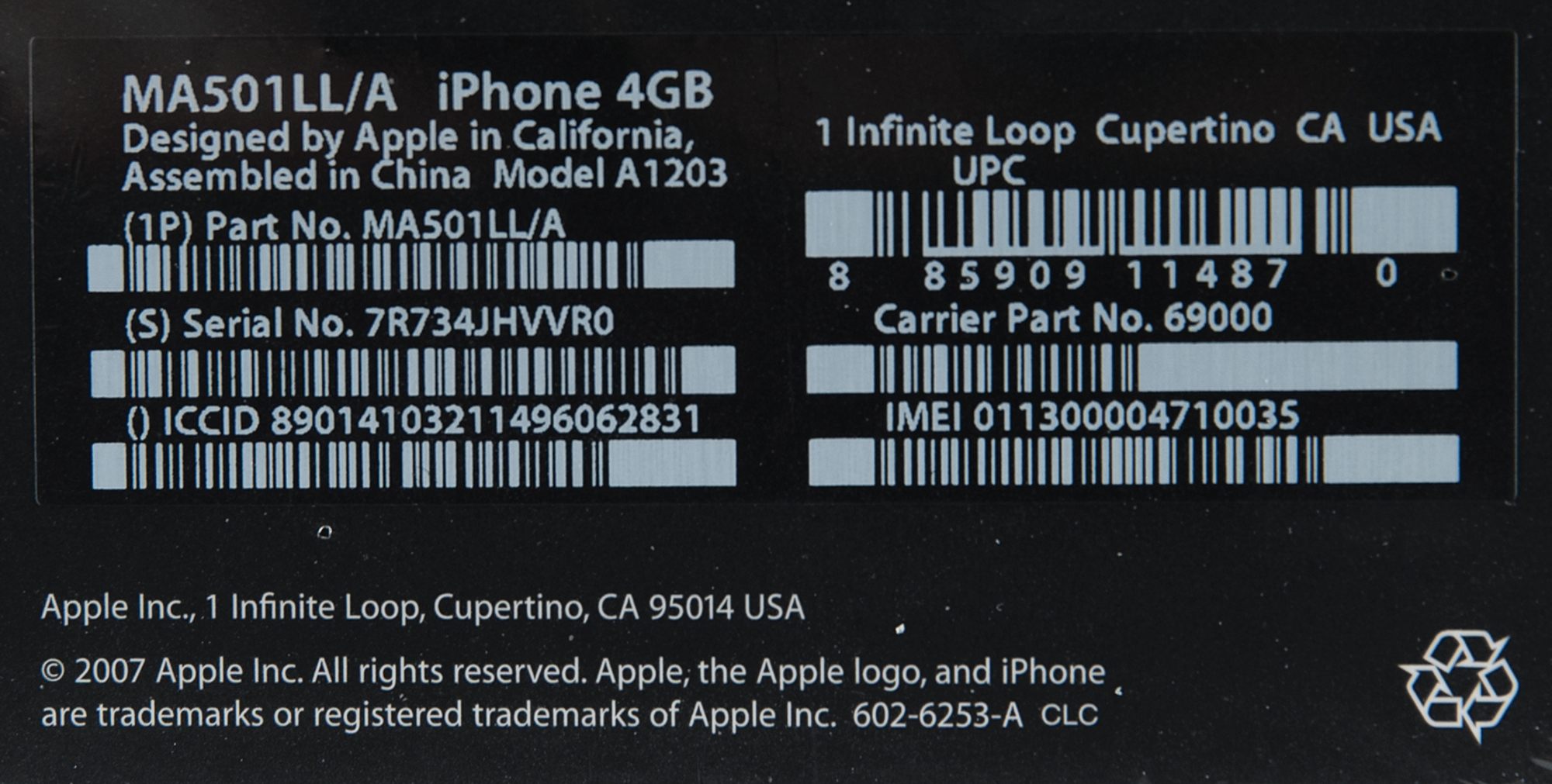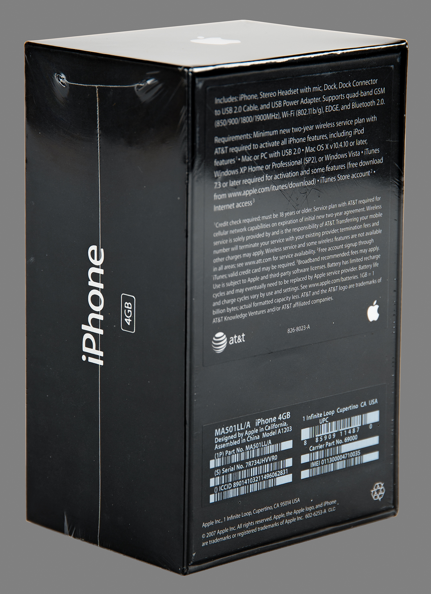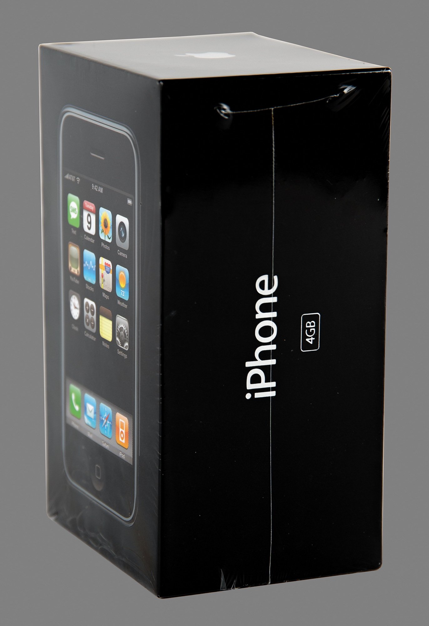 Exceedingly rare unopened first generation, first release original Apple iPhone, Model A1203, Part No. MA501LL/A (4GB), Serial No. 7R734JHVVR0. The box features a life-size image of the iPhone with twelve icons on the screen, indicating that it is from the earliest production (2007); a 13th icon, for iTunes, came later in the year. The 4GB iPhone is the rarest of all original iPhones, as it was discontinued by Apple on September 5, 2007, just over two months after the pioneering product's debut. Priced at $499, the 4GB iPhone model encountered lackluster sales as most consumers opted for the $100 upgrade to double its storage capacity to 8GB. In brand new, factory-sealed condition.