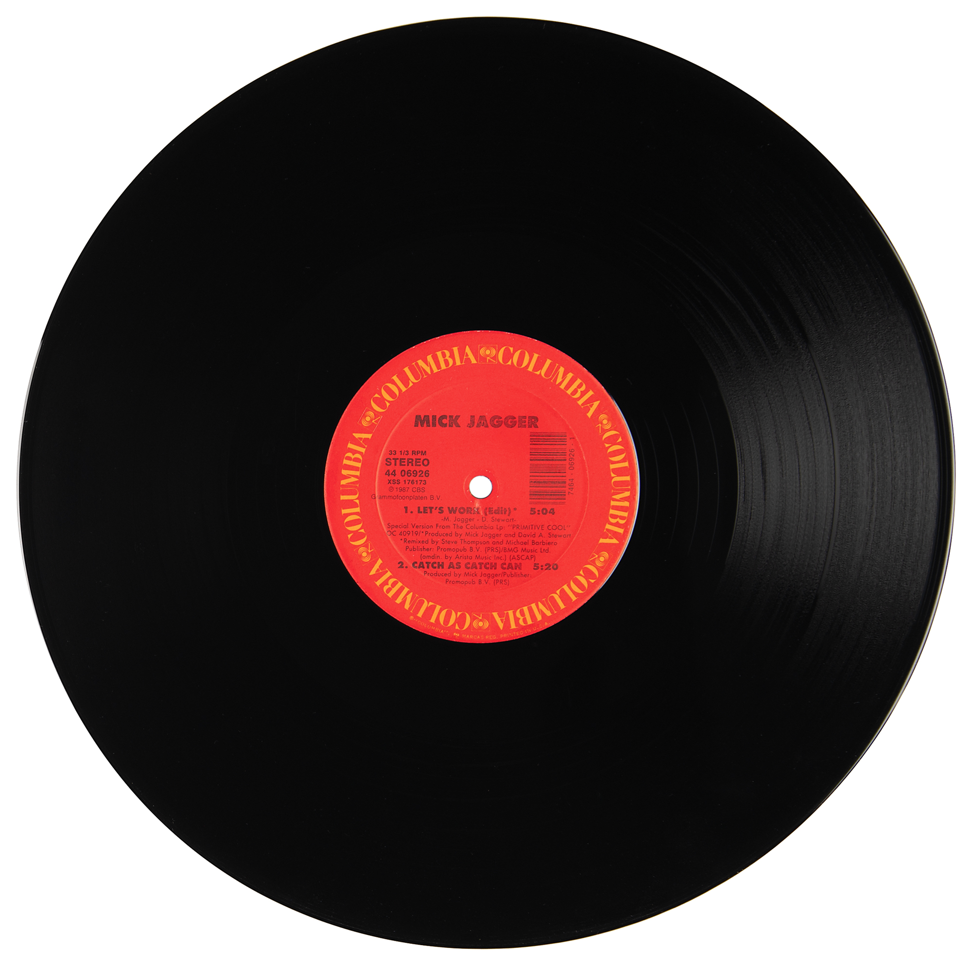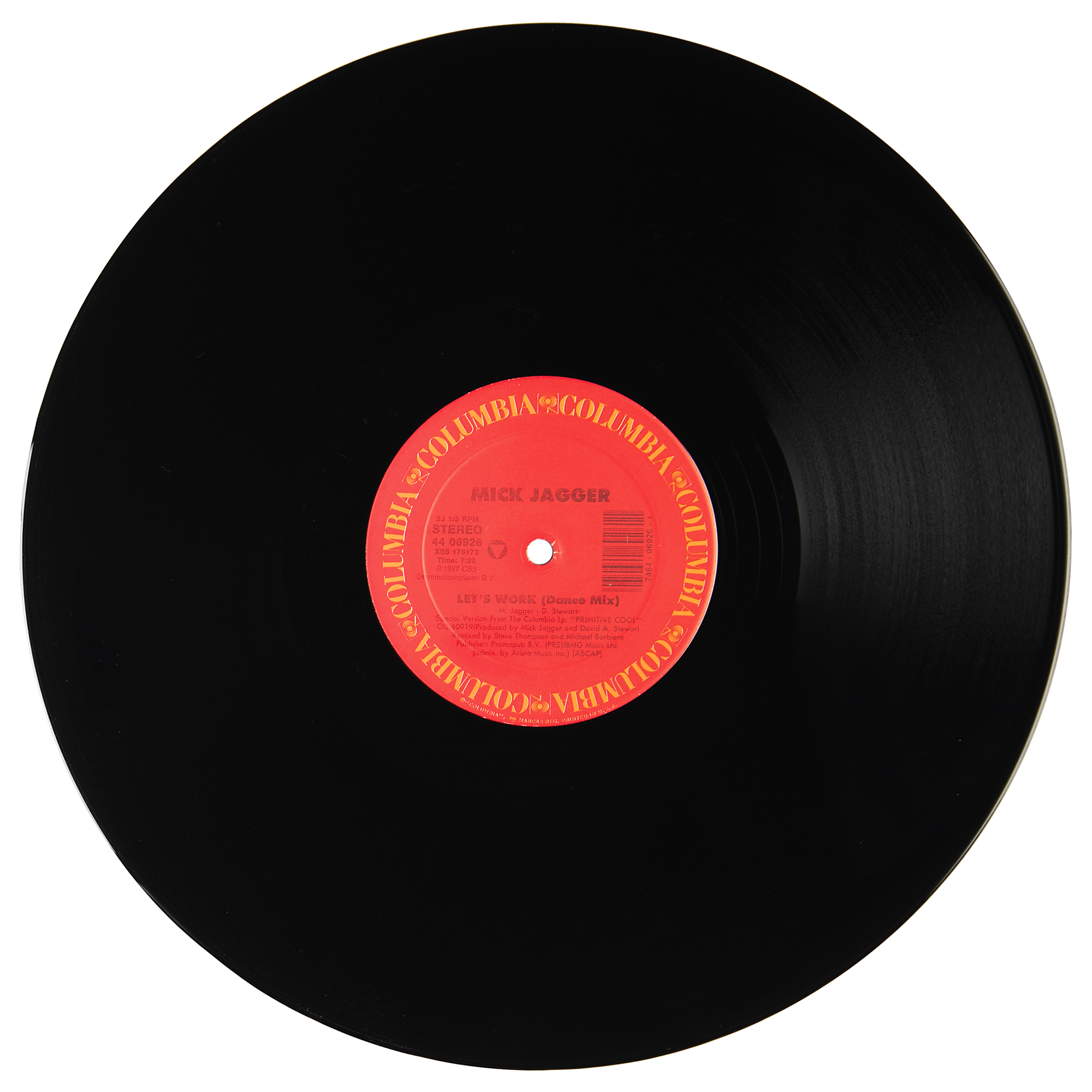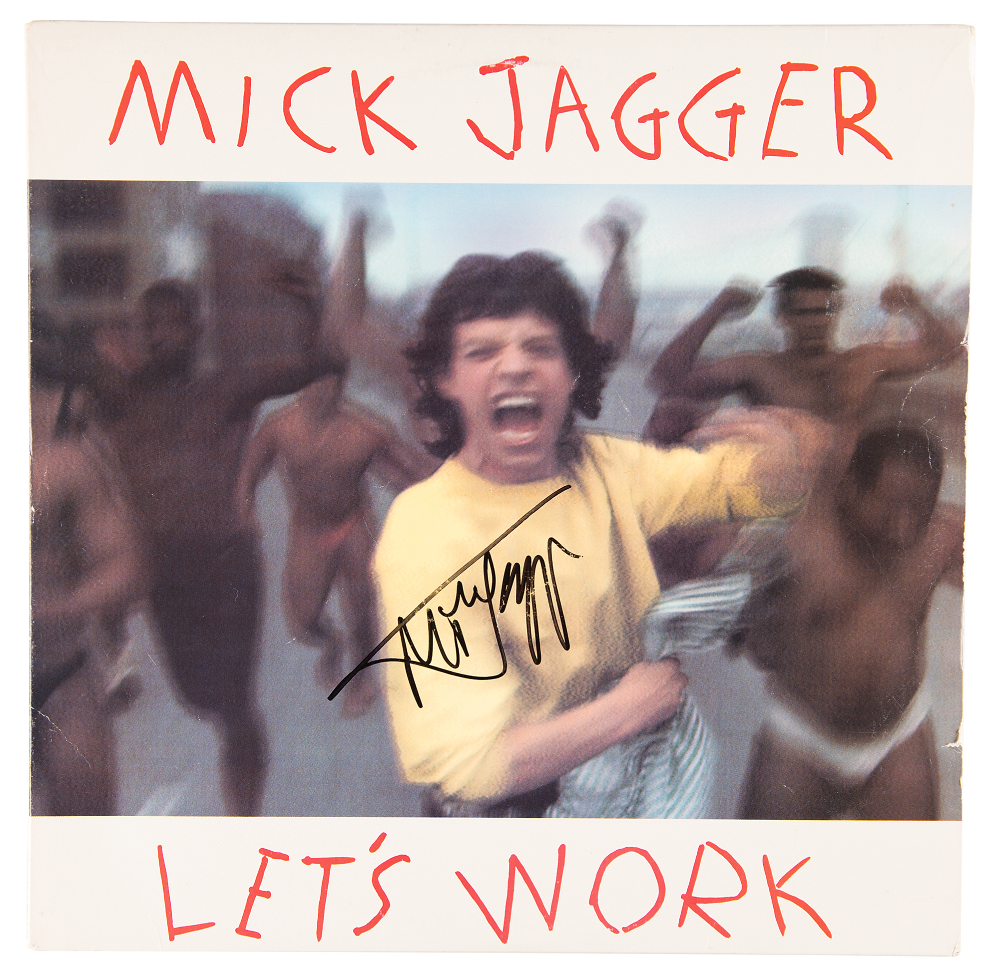 Promotional 12-inch EP for 'Let's Work / Catch as Catch Can' by Mick Jagger, signed on the front cover in black felt tip. In fine condition, with creases to edges and a couple of small tears. The collectible vinyl record, also included, appears to be in pristine playing condition.