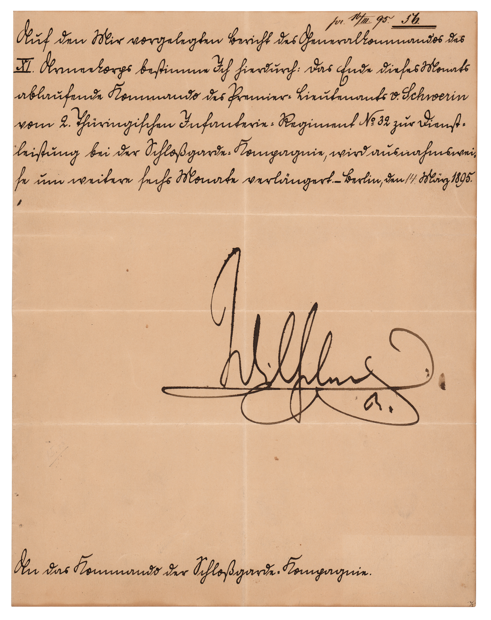 Last German Emperor (Kaiser) and King of Prussia (1859–1941) who reigned from June 15, 1888 until his abdication on November 9, 1918. He was the eldest grandchild of Queen Victoria of the United Kingdom and related to many monarchs and princes of Europe, most notably, King George V of the United Kingdom and Emperor Nicholas II of Russia. Manuscript DS in German, signed “Wilhelm R.,” one page, 8.25 x 10.5, March 14, 1895. An untranslated document boasting a huge, bold ink signature of Kaiser Wilhelm II. In fine condition, with intersecting folds.
