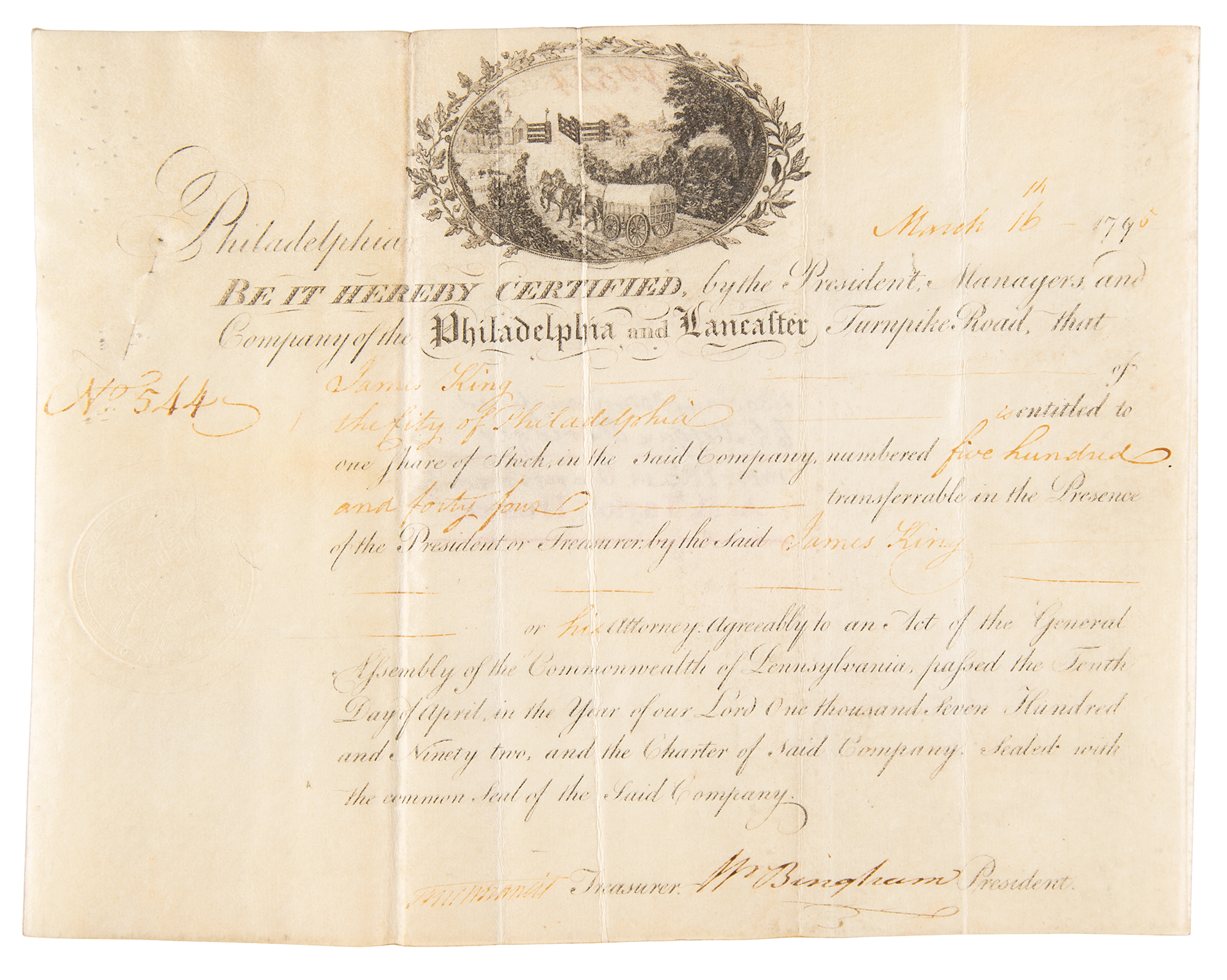 American statesman (1752-1804) who served in the Continental Congress from 1786 to 1788 and in the United States Senate from 1795 to 1801, including a five-month stint as president pro tempore. Partly-printed vellum DS, signed “Wm. Bingham,” one page, 9.5 x 7.5, March 16, 1795. Stock certificate issued to James King for one share of stock in the Company of the Philadelphia and Lancaster Turnpike Road, with the upper section featuring an engraved vignette of a horse-drawn wagon on the aforenamed road. Signed at the conclusion by William Bingham as president, and countersigned by its treasurer, Tench Francis, Jr., who served as the first cashier of the Bank of North America. In fine condition, with multiple vertical folds.