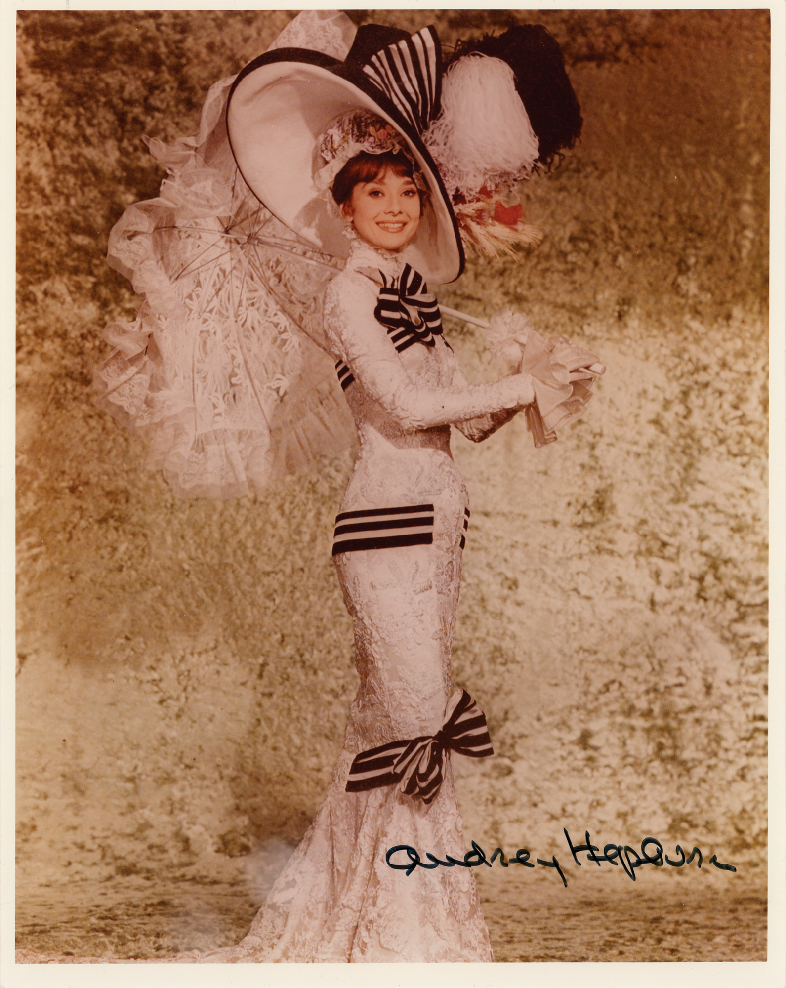 Color glossy 8 x 10 photo of Audrey Hepburn dressed as Eliza Doolittle from My Fair Lady, showing the actress wearing her iconic ascot race dress and matching hat, signed nicely in black felt tip. In fine condition. Accompanied by a full letter of authenticity from JSA.